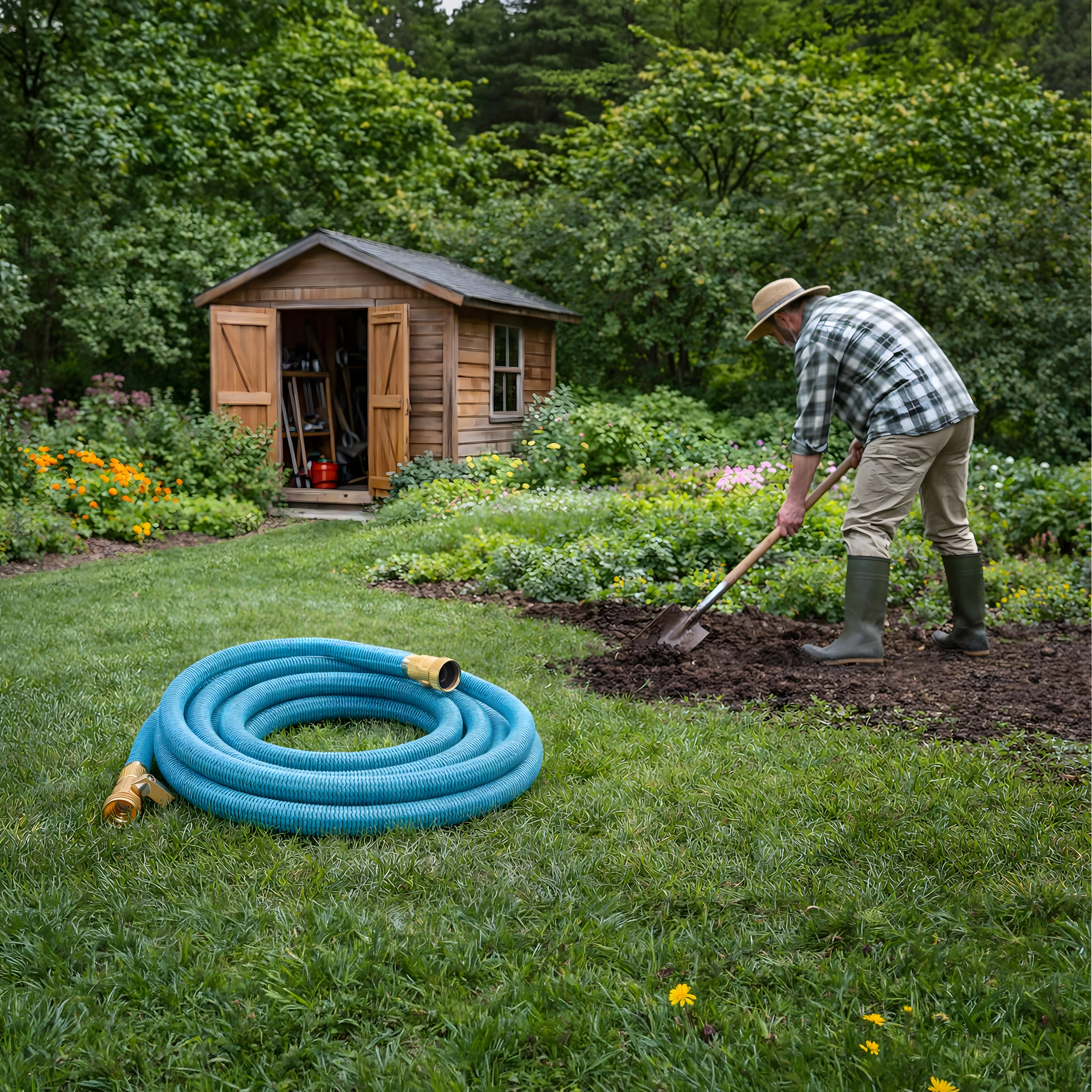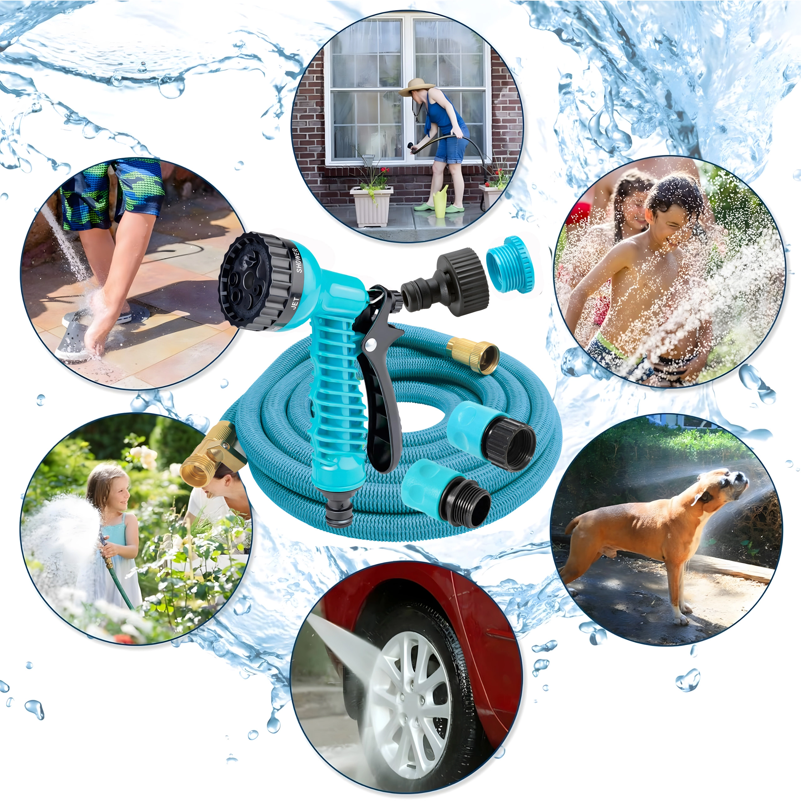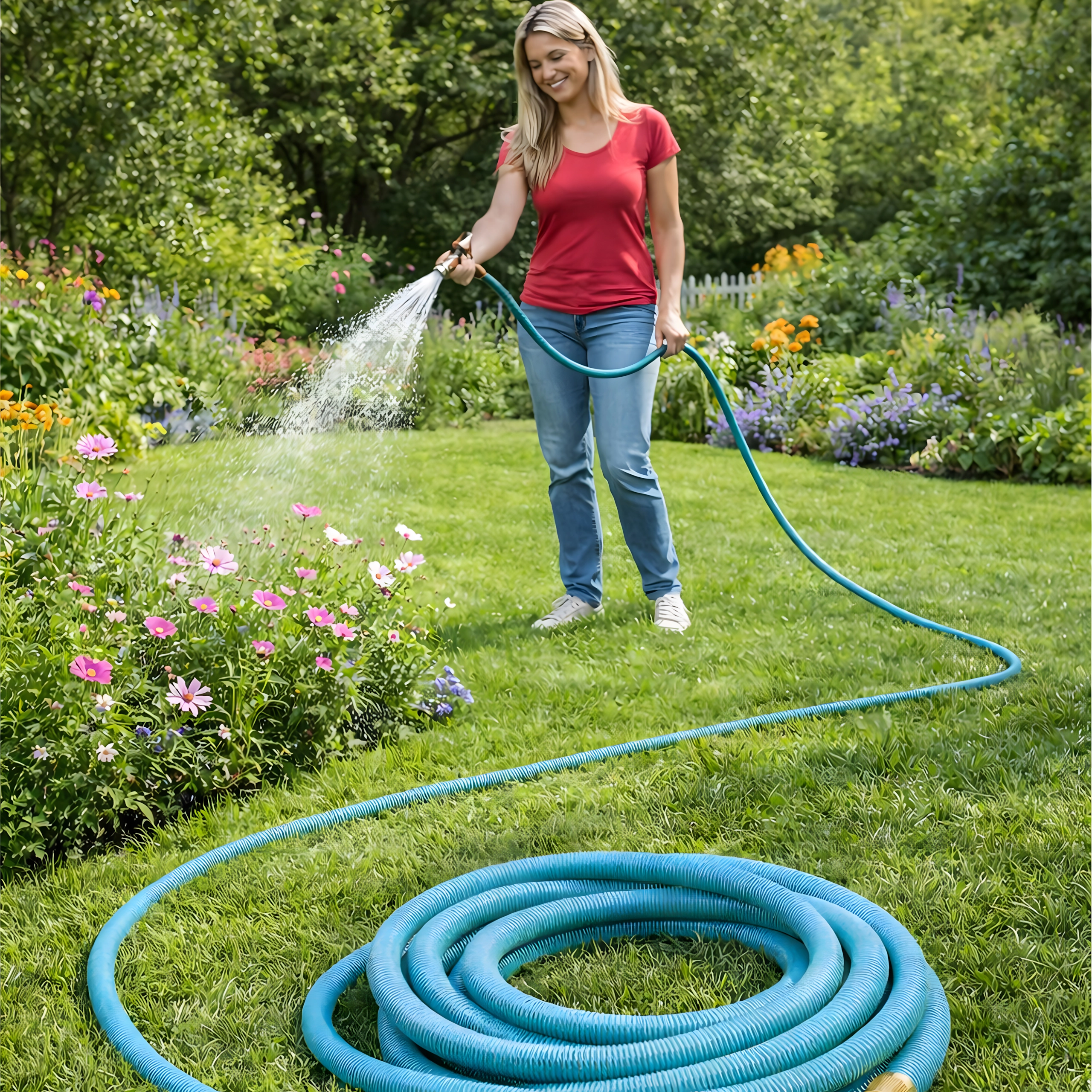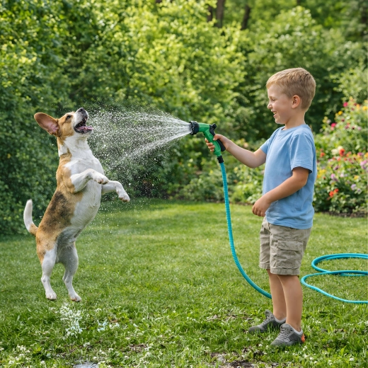 A csomag része egy többüzemmódú permetezőpisztoly finom köddel, zuhannyal és erős sugárral – ideális ágyások öntözéséhez, autómosáshoz vagy teraszok leöblítéséhez. A tömlő könnyű, egyszerűen hordozható, és tartóra vagy dobozba is könnyen elhelyezhető.