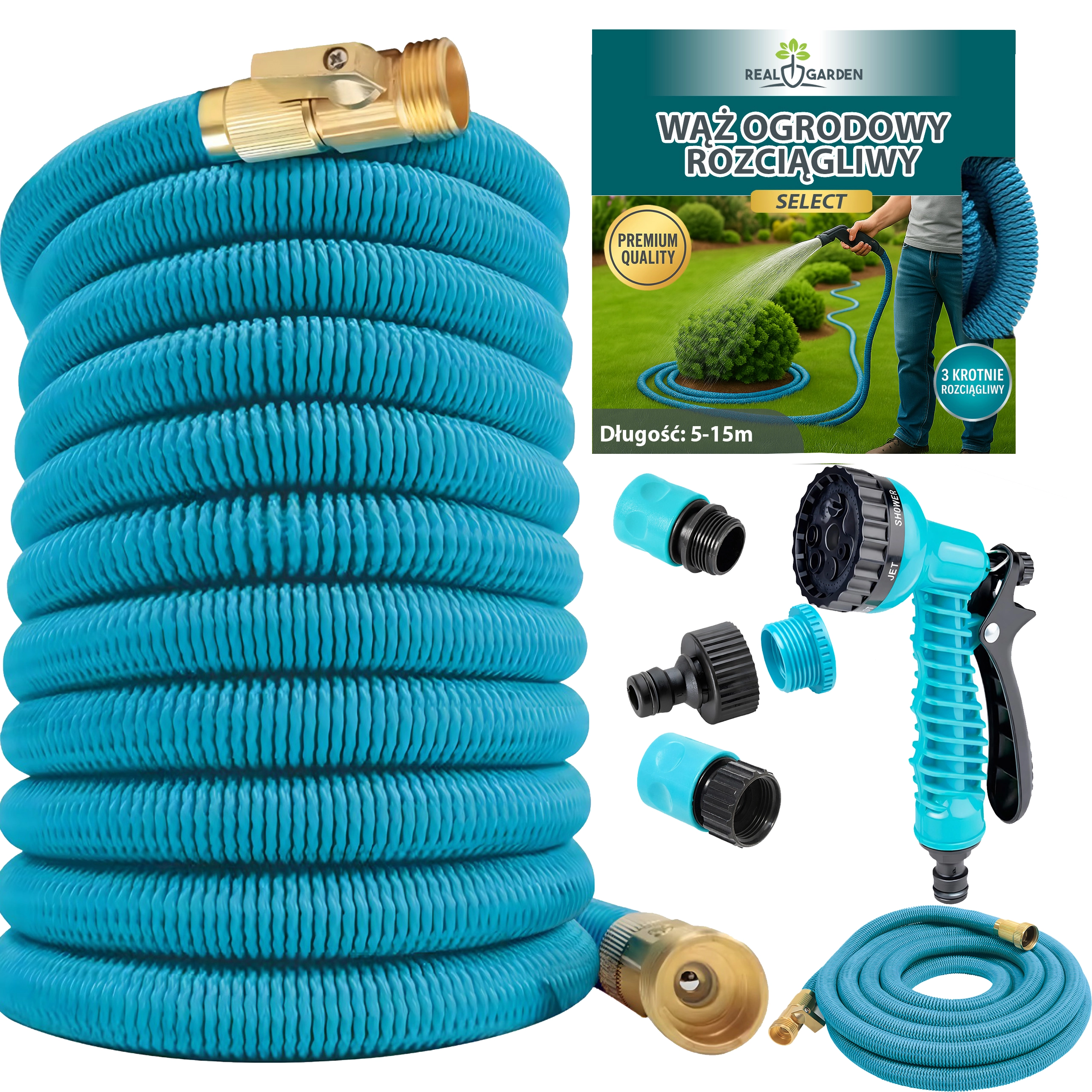 Könnyű, nyújtható kerti tömlő 5–15 m hosszal, 1/2" és 3/4" fém csatlakozókkal, valamint többfunkciós permetezőpisztollyal öntözéshez és tisztításhoz. Tartós szövött köpenyréteggel, nem csomózódik, könnyen tárolható, és a szeleppel gyorsan szabályozható a vízhozam.