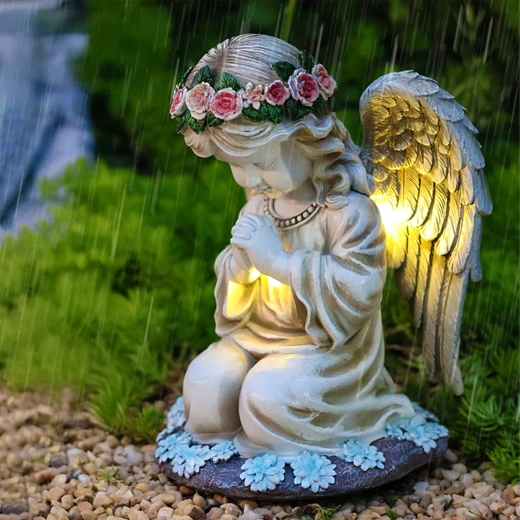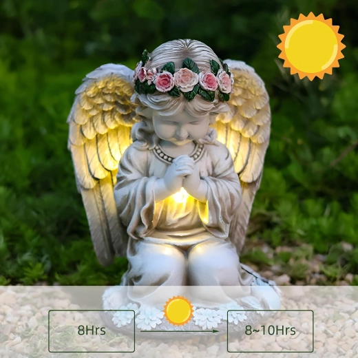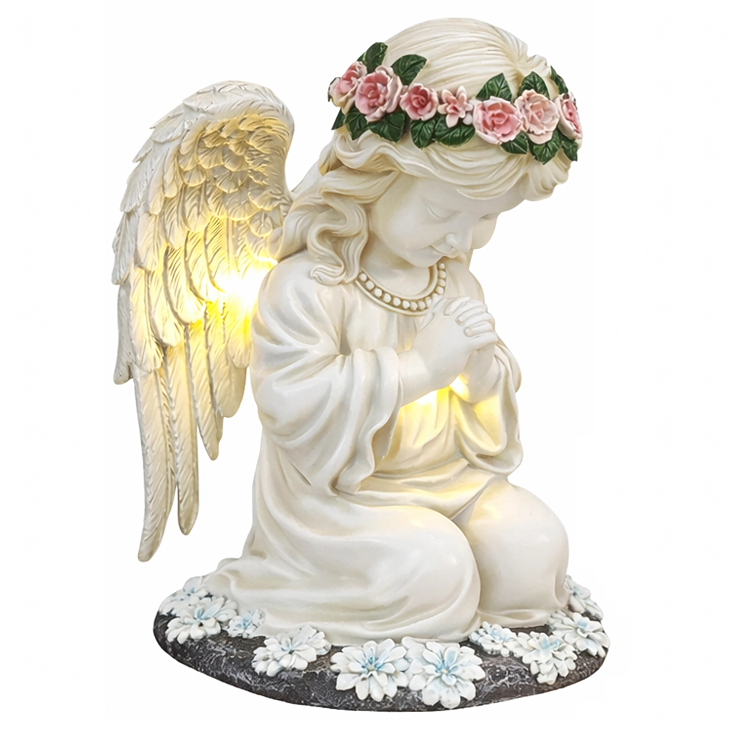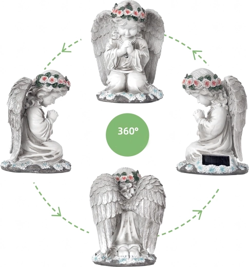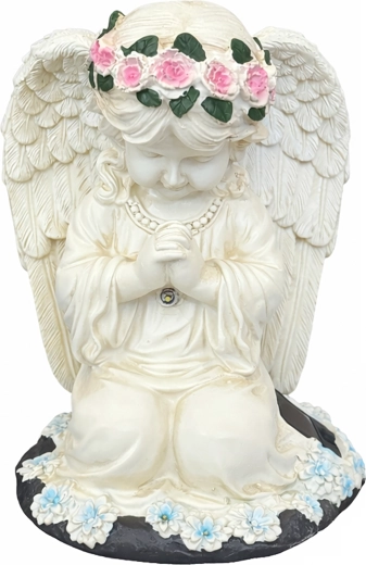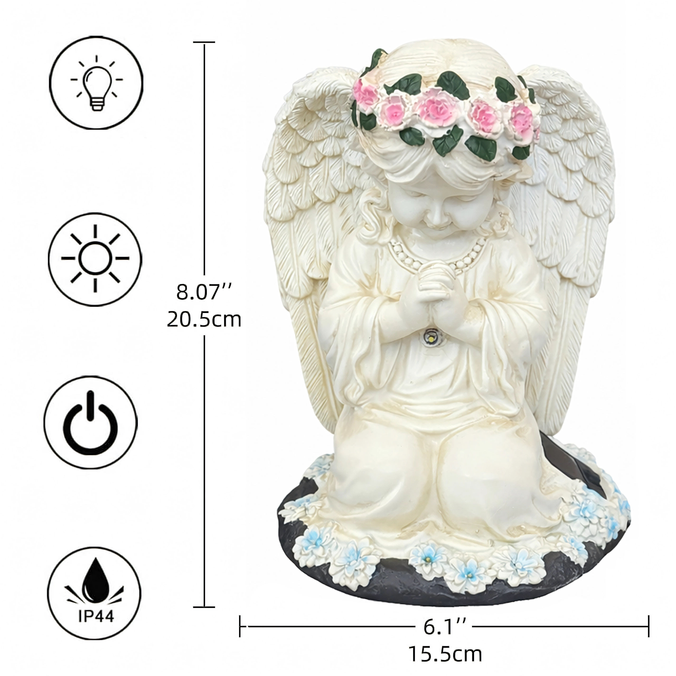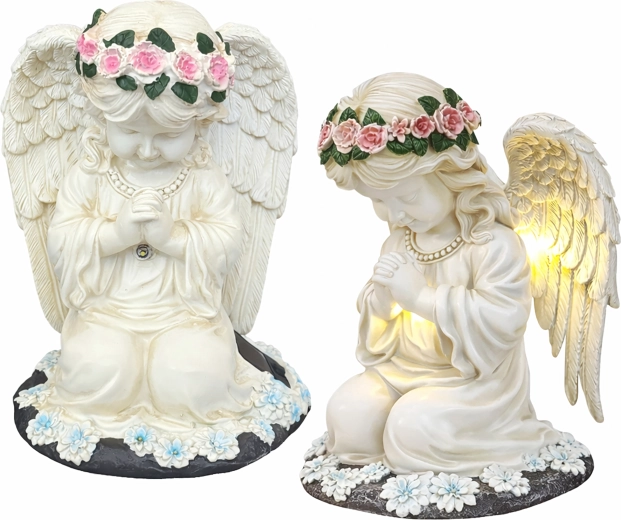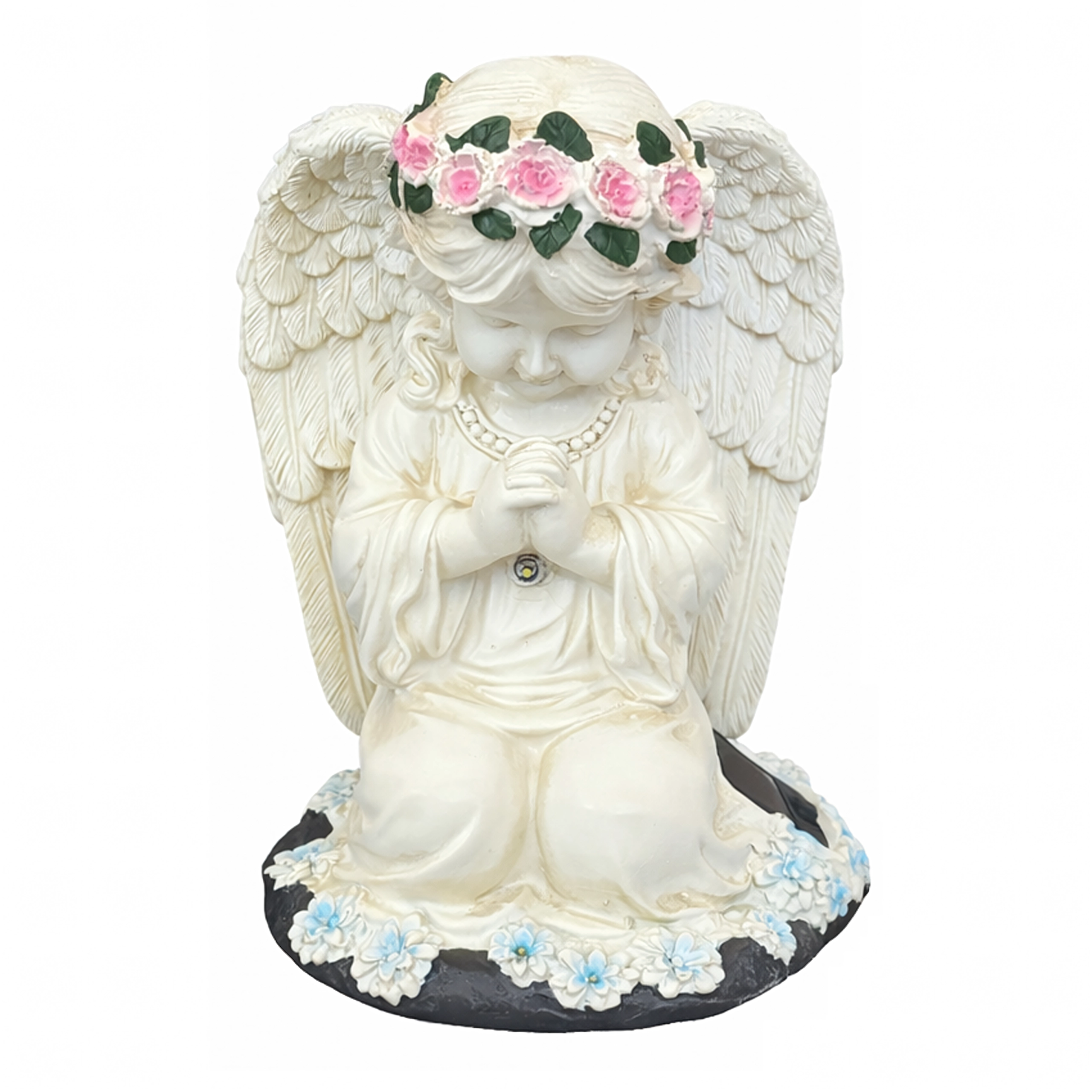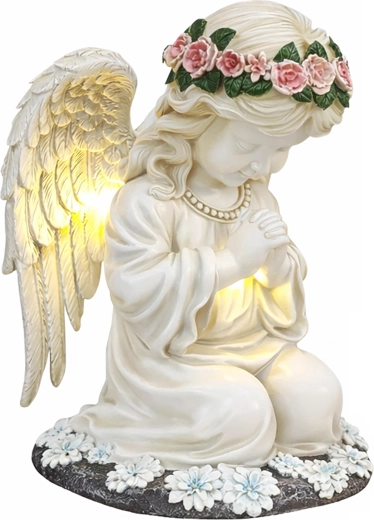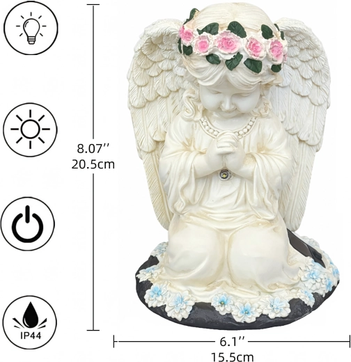 A részletgazdagon kidolgozott, térdelő angyalszobor virágkoszorúval és gazdagon formált szárnyakkal egész éves kültéri használatra készült. A beépített meleg fényű LED-ek finoman megvilágítják a szárnyakat és a ruhát, nyugtató esti fényt teremtve kerti ösvényekhez, ágyásokhoz és emlékhelyekhez. A napelemnek köszönhetően nappal tölt, sötétedéskor pedig automatikusan felkapcsol.