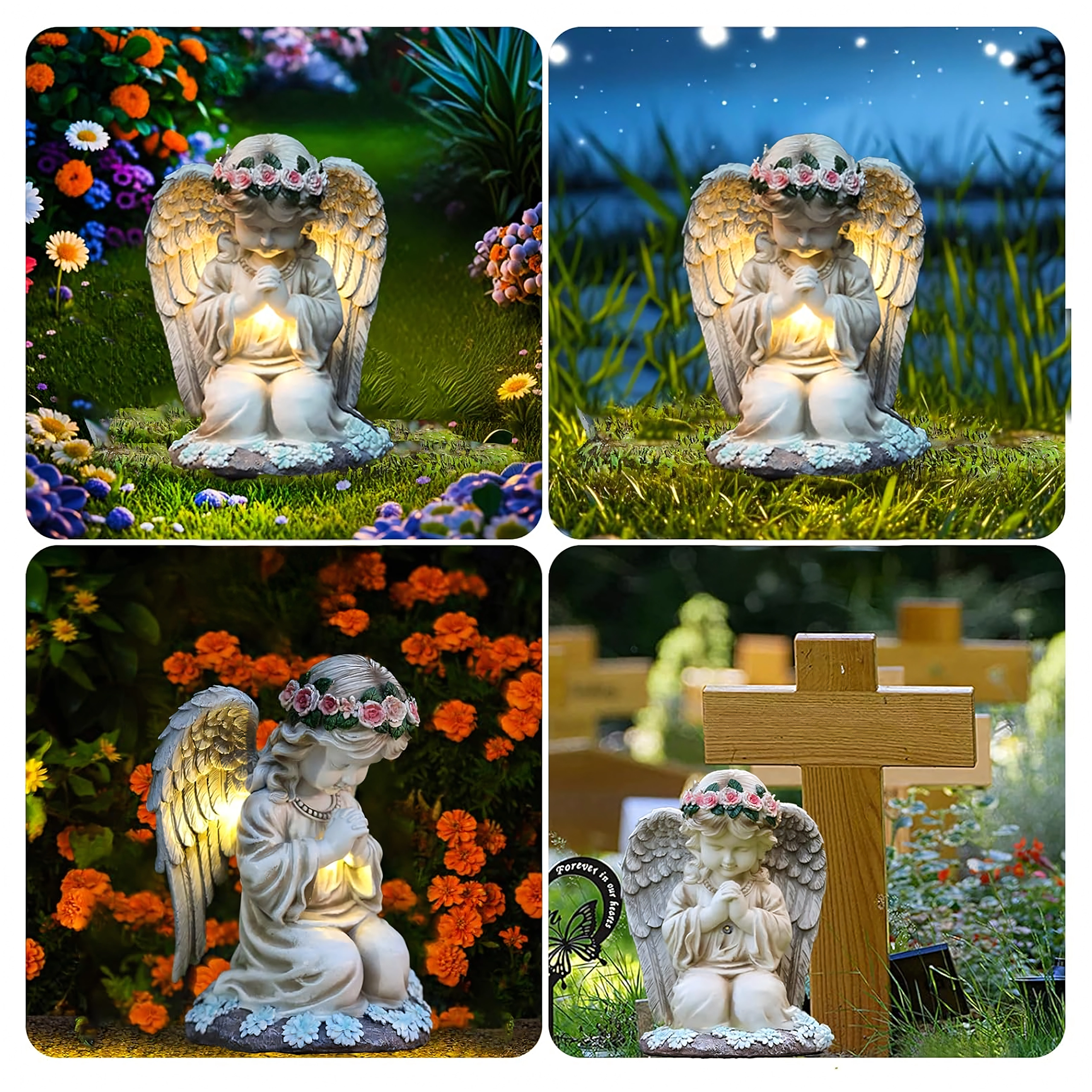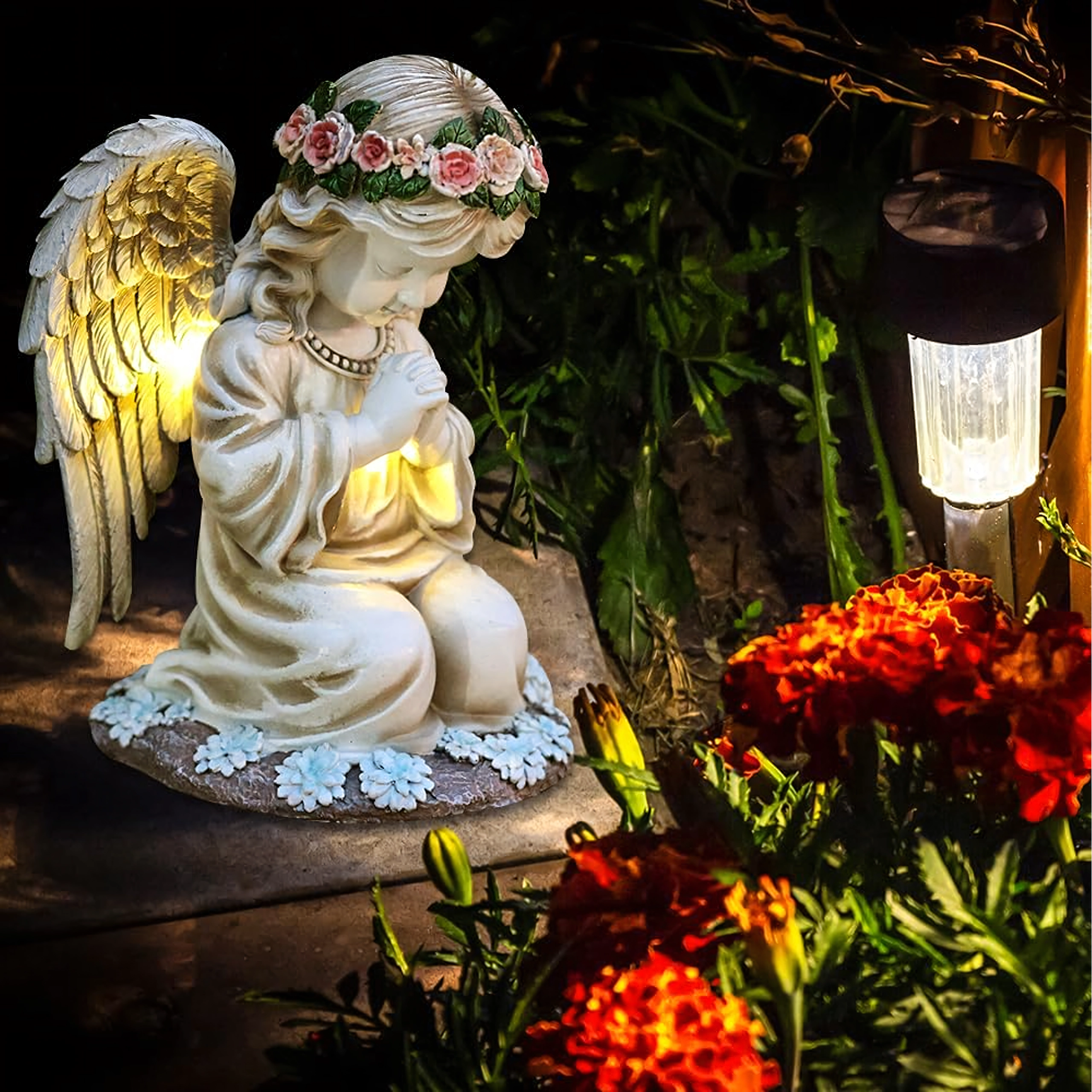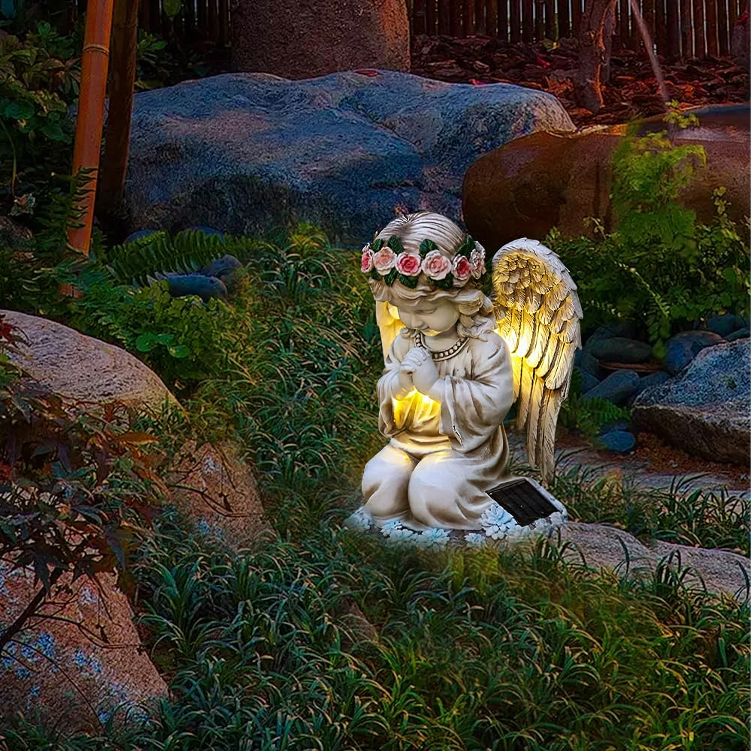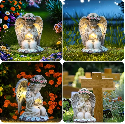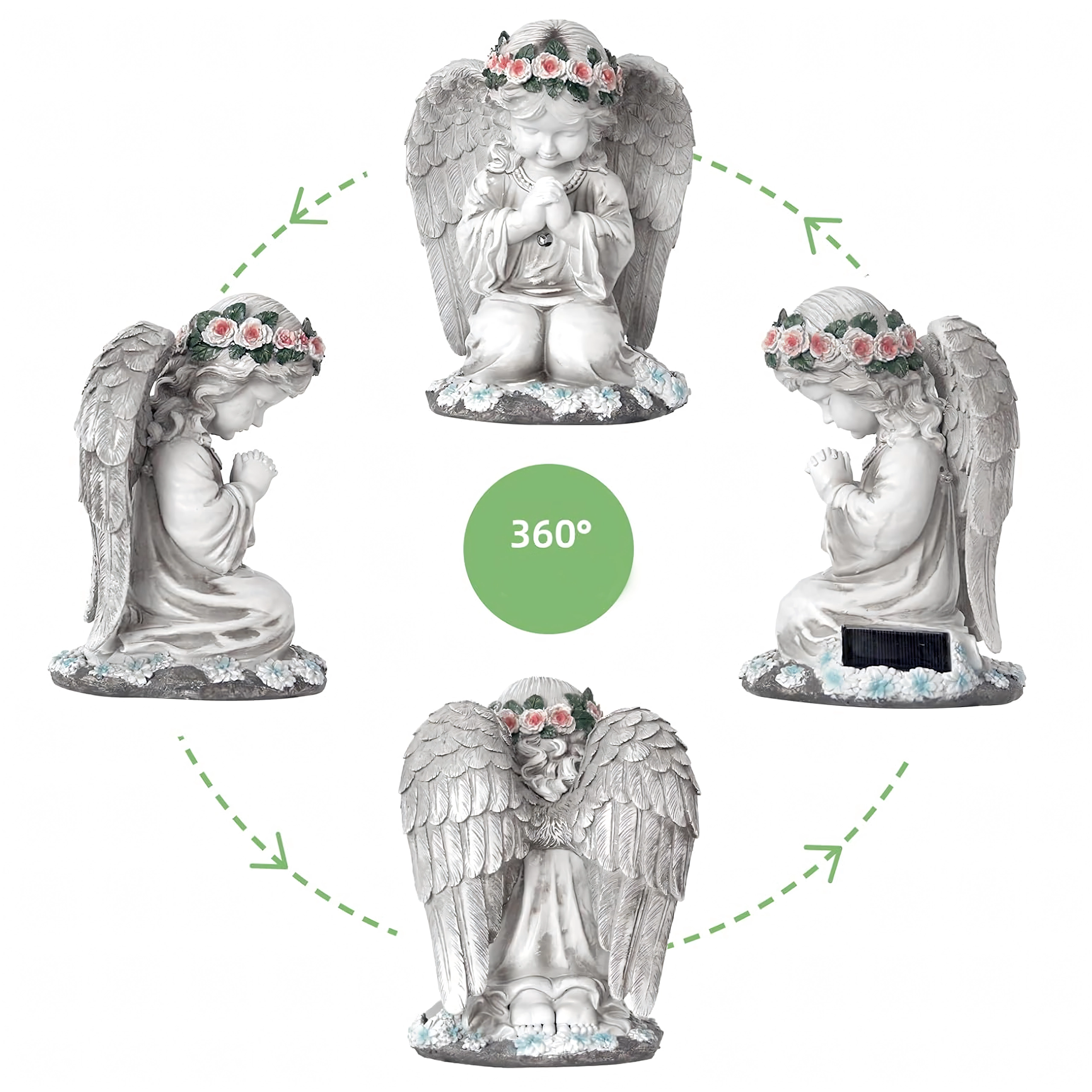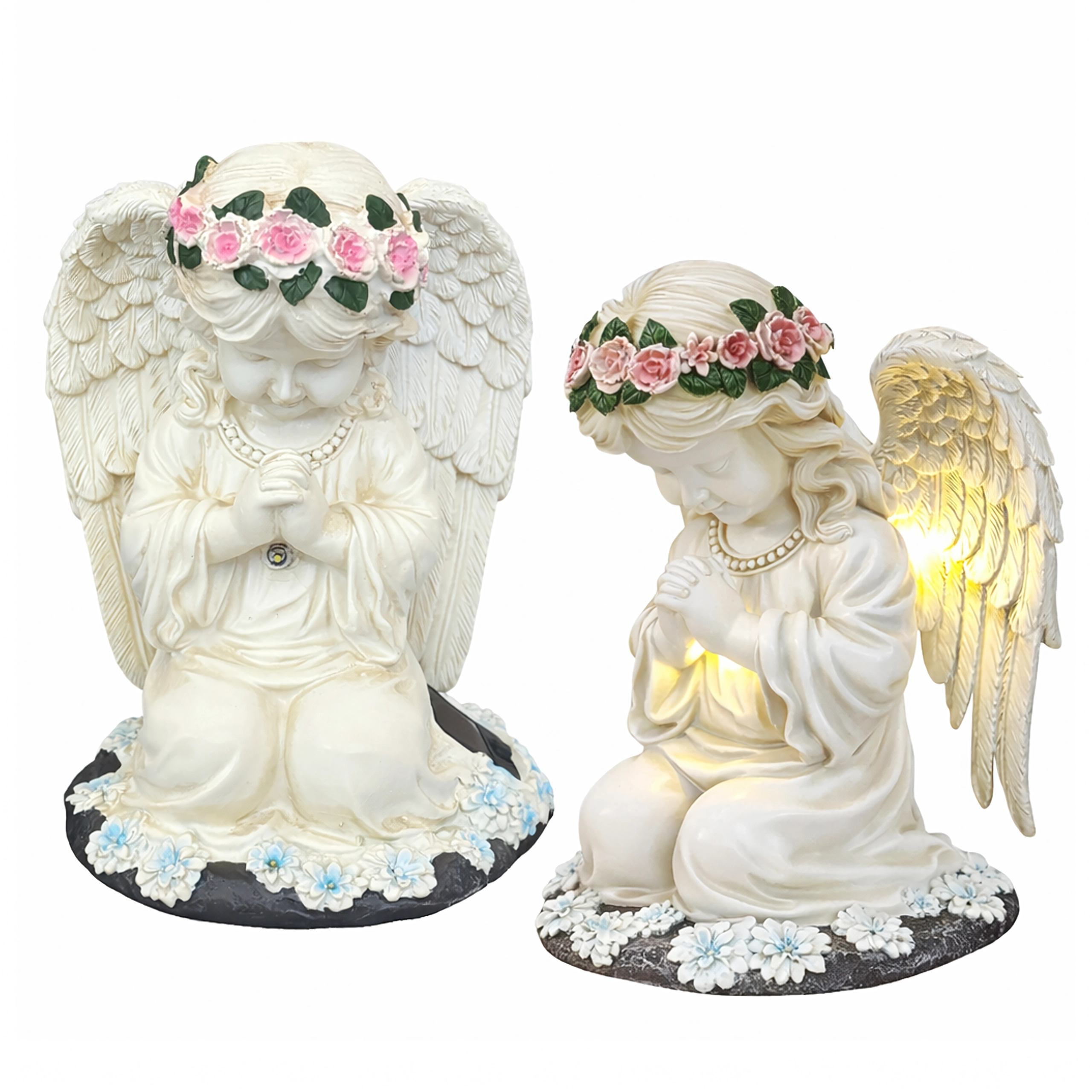 A részletgazdagon kidolgozott, térdelő angyalszobor virágkoszorúval és gazdagon formált szárnyakkal egész éves kültéri használatra készült. A beépített meleg fényű LED-ek finoman megvilágítják a szárnyakat és a ruhát, nyugtató esti fényt teremtve kerti ösvényekhez, ágyásokhoz és emlékhelyekhez. A napelemnek köszönhetően nappal tölt, sötétedéskor pedig automatikusan felkapcsol.