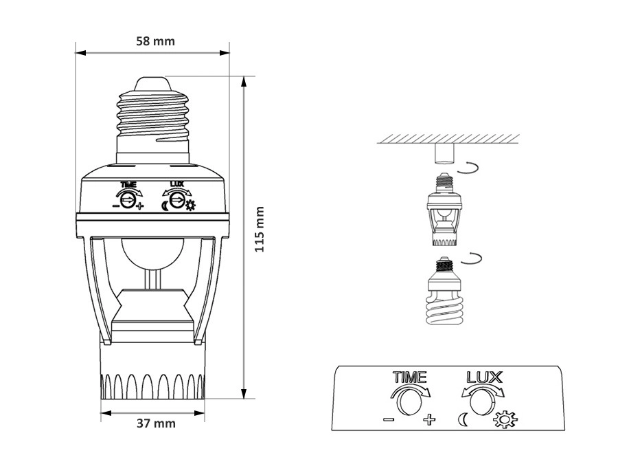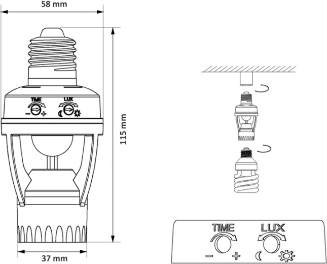 A telepítés percek kérdése: egyszerűen csavard be a meglévő E27 foglalatba és helyezd be az izzót. A forgó szabályzókkal könnyedén beállítható a utánvilágítási idő (TIME) és a világítási küszöbszint (LUX). Az érzékelő infravörös észlelést (PIR) használ, megbízhatóan különbözteti meg a nappalt/éjszakát, így energiát és költséget takarít meg.