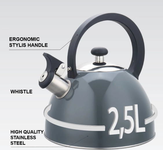 Praktikus, sípoló Maestro vízforraló 2,5 l űrtartalommal, minőségi rozsdamentes acélból, ideális mindennapi tea- és kávékészítéshez. A minden tűzhelytípuson, beleértve az indukciósat is, univerzálisan használható kialakításnak, a többrétegű kapszulás fenéknek a gyors és egyenletes melegítéshez, valamint a levehető fedélnek a könnyű tisztításért köszönhetően biztonságos és kényelmes használatot kínál bármely konyhában.