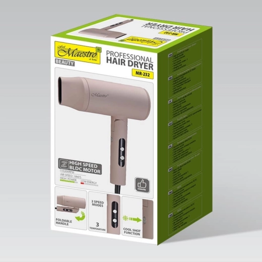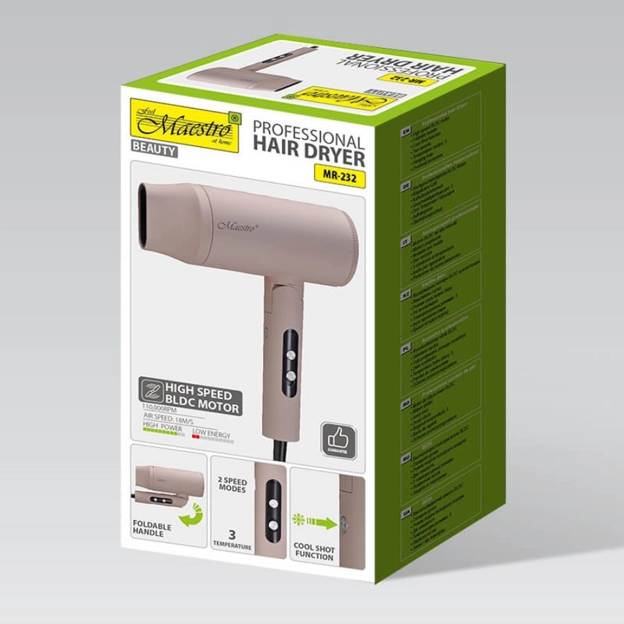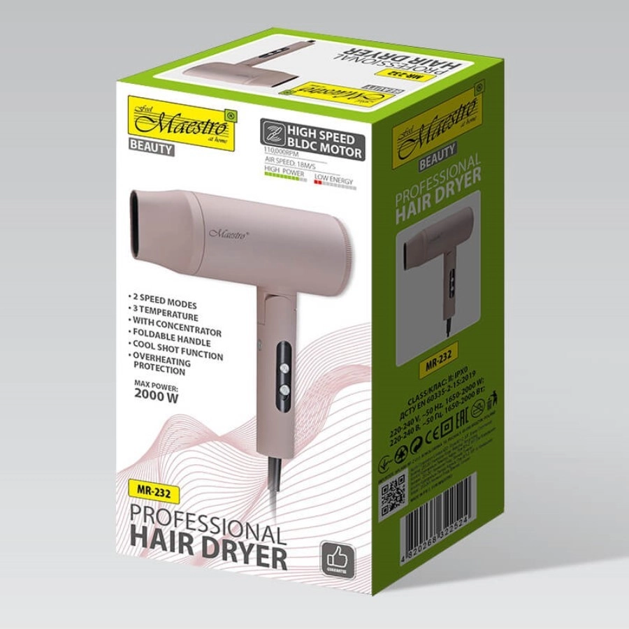A MAESTRO MR-232 ideális választás a mindennapi hajápoláshoz és utazáshoz. A hosszú élettartamú BLDC motornak és a 2000 W teljesítménynek köszönhetően a haj gyorsan és kíméletesen szárad, míg a 18 m/s légáram a sűrű és hosszú hajat is könnyedén kezeli. A pontos beállításról a 2 sebesség és a 3 hőmérséklet gondoskodik, amelyet a hideg levegő egészít ki a végső rögzítéshez és fényhez.