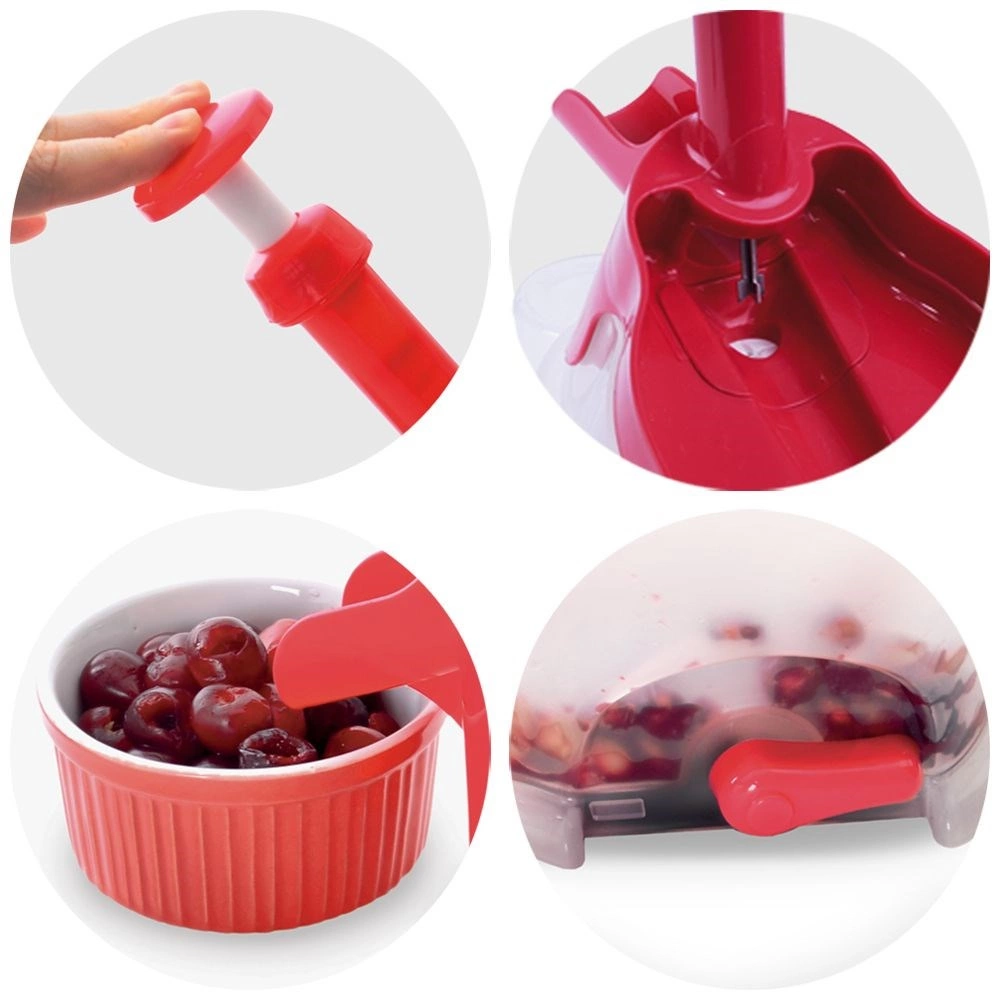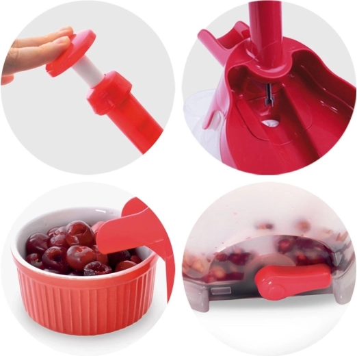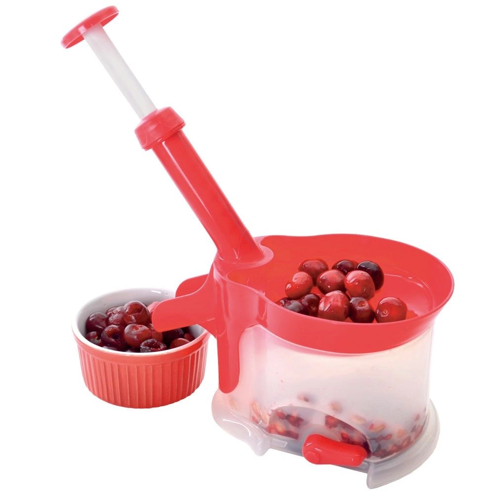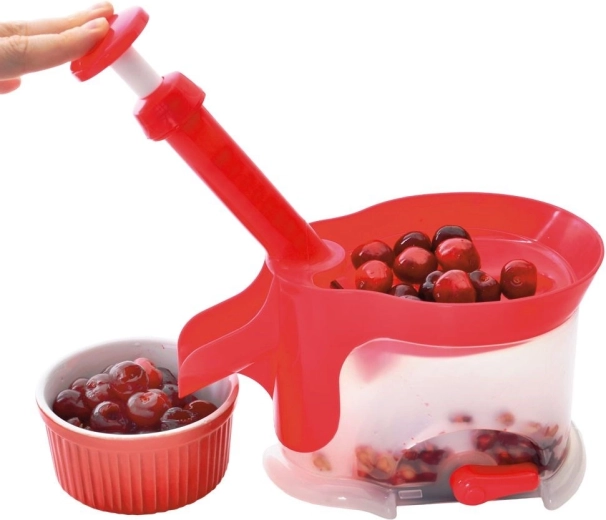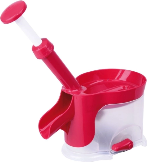 A strapabíró műanyag piros és félig átlátszó fehér színben könnyű, mégis erős. A gyűjtőtartály felfogja a magokat és a kifolyó levet, a kiöntő pedig megkönnyíti a folyamatos ürítést. A csomagban két pót gumigyűrű is található a hosszabb élettartamért. Használat után egyszerűen szétszedi, és elmoshatja a mosogatógépben.