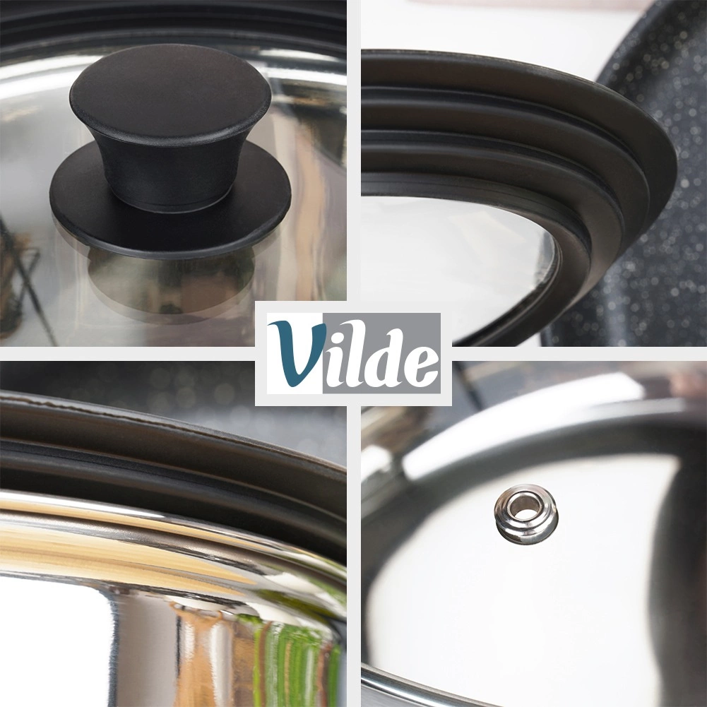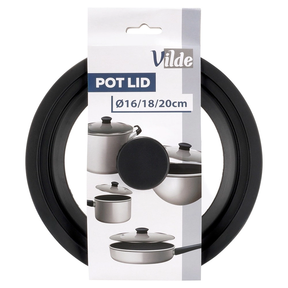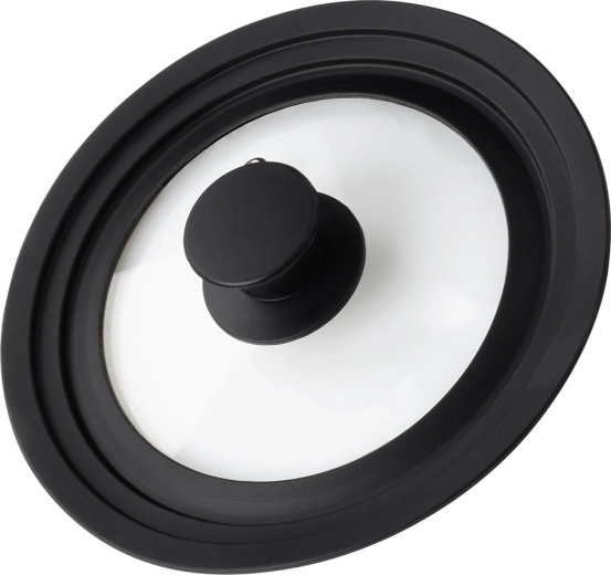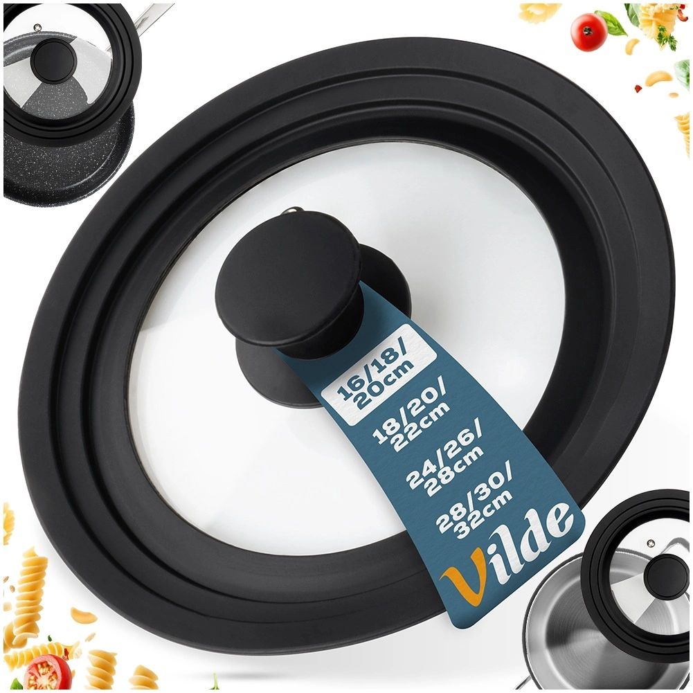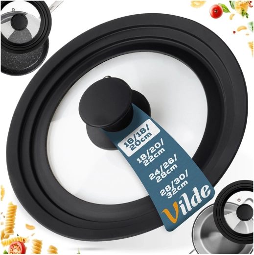 A Vilde univerzális fedő tartós edzett üveget és rugalmas szilikont ötvöz elegáns fekete színben. A lépcsőzetes szilikon peremnek köszönhetően biztonságosan illeszkedik több mérethez (16/18/20 cm), tömít, védi az edények széleit és segít rendet tartani a főzőlapon. Az átlátszó üveg lehetővé teszi a főzés követését a fedő felemelése nélkül, míg a szellőzőnyílás szabályozza a gőz távozását és csökkenti a kifutás kockázatát.