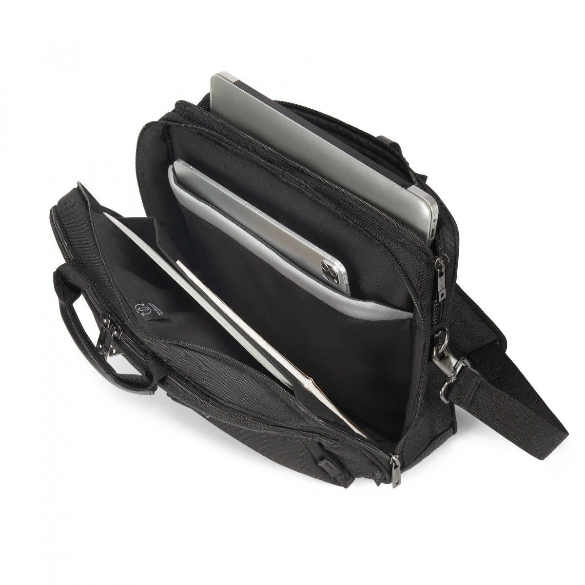 A táska külső és belső része minőségi, újrahasznosított rPET anyagból készült, amely második életet ad a műanyag palackoknak anélkül, hogy csökkentené a tartósságot és a prémium megjelenést. Az olyan funkciók, mint a DICOTA Cushion Technology ütéscsillapítás, az RFID árnyékolás az illetéktelen leolvasás ellen és a dedikált lokátor zseb új szintre emelik a felszerelés védelmét és nyomon követhetőségét.