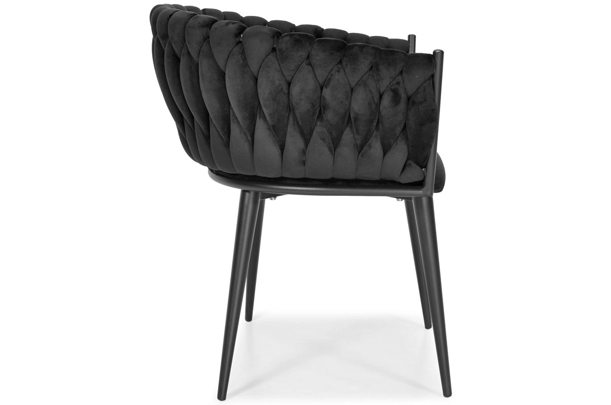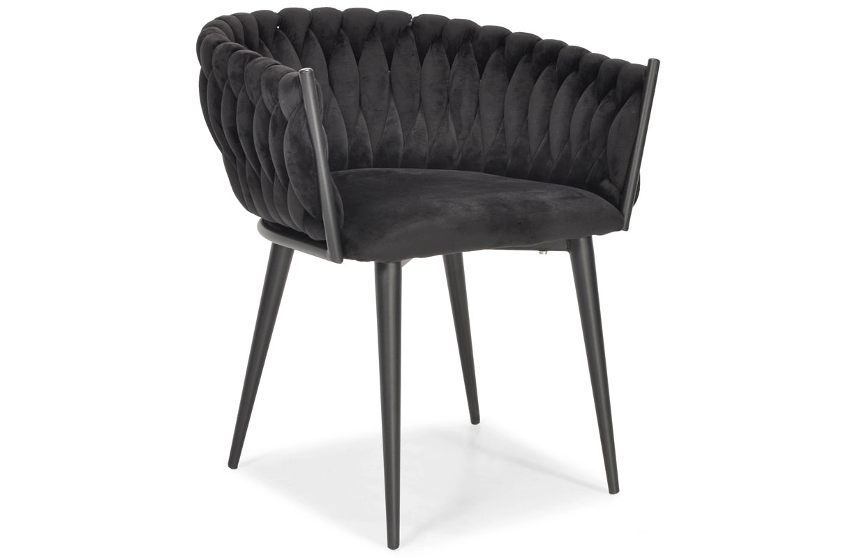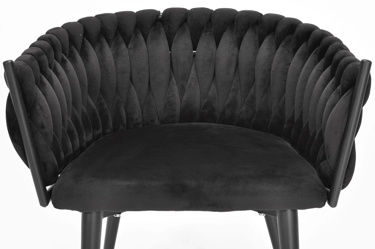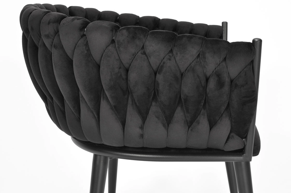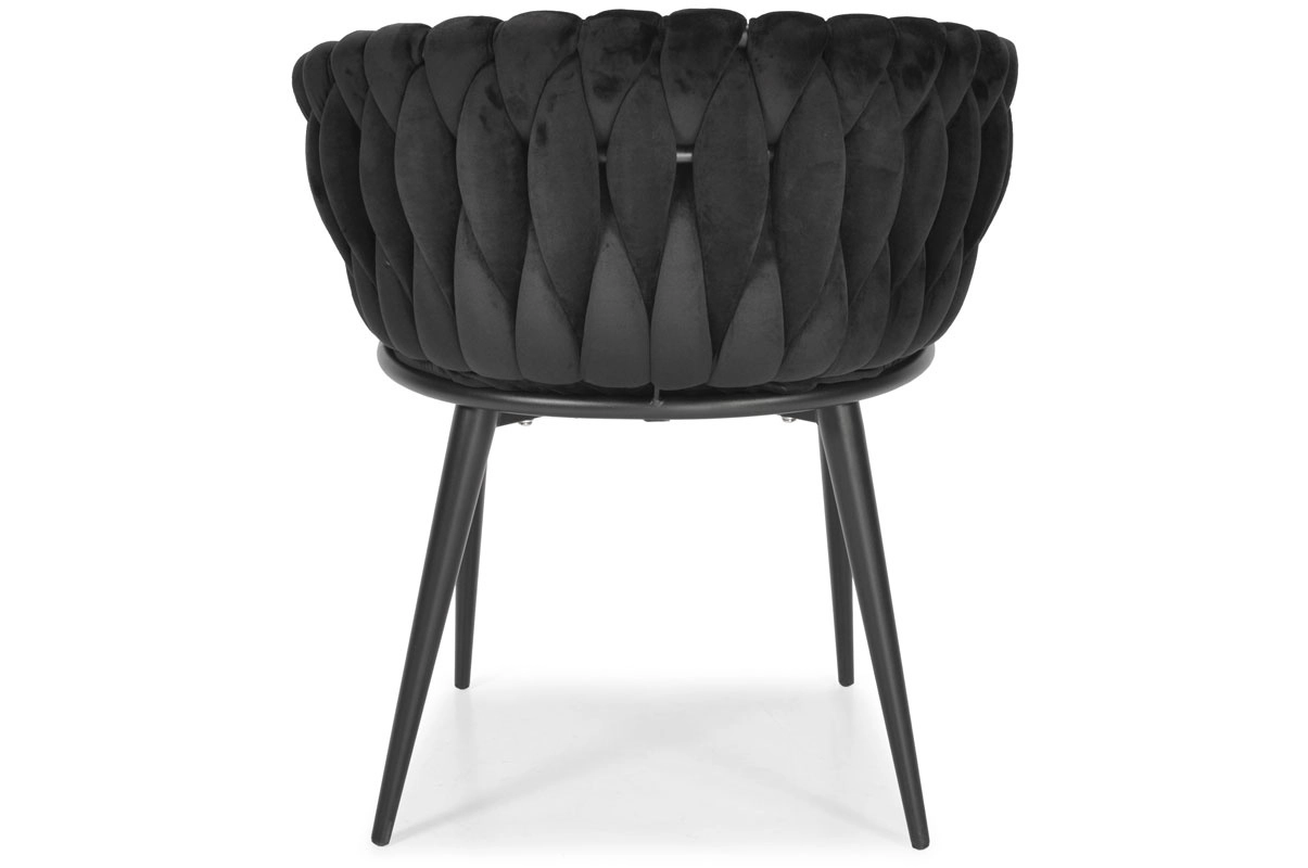 A mélyfekete ROSA fotel a luxus velúrt, a dekoratív, fonott háttámlát és a karcsú, stabil lábakat ötvözi stílusos hangsúlyként a nappaliba, étkezőbe vagy beauty sarokba. Kényelmes, párnázott ülőfelületet kínál, és azonnal ragyogó glamour megjelenést és prémium érzetet ad a térnek.