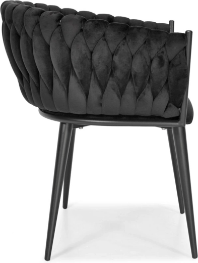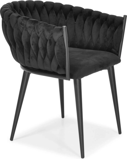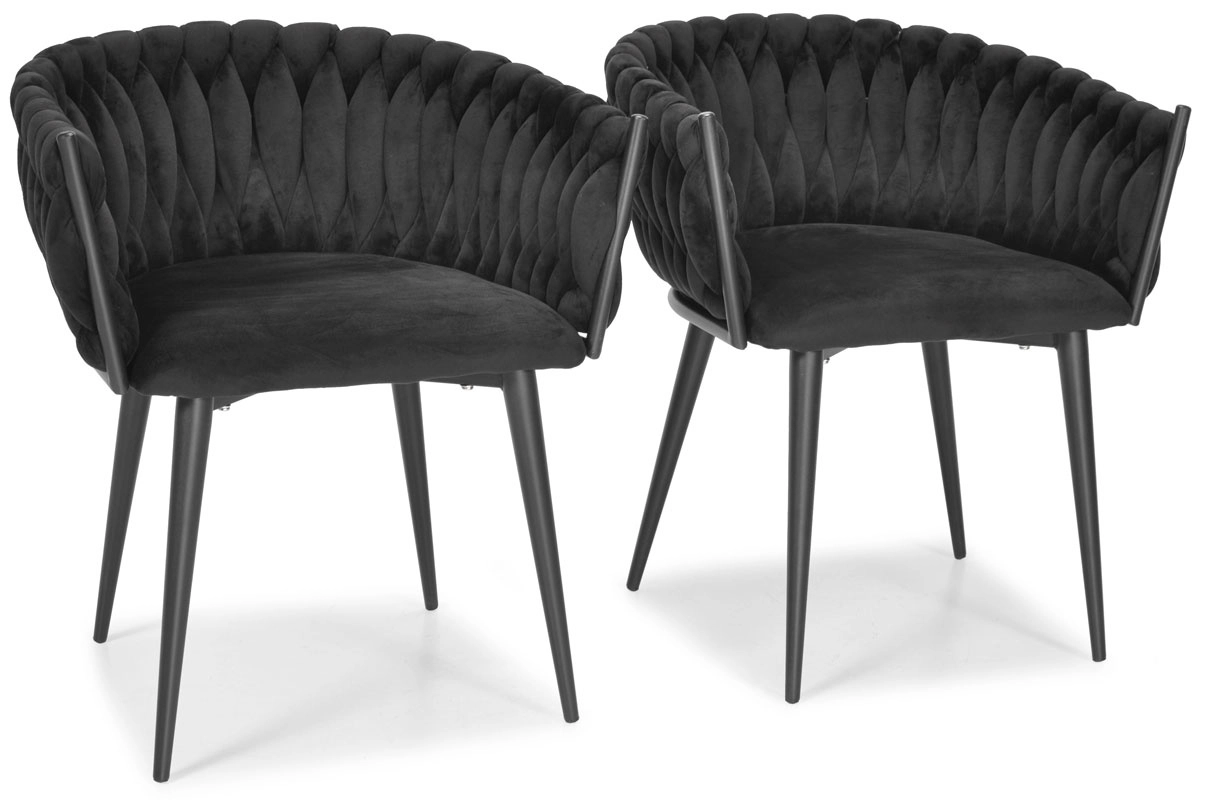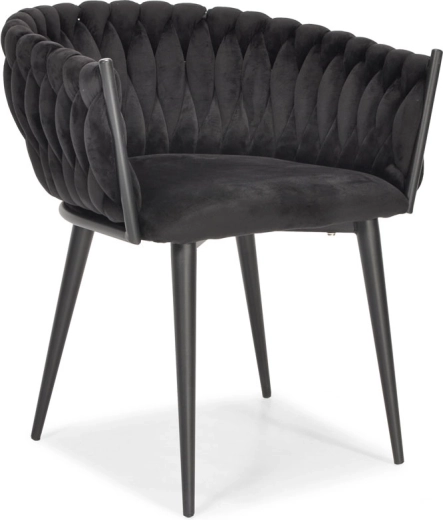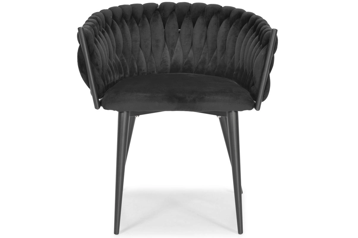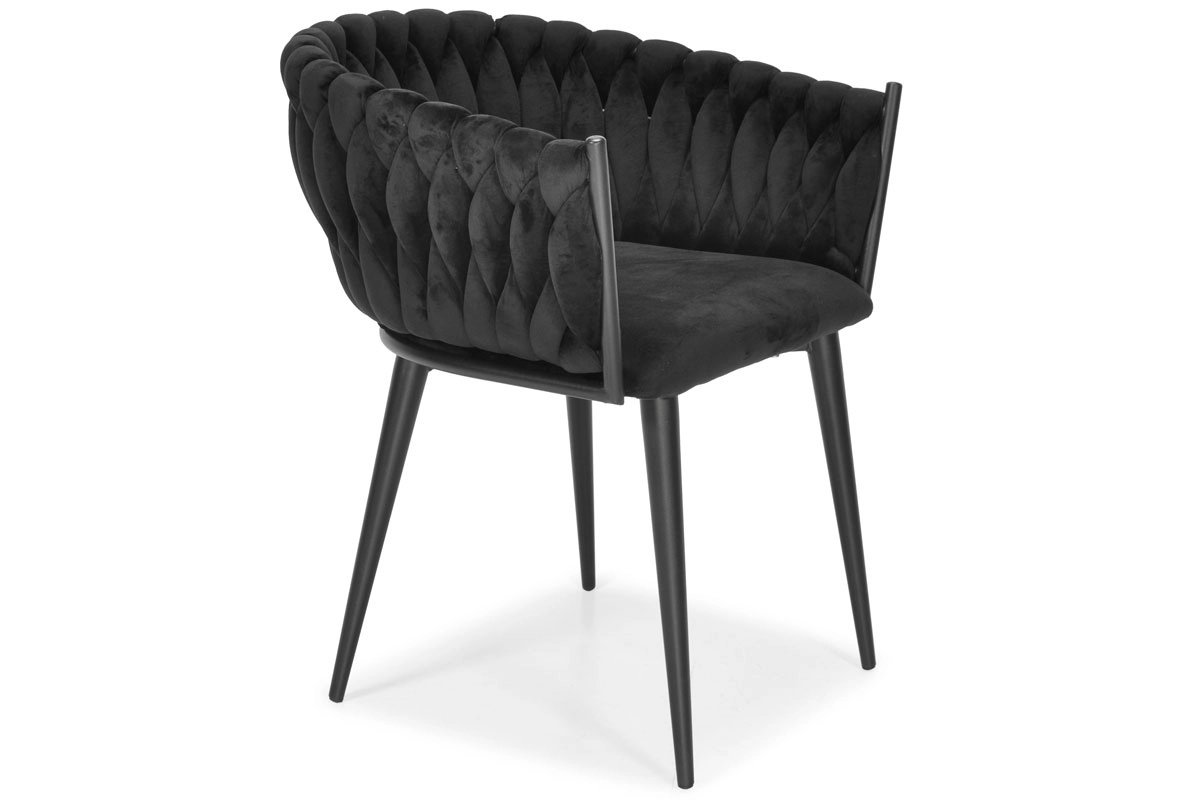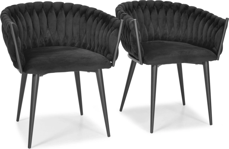 A mélyfekete ROSA fotel a luxus velúrt, a dekoratív, fonott háttámlát és a karcsú, stabil lábakat ötvözi stílusos hangsúlyként a nappaliba, étkezőbe vagy beauty sarokba. Kényelmes, párnázott ülőfelületet kínál, és azonnal ragyogó glamour megjelenést és prémium érzetet ad a térnek.
