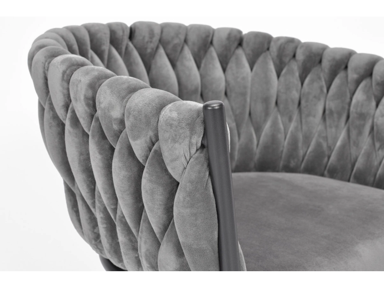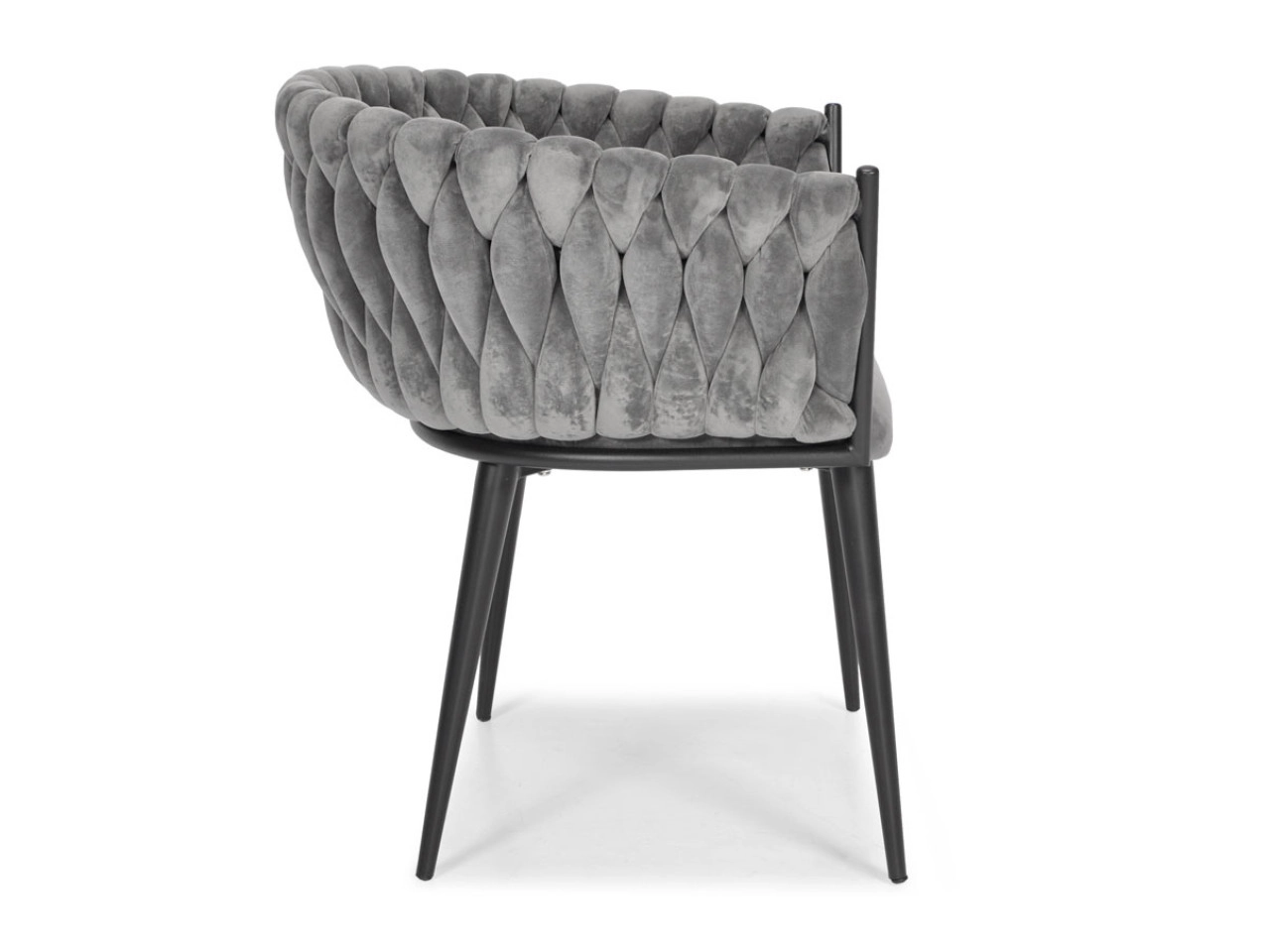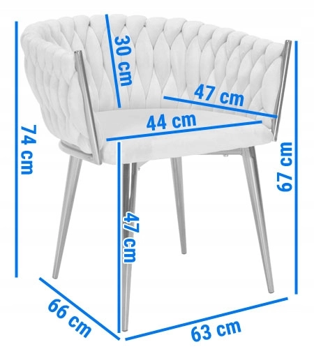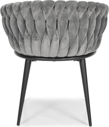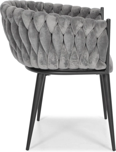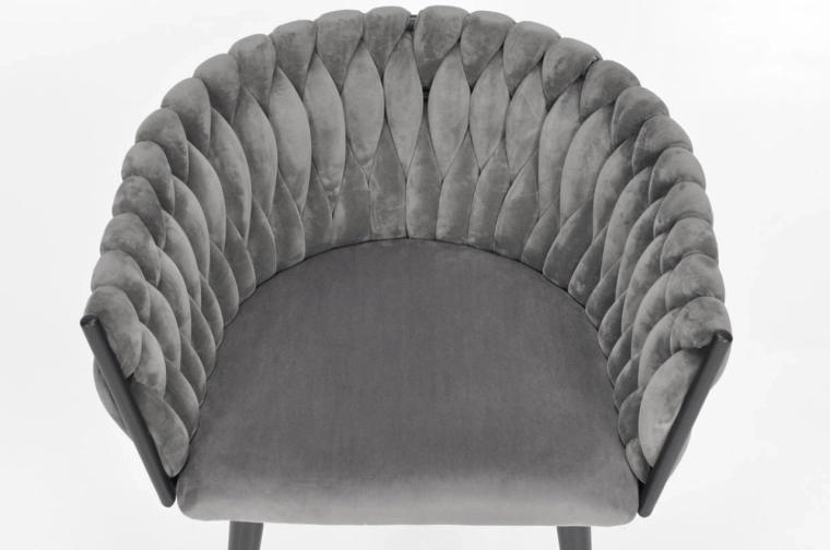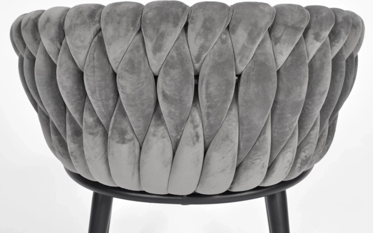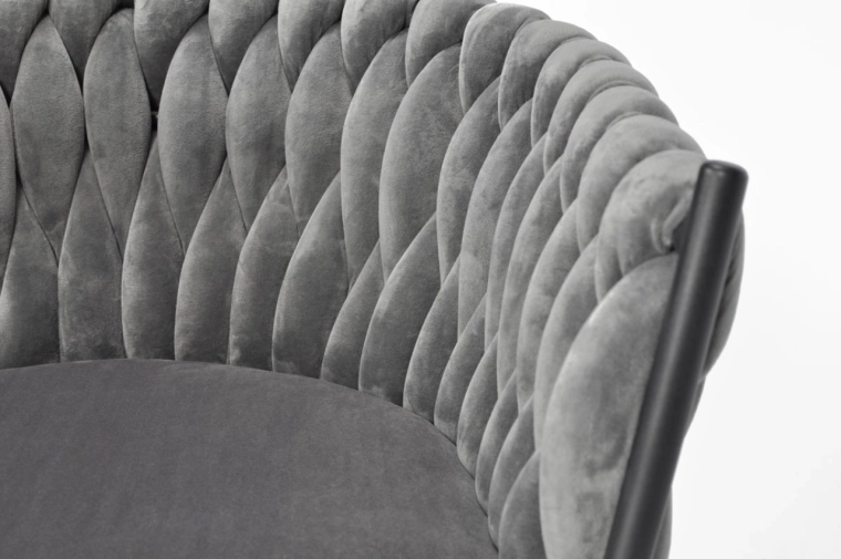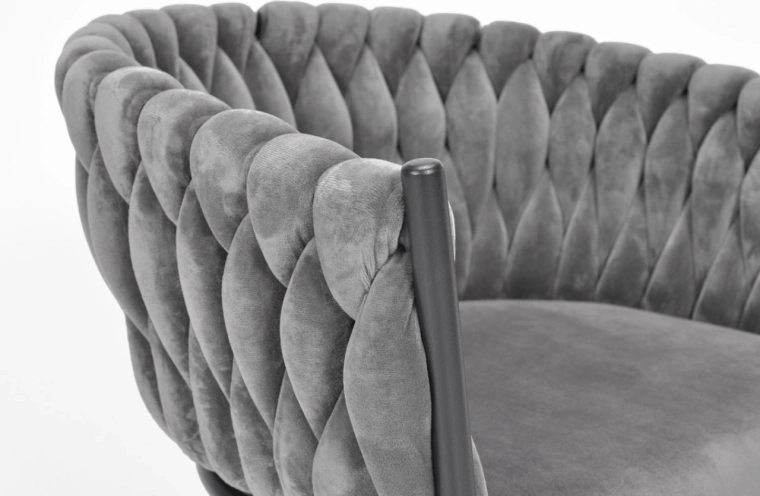 Vigyen otthonába eleganciát és kényelmet modern, glamour stílusban. A finoman fénylő bársony kárpitozás luxushatást kelt, és szépen kontrasztál a fekete, karcsú fém lábakkal. A hangsúlyos fonott háttámla dekoratív elem, amely első pillantásra megragadja a tekintetet, és a széket a helyiség meghatározó dizájndarabjává teszi.