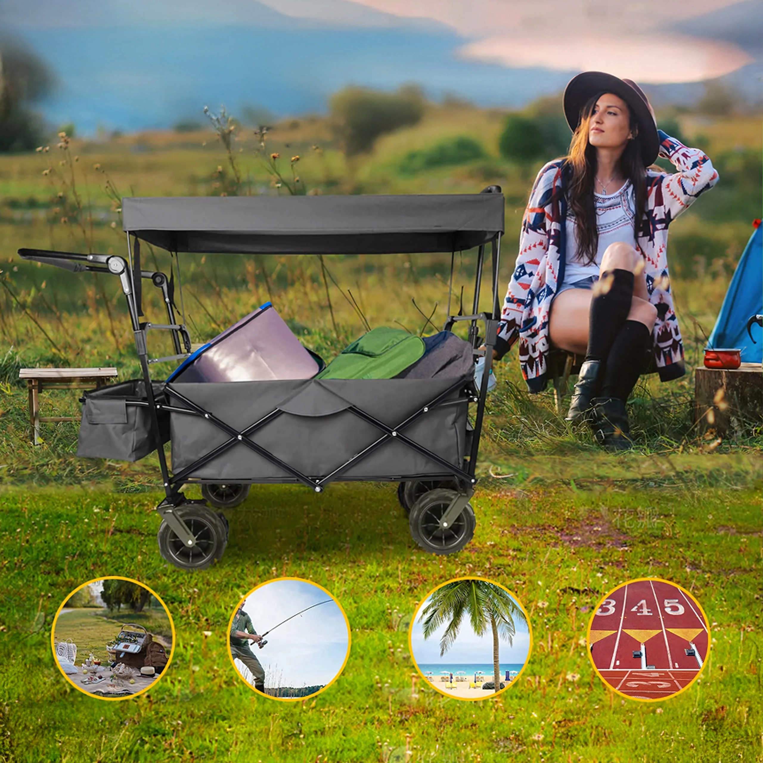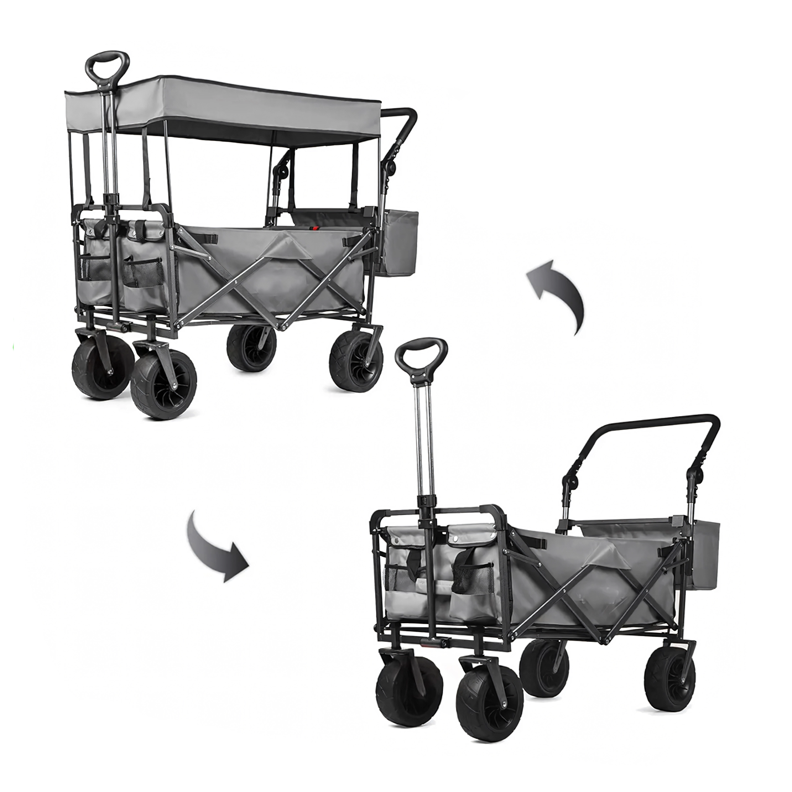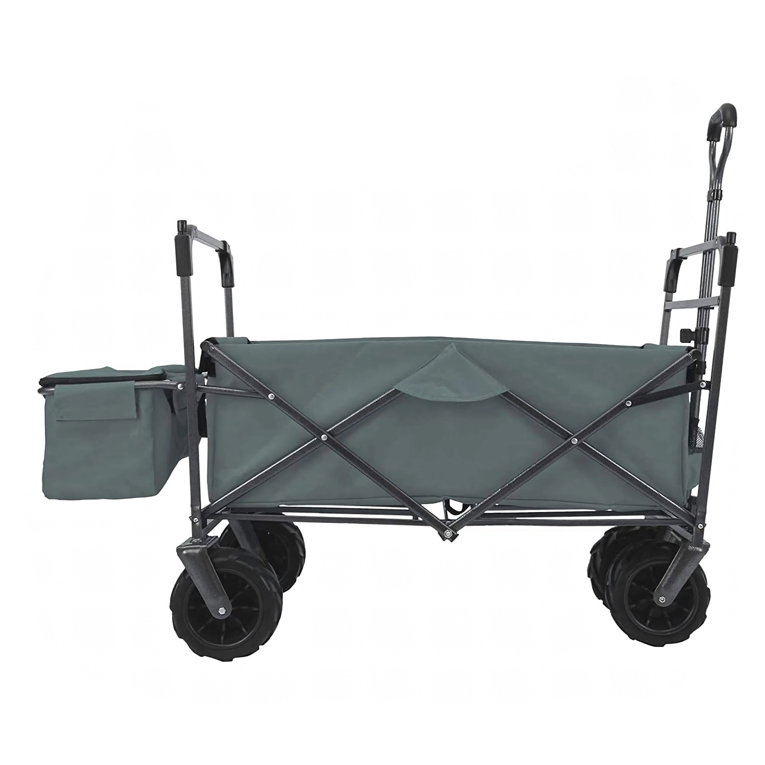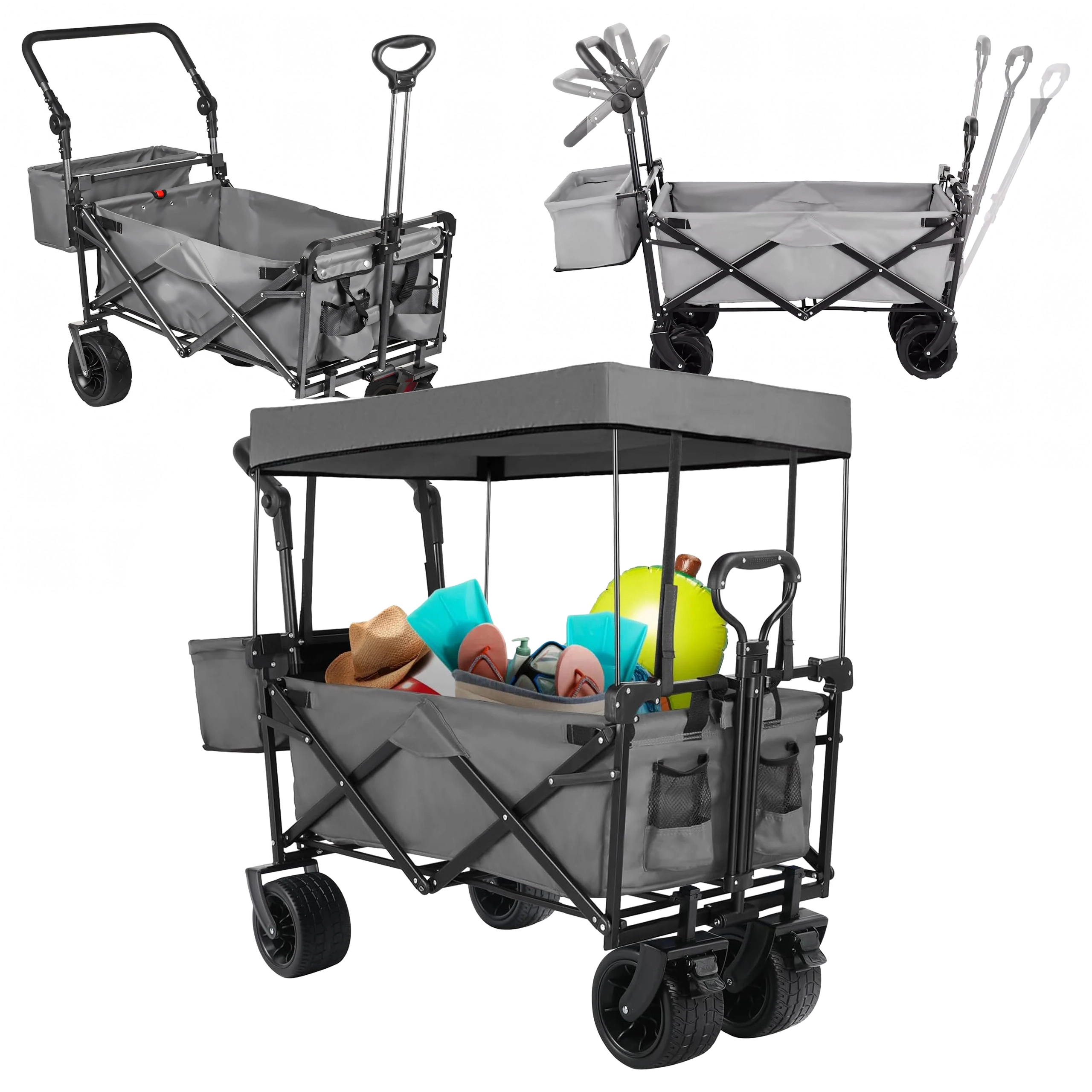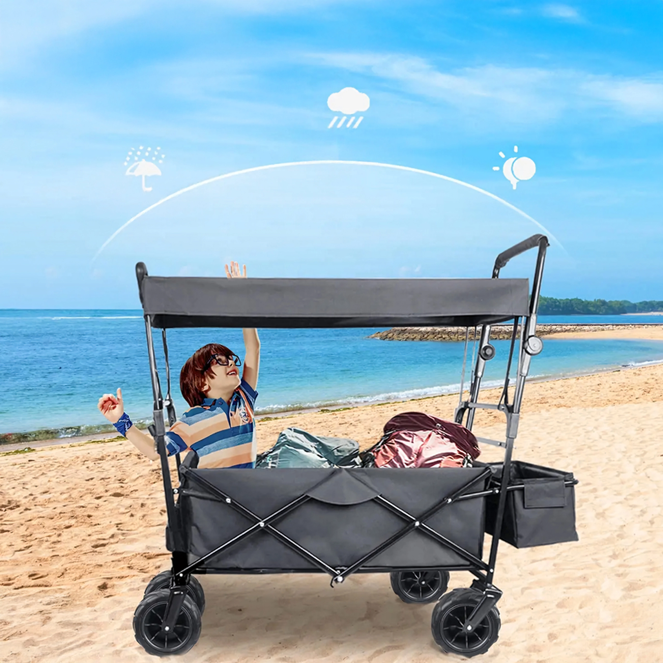 Az univerzális, összecsukható kocsi ideális segítőtárs kertbe, strandra, kempingezéshez és horgászathoz. A masszív felépítésű, erős textil raktérrel rendelkező kocsi elbírja a szerszámokat, bevásárlást, sportfelszerelést és strandkellékeket is. A XL kerekeknek köszönhetően könnyedén halad homokon, füvön és murván, míg a kupola árnyékot és védelmet nyújt a nap ellen.