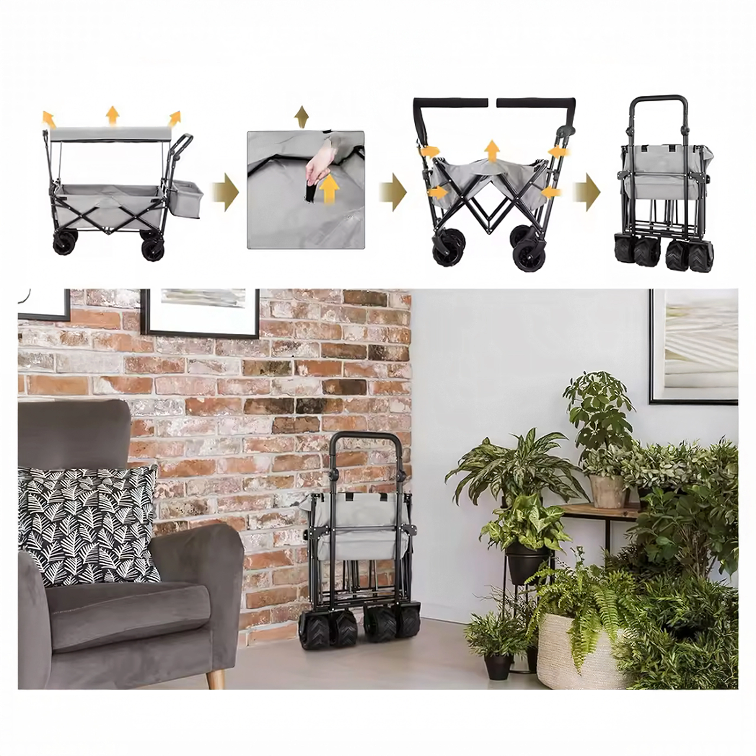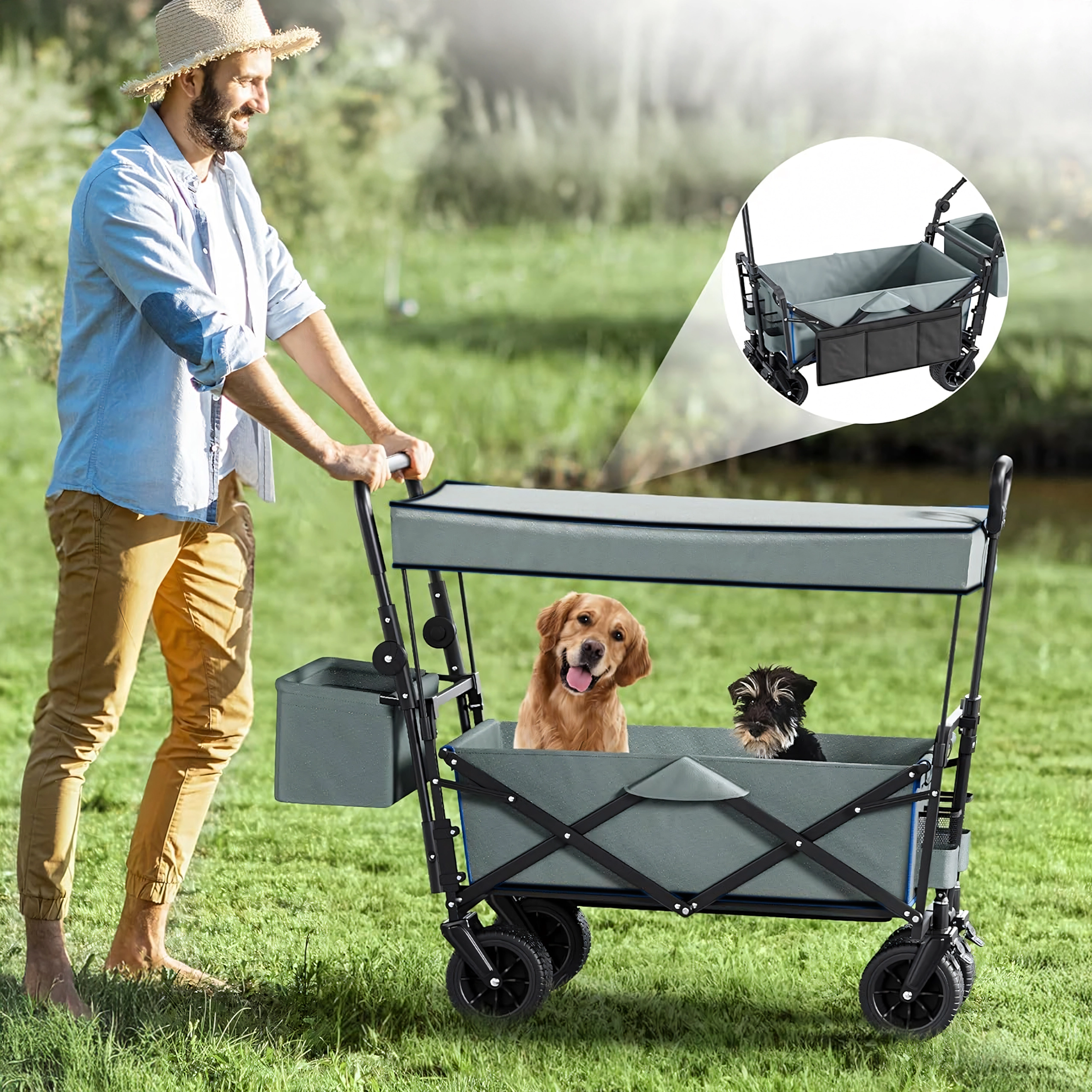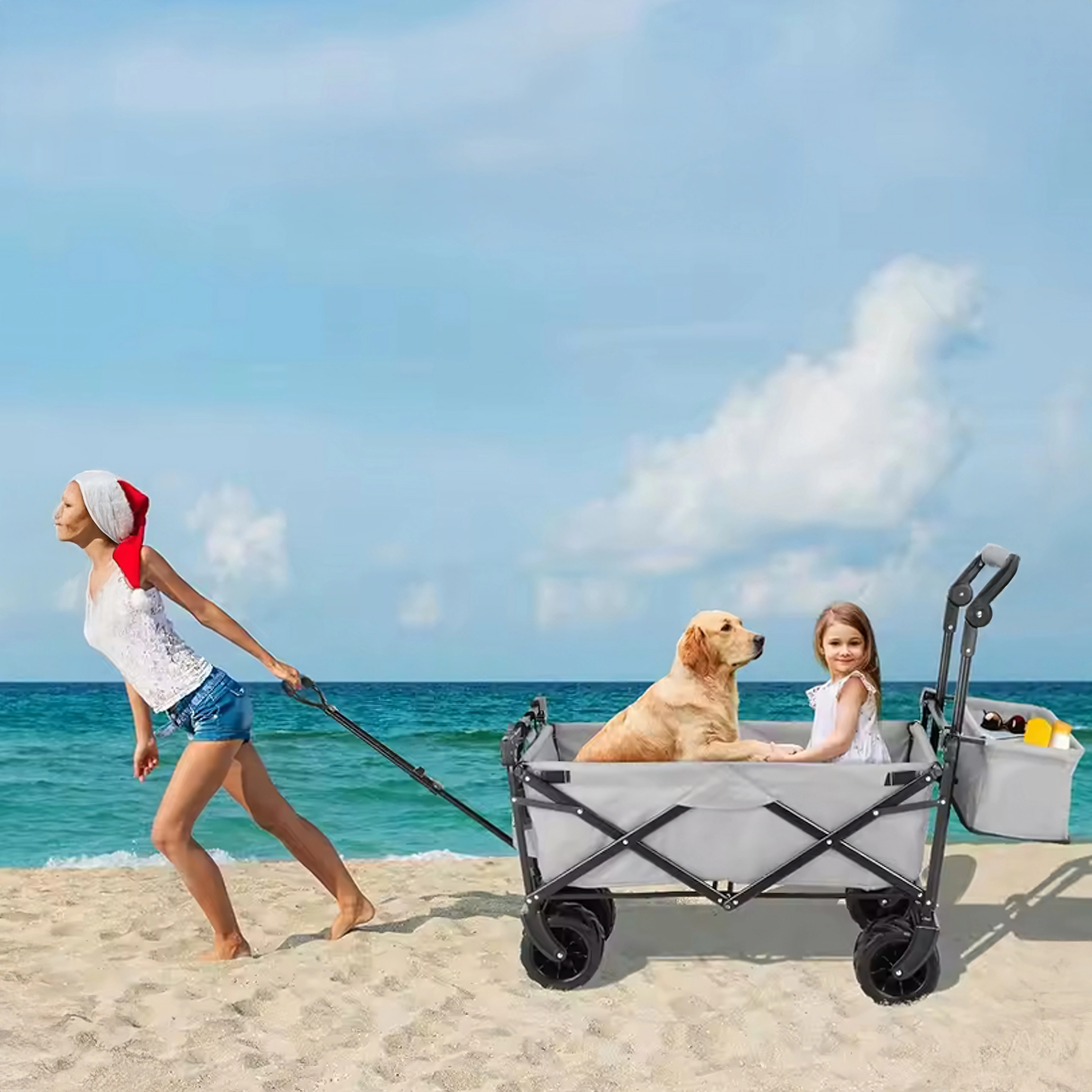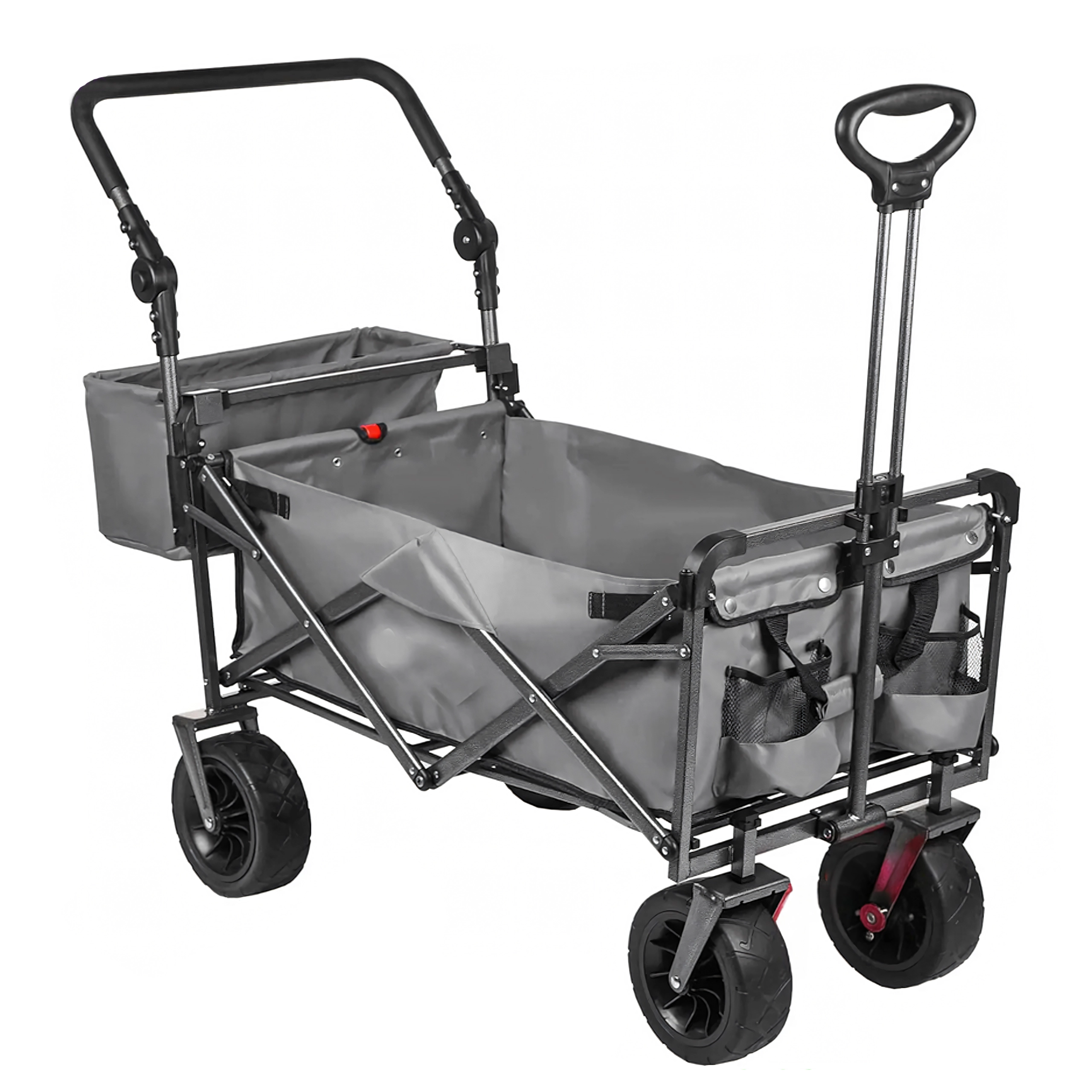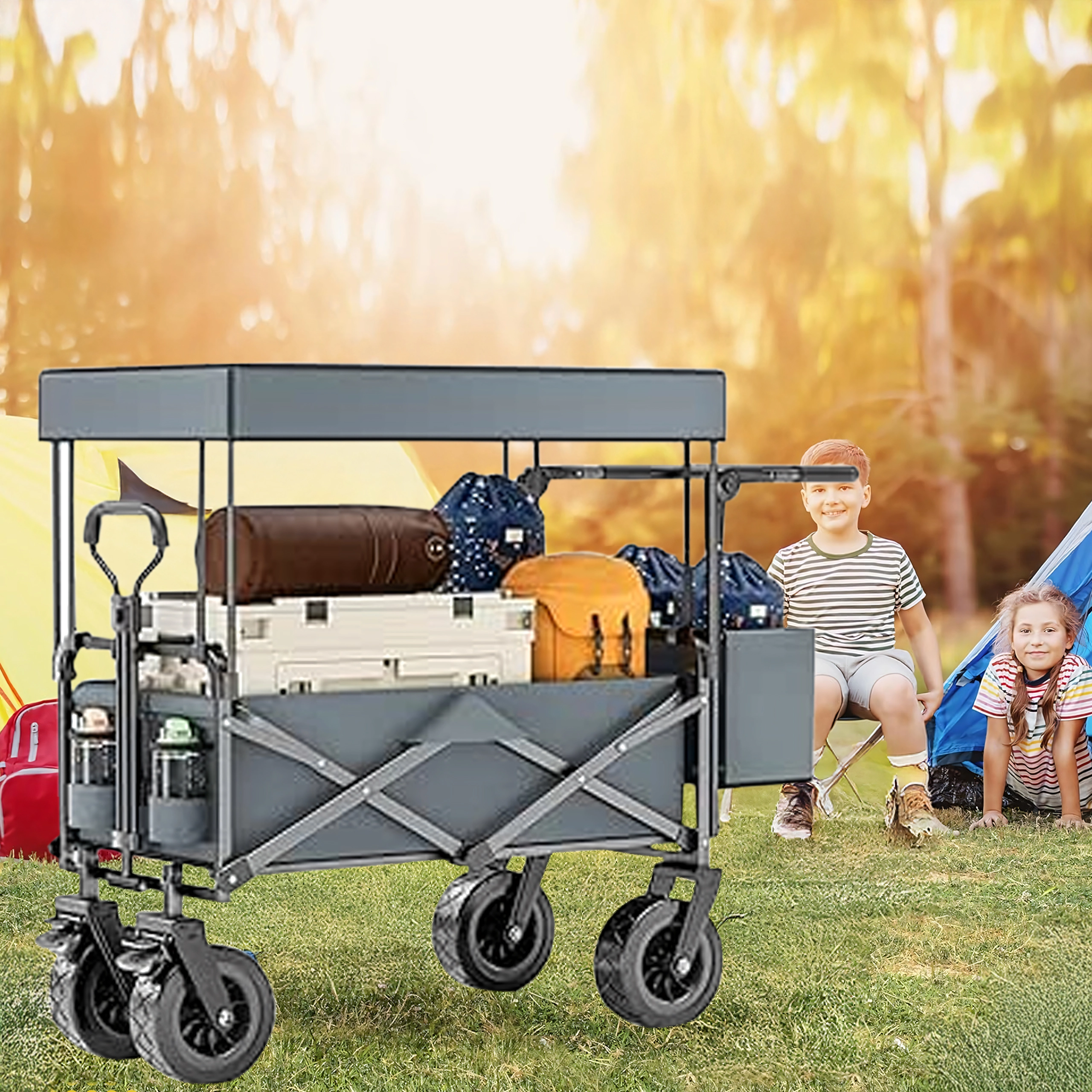 Az univerzális, összecsukható kocsi ideális segítőtárs kertbe, strandra, kempingezéshez és horgászathoz. A masszív felépítésű, erős textil raktérrel rendelkező kocsi elbírja a szerszámokat, bevásárlást, sportfelszerelést és strandkellékeket is. A XL kerekeknek köszönhetően könnyedén halad homokon, füvön és murván, míg a kupola árnyékot és védelmet nyújt a nap ellen.
