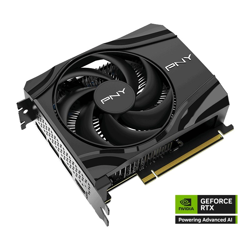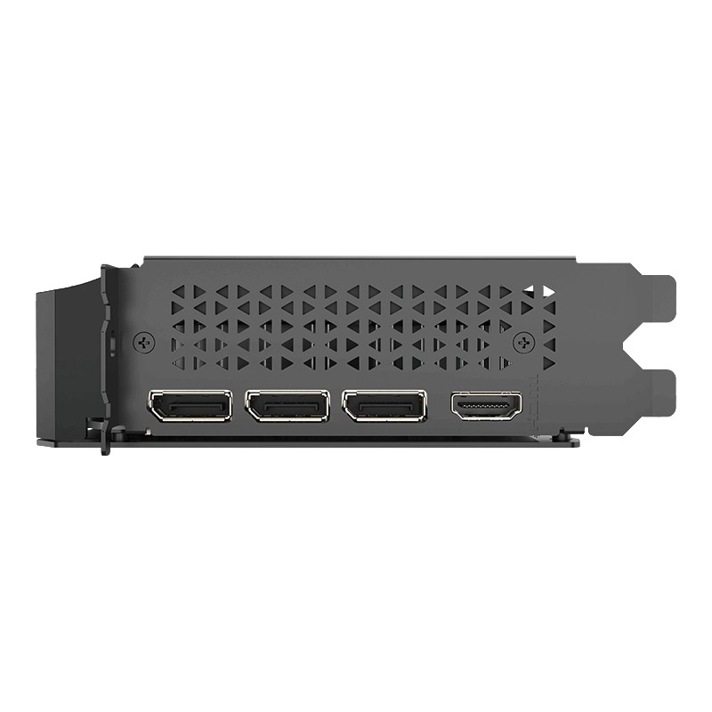 A rövid, egy- akár kétslotos kialakítás egy nagy axiális ventilátorral és masszív fém backplate-tel növeli a kártya merevségét és hozzájárul a jobb hőelvezetéshez. A hátlapon HDMI és három DisplayPort található több monitorhoz és gördülékeny multitaskinghoz.