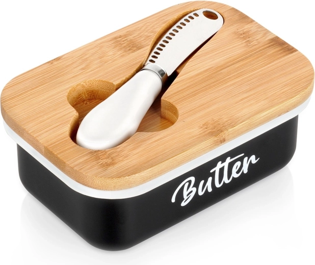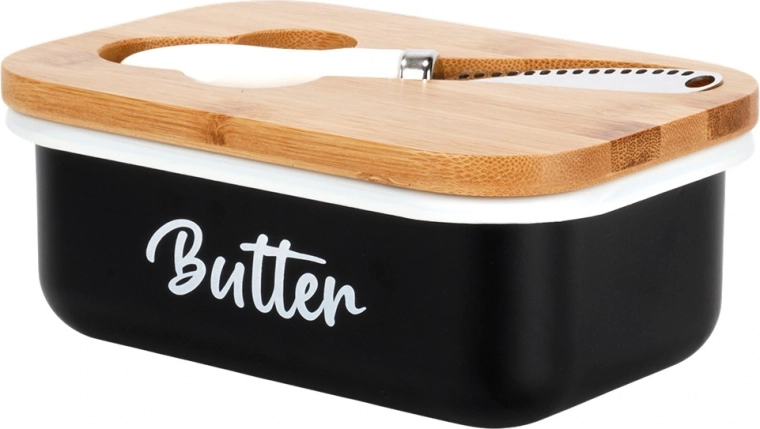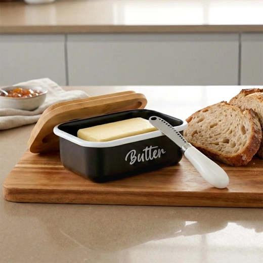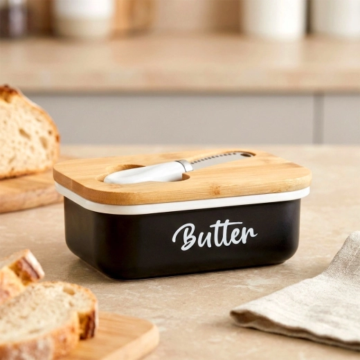 A fekete test visszafogott Butter felirattal elegánsan mutat a konyhapulton és az asztali tálalásnál is.