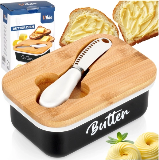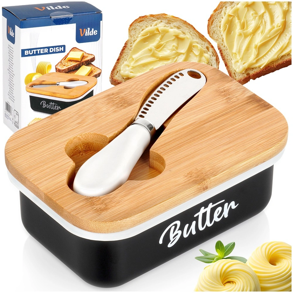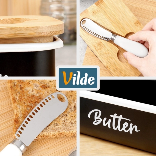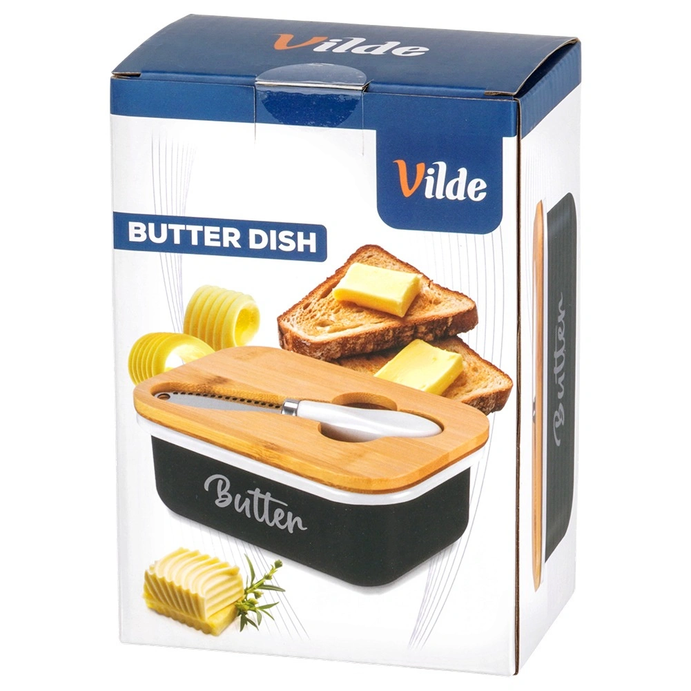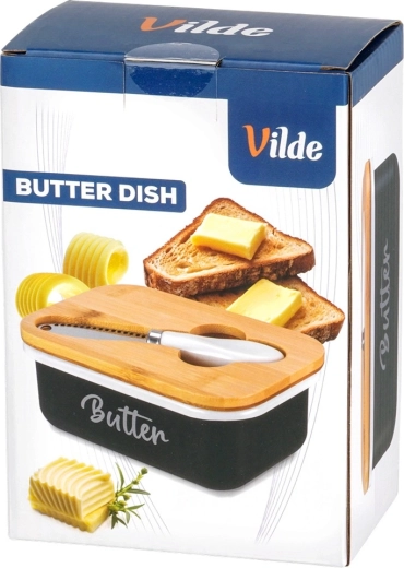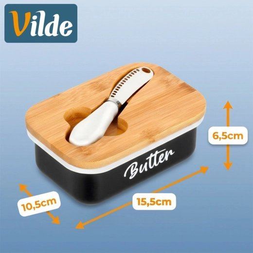 A Vilde elegáns vajtartója a modern megjelenést maximális praktikummal ötvözi. A fekete fémtestet fehér Butter felirat díszíti, melyet természetes bambusz fedél egészít ki; ez segít a vajat tovább frissen és védetten tartani. A fedélbe mart vájat elrejti a mellékelt kést, így minden kényelmesen kéznél van.