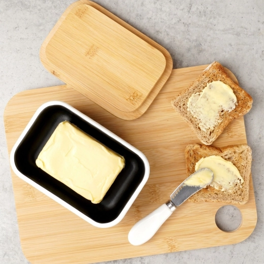 A természetes bambusz fedél segít a vajat védetten és tovább frissen tartani – hűtőbe és asztalra egyaránt ideális.