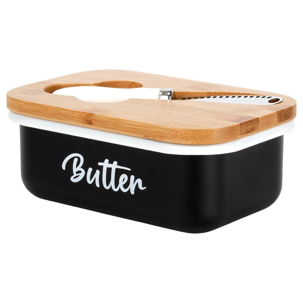 Stílusos vajtartó mindennapi használatra, amely a vajat hosszú ideig frissen és tálalásra készen tartja. Fekete fémteste van Butter felirattal, bambusz fedéllel és egy praktikus rozsdamentes acél késsel, amely közvetlenül a fedélben kapott helyet. Könnyen tisztítható, időtálló formaterve pedig bármelyik konyhába illik.