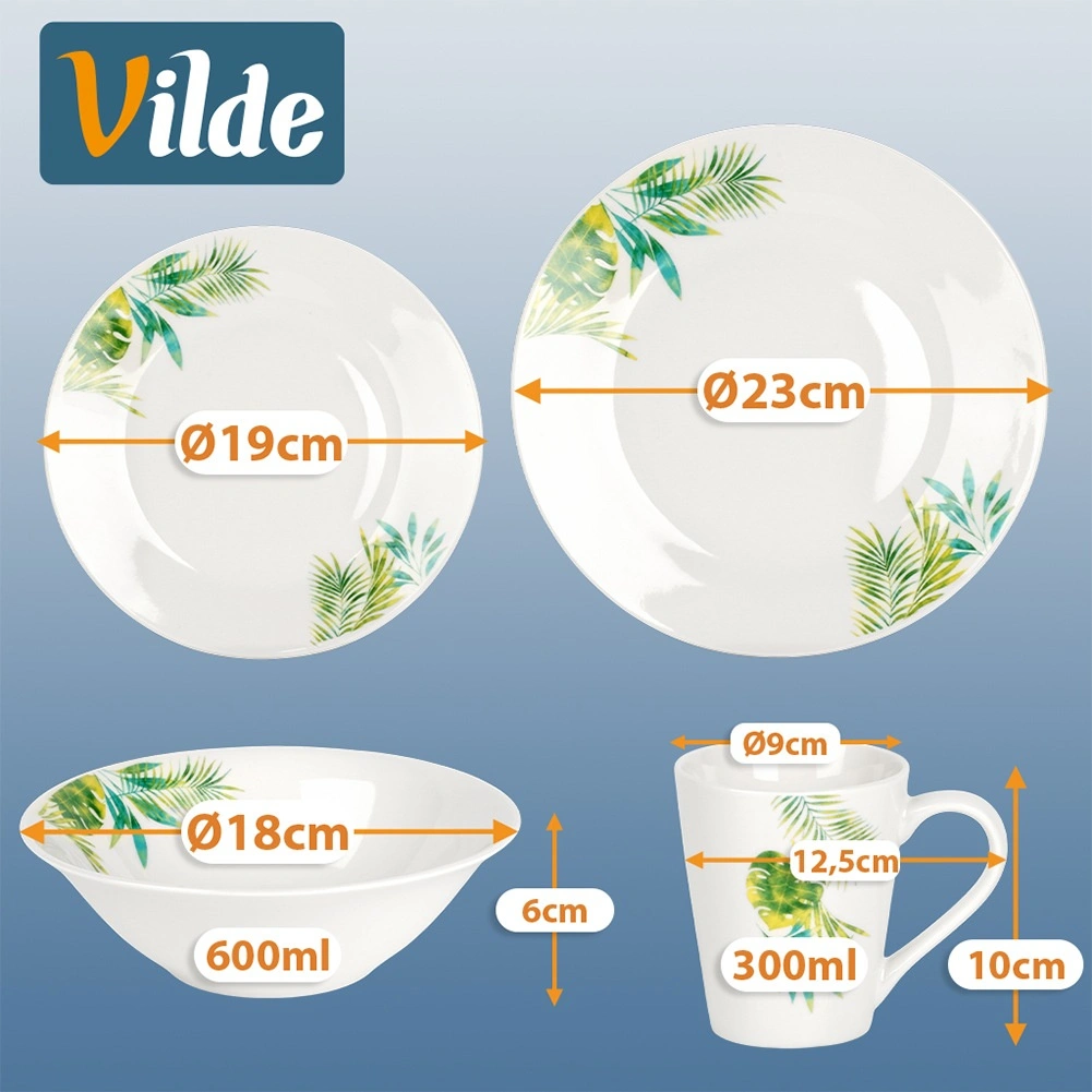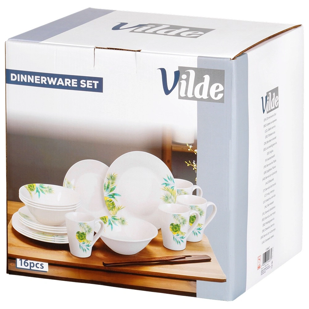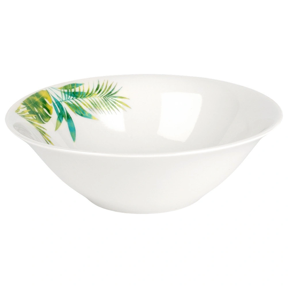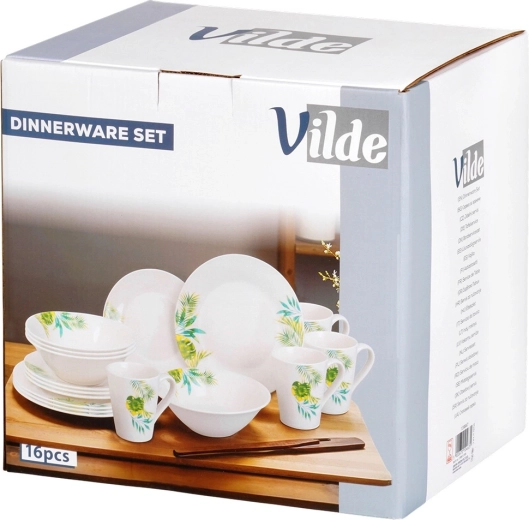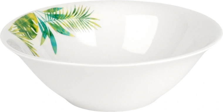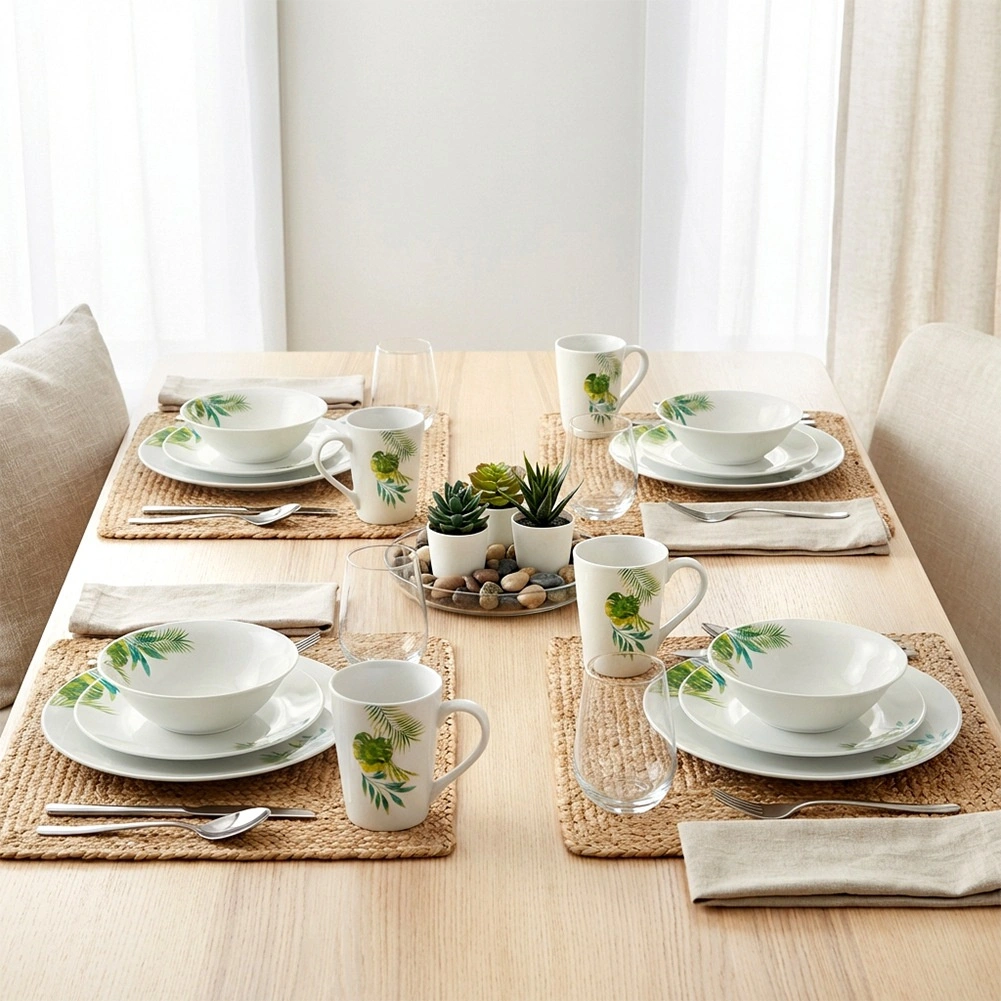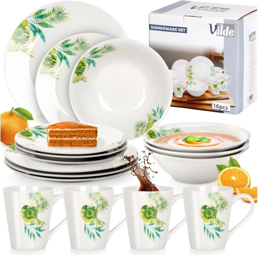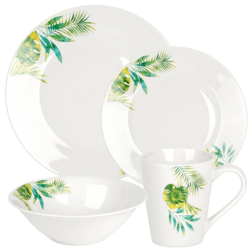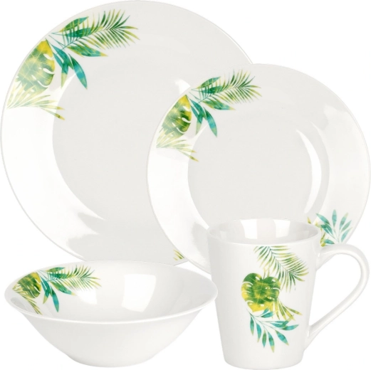 Elegáns porcelán étkészlet 4 személyre fehér mázzal és trópusi növénymintával. 16 darabot tartalmaz: lapos- és desszerttányérokat, 600 ml-es tálakat és 300 ml-es bögréket. Mosogatógépben és mikrohullámú sütőben is használható, ideális mindennapi terítéshez és ünnepi alkalmakra. Időtálló design, amely könnyen illeszthető bármely konyhafelszereléshez.