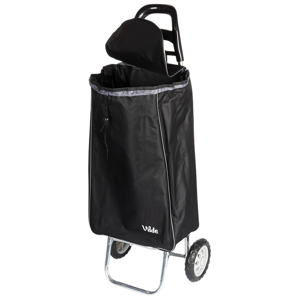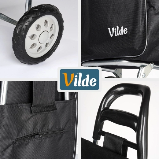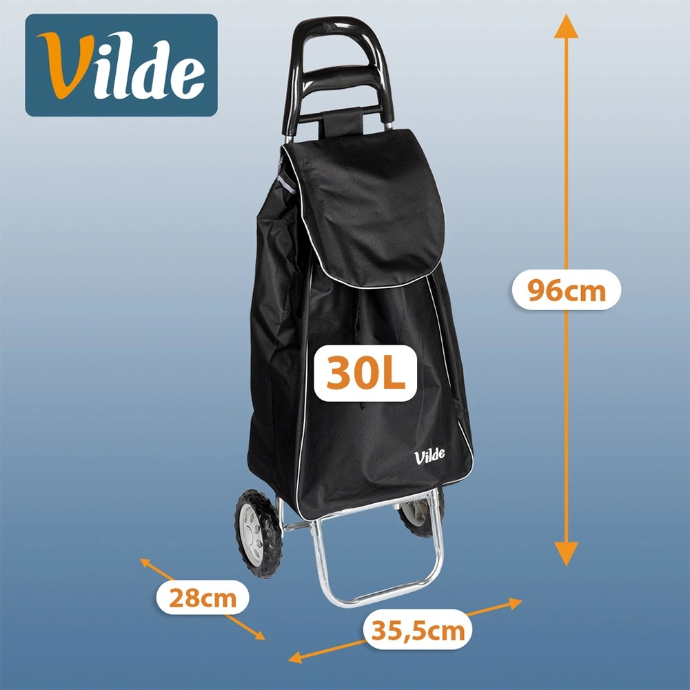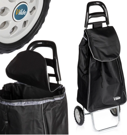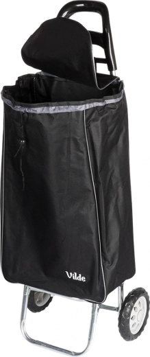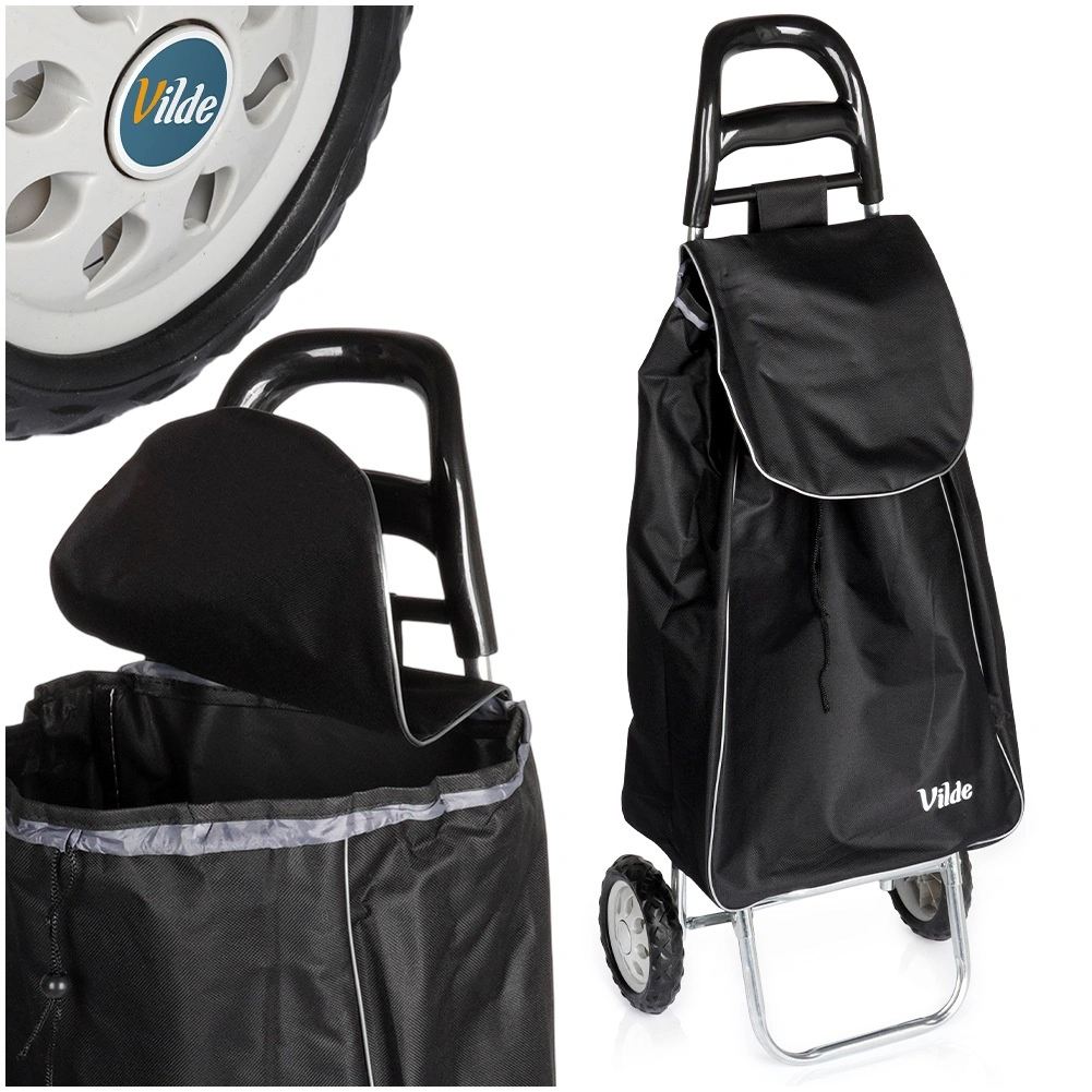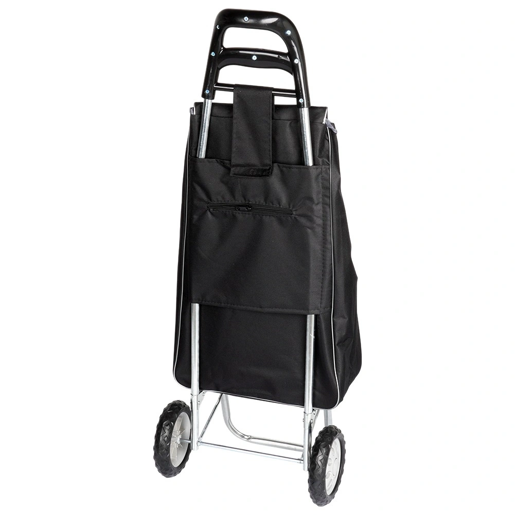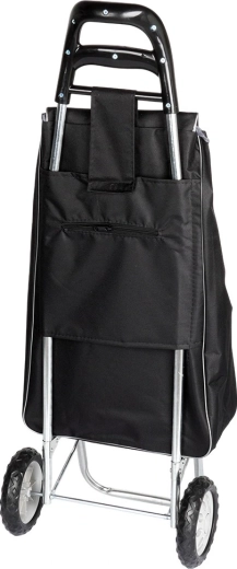 A 30 l űrtartalmú, fekete poliészter táskával szerelt bevásárlókocsi mindennapos használatra készült. A fém váz és a tartós szövet megbízhatóságot nyújt, míg a zsinóros zárás és a felső fedél megóvja a tartalmat az időjárástól. A hátsó cipzáras zseb biztonságosan kéznél tartja az apróságokat.