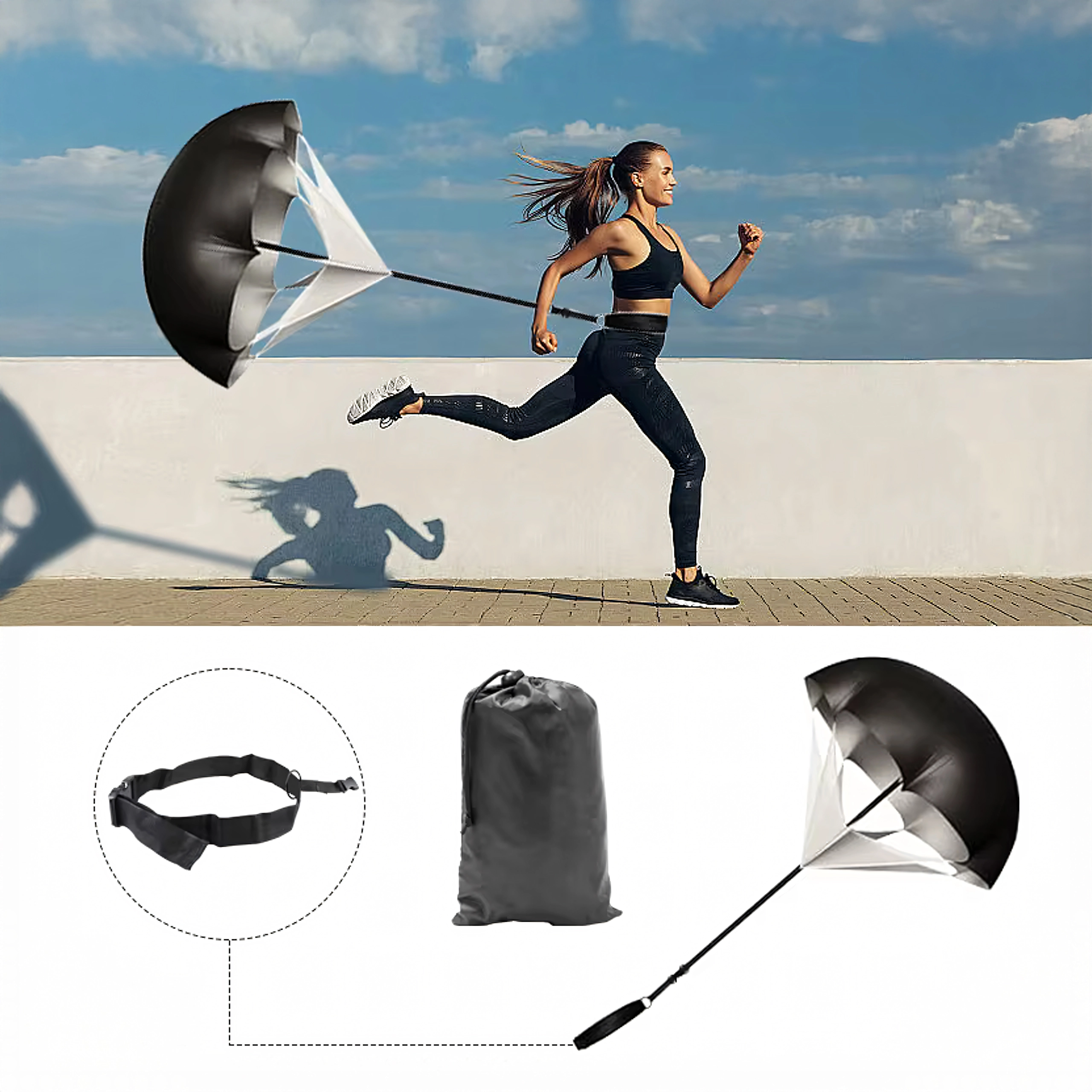 Könnyű ejtőernyős terhelés növeli az ellenállást sprint közben, segítve a gyorsulás és a végsebesség fejlesztését. Az állítható öv stabilan tart, az ejtőernyő pedig könnyen elcsomagolható a mellékelt zsákba.