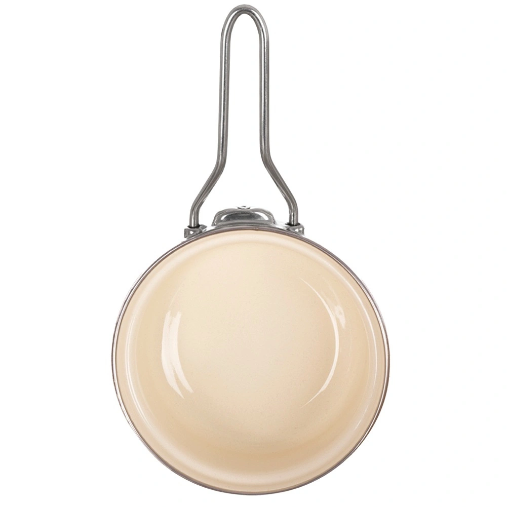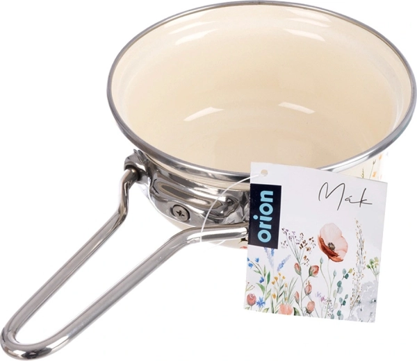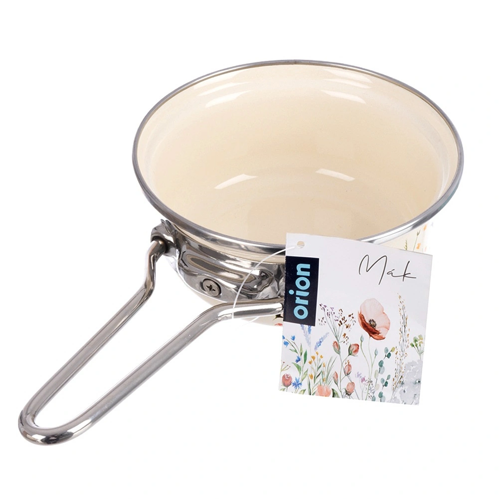 Praktikus krémszínű lábas 14 cm átmérővel és 650 ml űrtartalommal, minőségi zománcozott acélból, mezei virágmintával. Hosszú rozsdamentes acél nyéllel rendelkezik, minden típusú tűzhelyhez, beleértve az indukciósat is, valamint sütőben is használható, és mosogatógépben mosható. Ideális tej melegítéséhez, szószok készítéséhez vagy tojás főzéséhez. A ORION márka bevált minősége.
