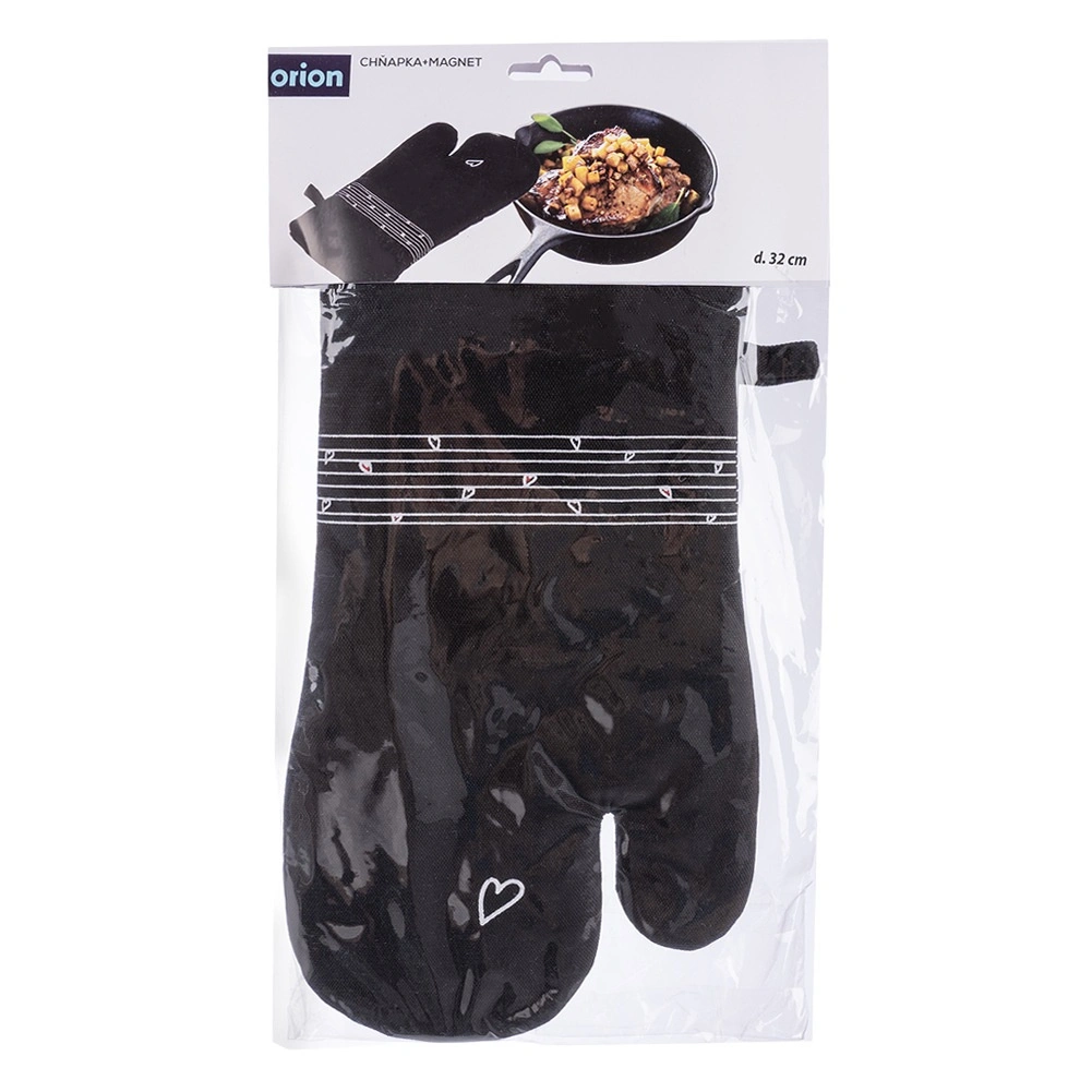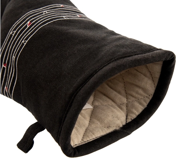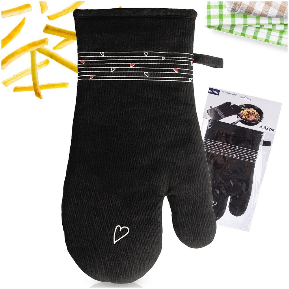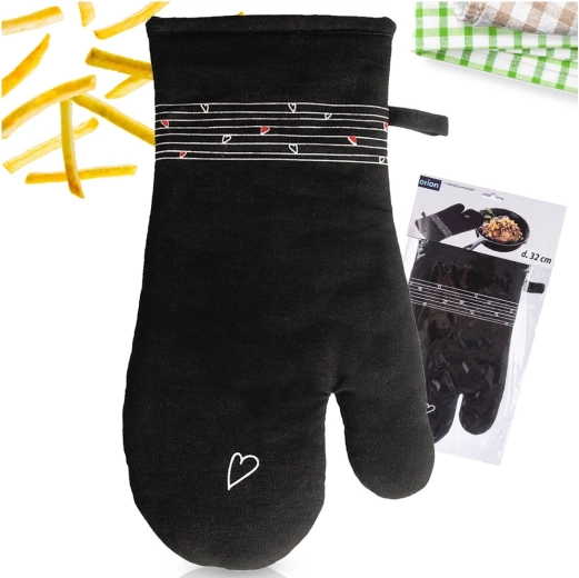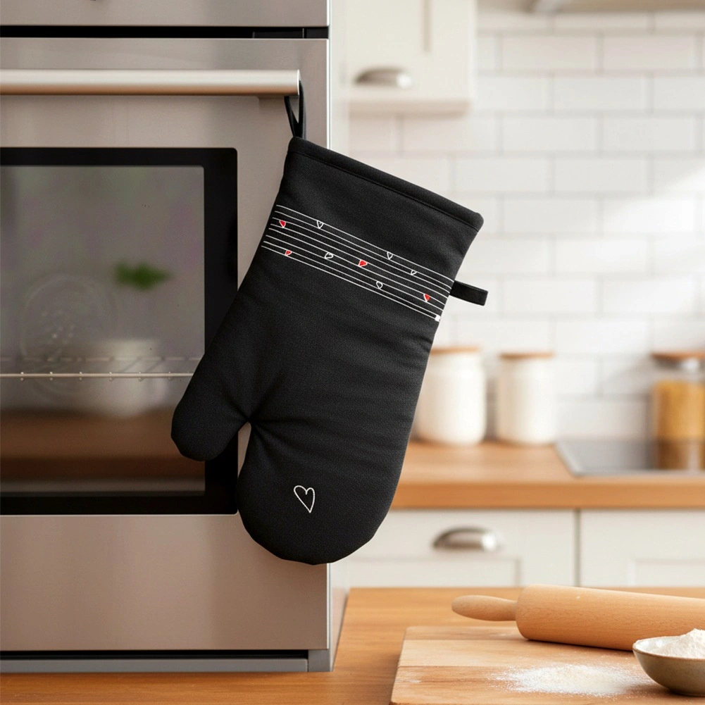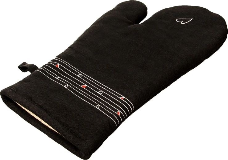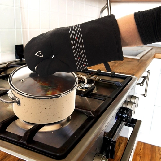 Ez a strapabíró pamut kesztyű nélkülözhetetlen segítőtárs főzéshez és sütéshez. Minőségi steppelésének és puha bélésének köszönhetően megbízható hővédelmet nyújt, és kényelmesen illeszkedik a kézre. Az elegáns fekete dizájn visszafogott szívmintával bármely konyhába illik.