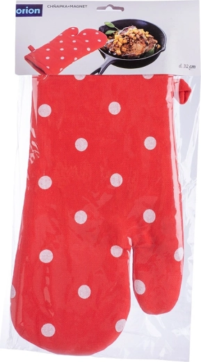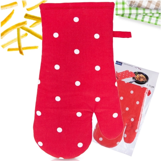 Ez a stílusos, fehér pöttyös piros sütőkesztyű kiváló minőségű 100% pamutból készült, és megbízható hővédelmet nyújt forró tepsik, sütőtálak és edények kezelésekor. Az univerzális méretnek köszönhetően kényelmesen illeszkedik jobb és bal kézre is, a biztos fogást pedig a steppelt, lágyan párnázott kialakítás garantálja.