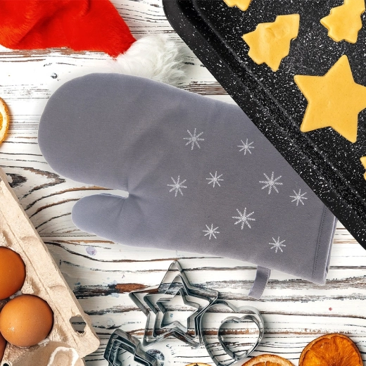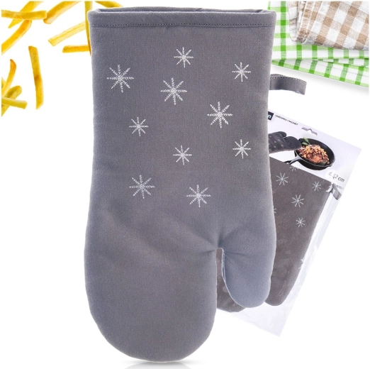 Stílusos és funkcionális, pamutból készült edényfogó diszkrét hópelyhes mintával, amely megóvja a kezet a forró tepsik, edények és sütőtálak kezelésekor. A puha párnázás és a kéz teljes fedése biztonságos fogást és kényelmet nyújt a mindennapi főzés során.