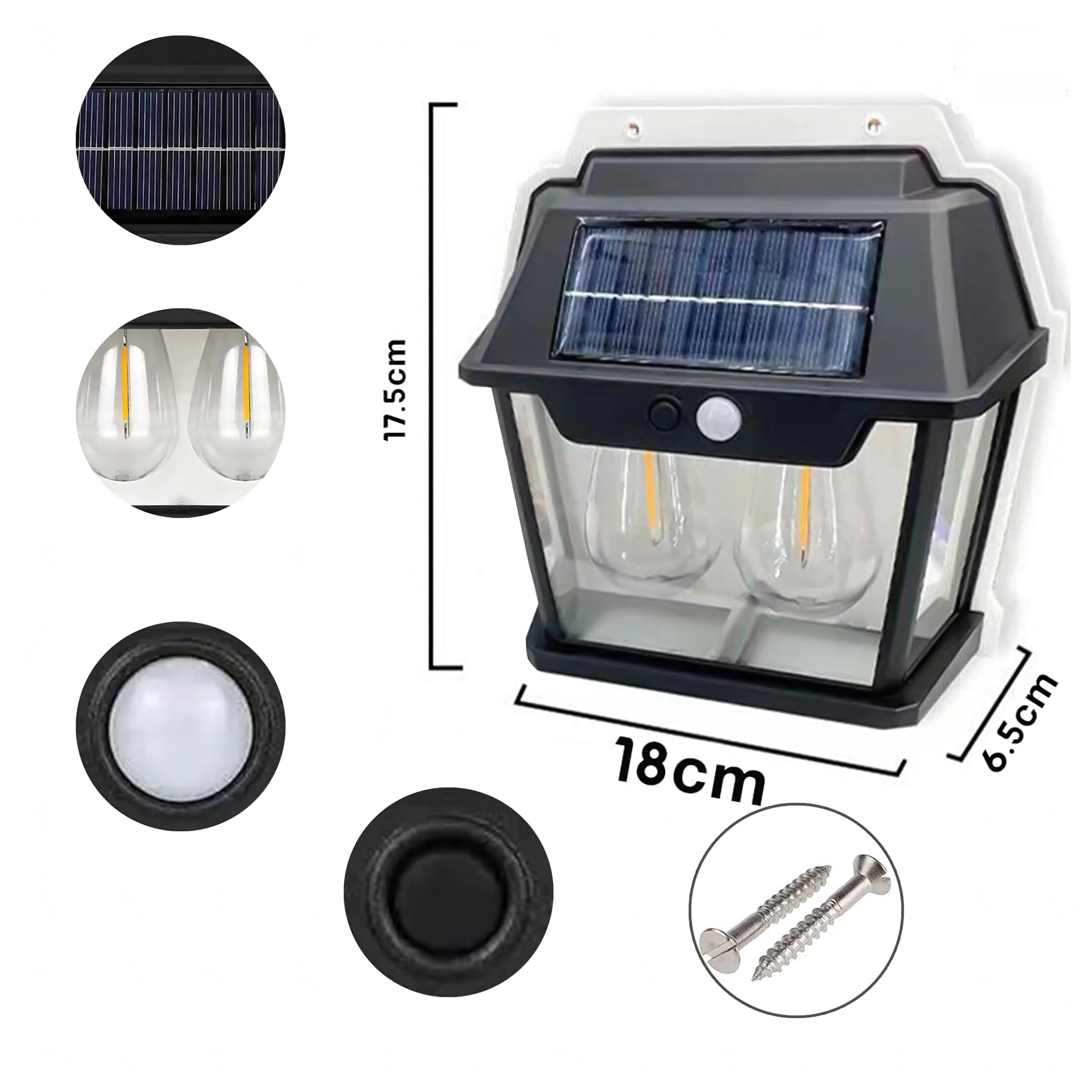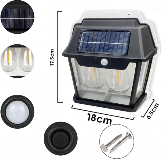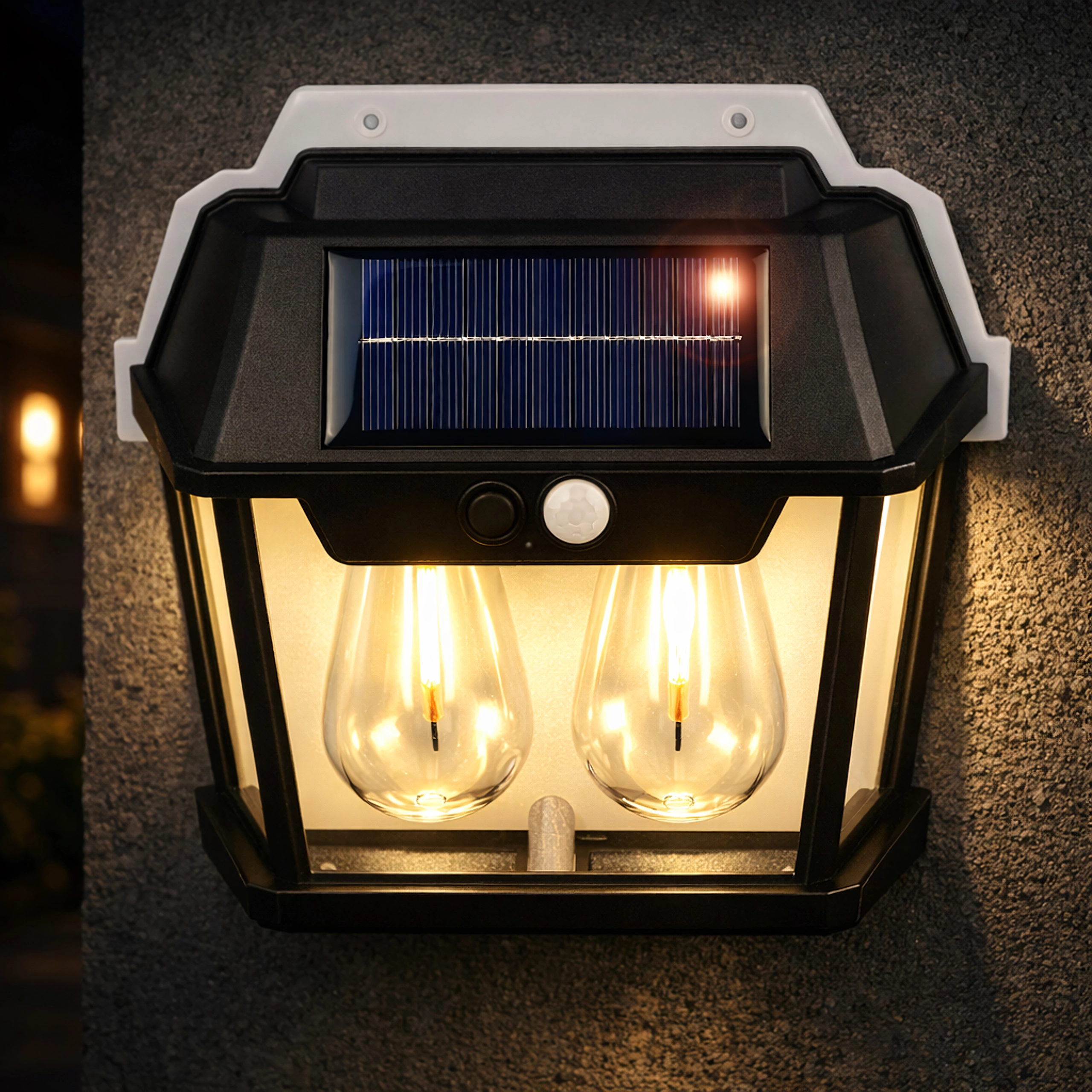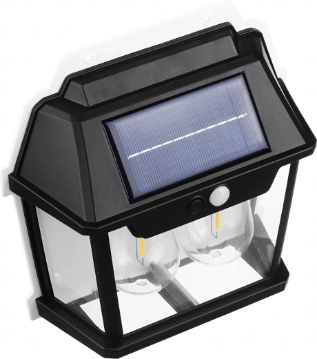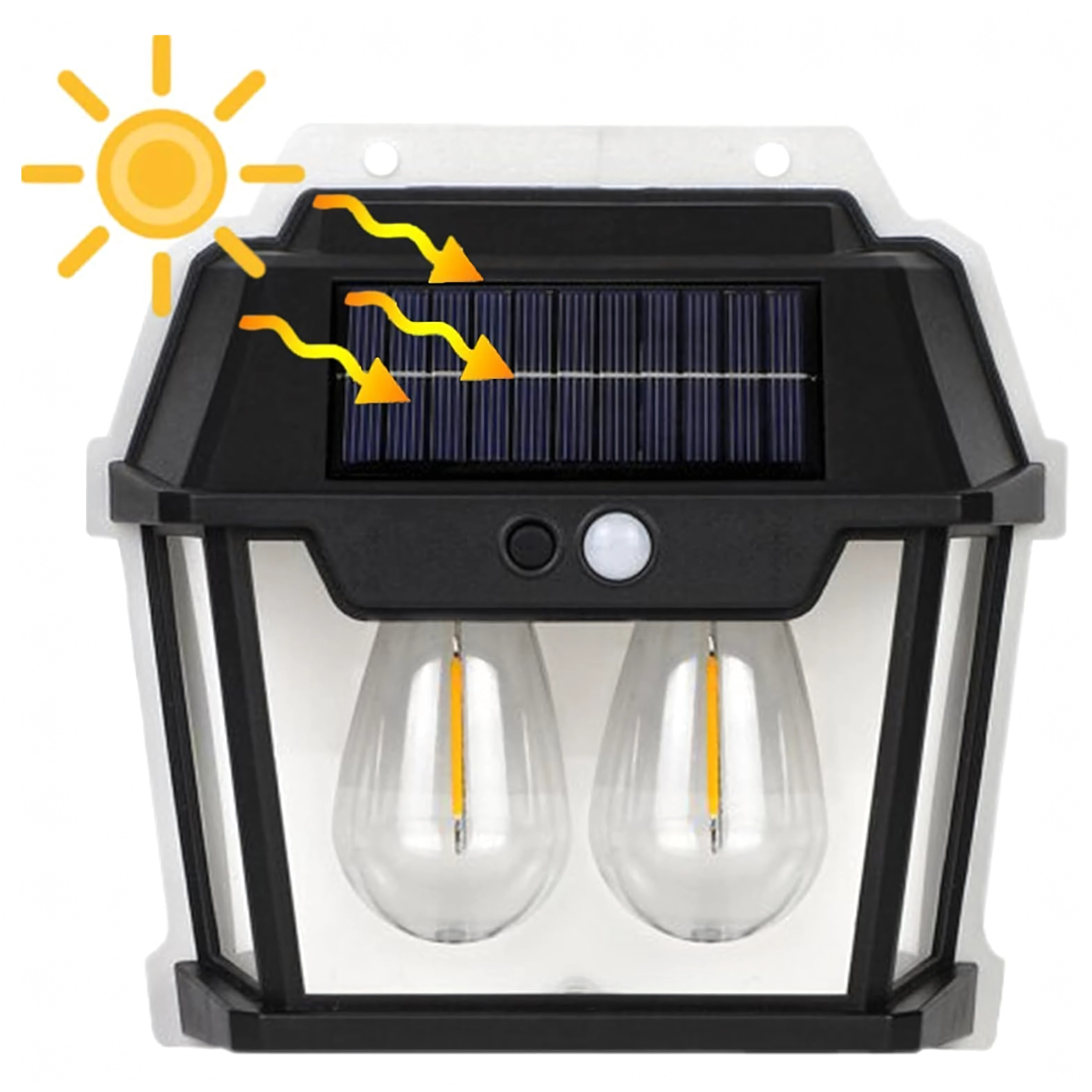 Stílusos kültéri napelemes lámpa, amely a klasszikus lámpás megjelenést modern technológiával ötvözi. A beépített napelemnek és a PIR mozgásérzékelőnek köszönhetően a fény alkonyatkor automatikusan bekapcsol, mozgás észlelésekor pedig felerősödik. A dupla LED filamentek kellemes, meleg fehér fényt bocsátanak ki, ideális bejáratokhoz, teraszokra, kerti utakhoz és kapukhoz. Kábelek nélkül, energiahatékony működés és időjárásállóság a kültéri világítás biztonságos és kényelmes megoldásához.