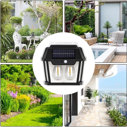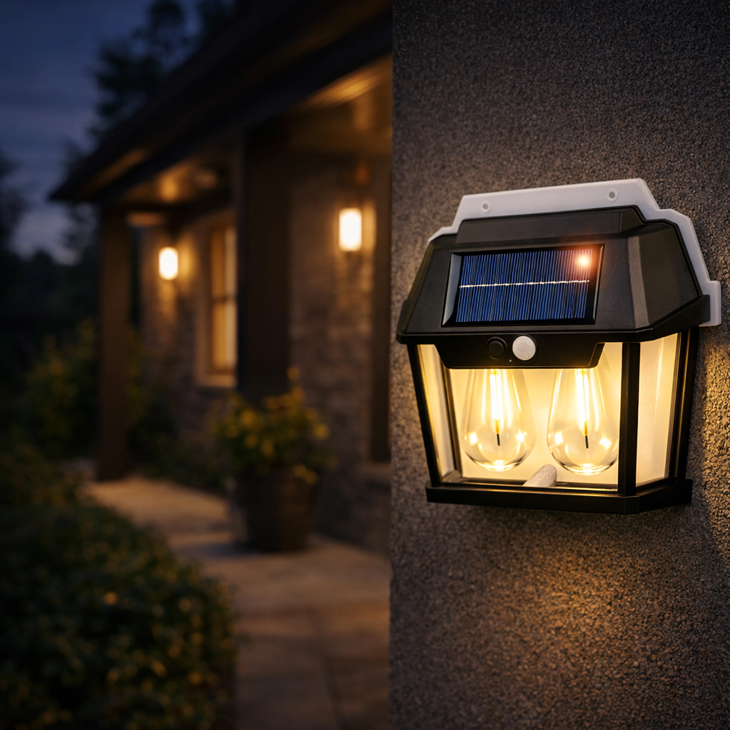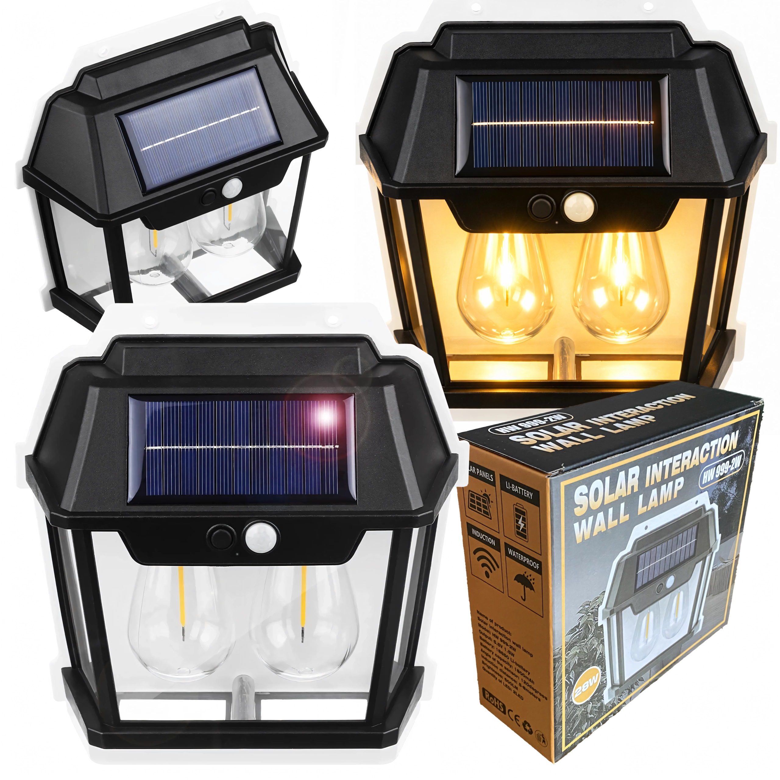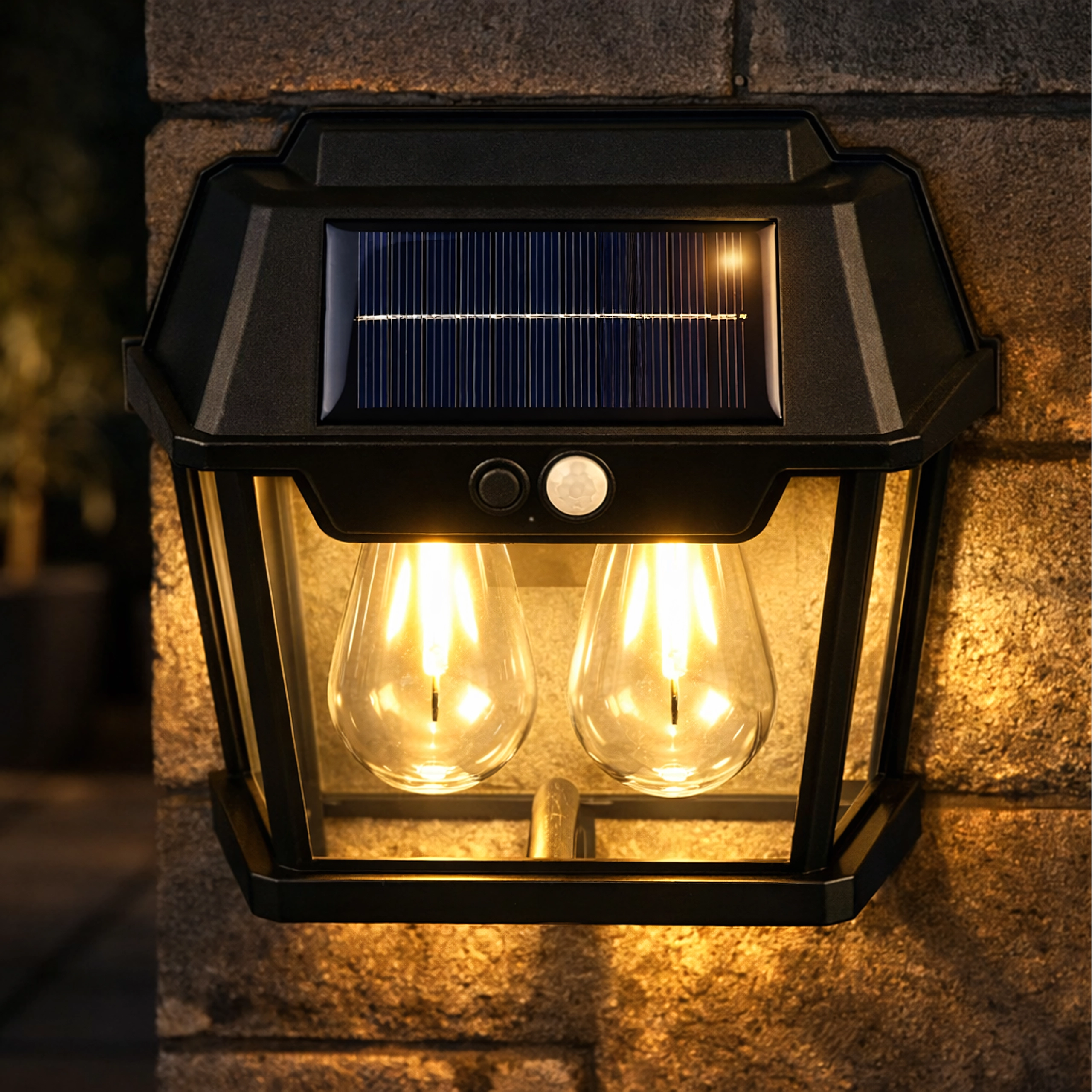 Stílusos kültéri napelemes lámpa, amely a klasszikus lámpás megjelenést modern technológiával ötvözi. A beépített napelemnek és a PIR mozgásérzékelőnek köszönhetően a fény alkonyatkor automatikusan bekapcsol, mozgás észlelésekor pedig felerősödik. A dupla LED filamentek kellemes, meleg fehér fényt bocsátanak ki, ideális bejáratokhoz, teraszokra, kerti utakhoz és kapukhoz. Kábelek nélkül, energiahatékony működés és időjárásállóság a kültéri világítás biztonságos és kényelmes megoldásához.