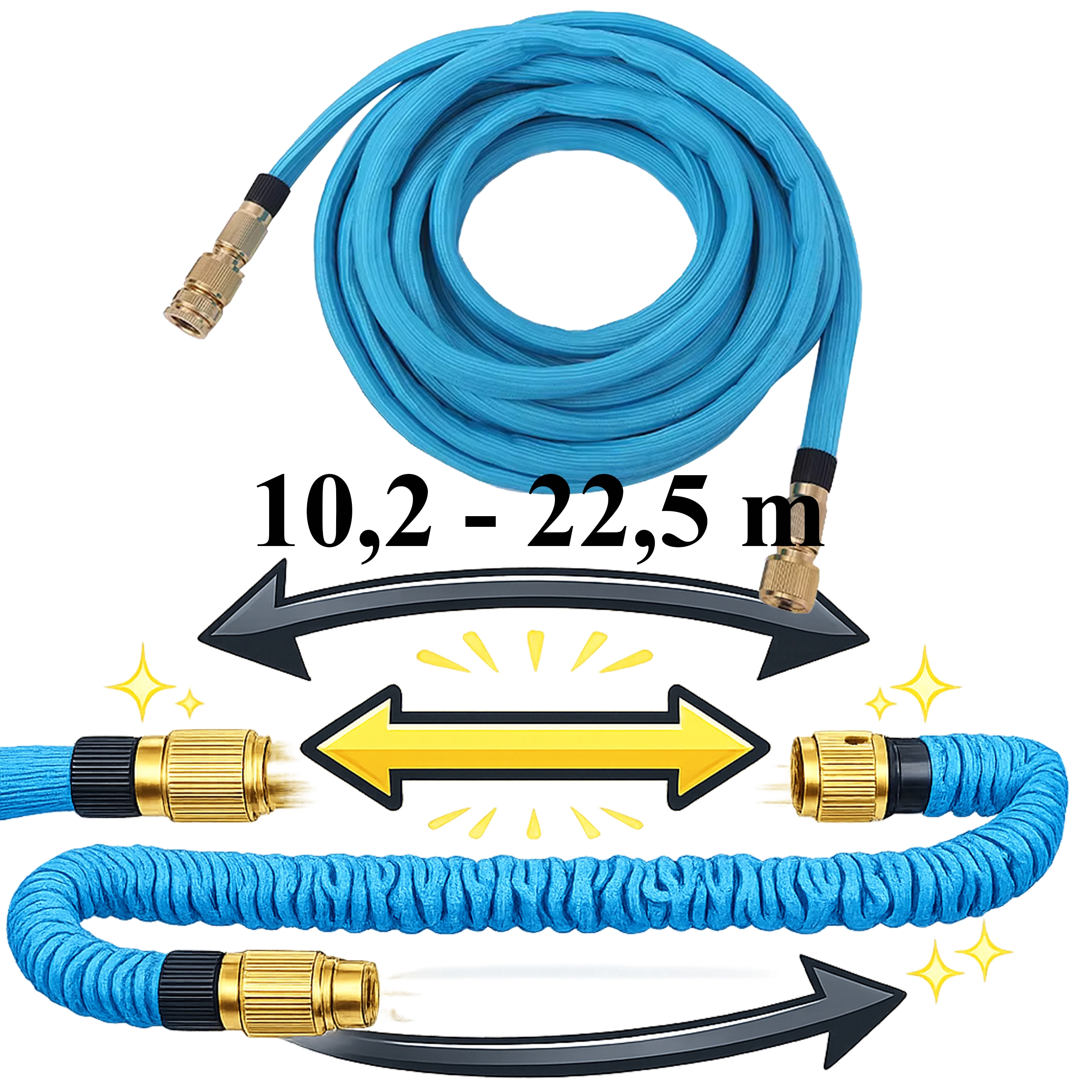Ez a rugalmasan nyúló tömlő alacsony tömeget és magas tartósságot ötvöz. Vízráengedéskor automatikusan akár 22,5 m-re hosszabbodik, elzárás után pedig visszatér a kompakt hosszra, így könnyen elhelyezhető tartón vagy dobozban. A réz csatlakozók bordázott fogással szilárd, tömített és korrózióálló kapcsolatot biztosítanak.