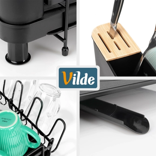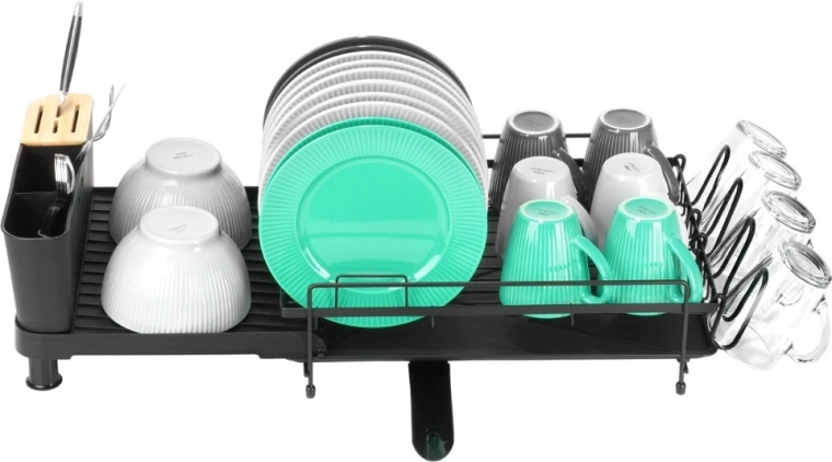 A praktikus, kivehető csepegtetőtálca kihajtható kifolyóval szabályozottan vezeti a vizet a mosogatóba, hogy a felület mindig száraz és tiszta maradjon. A háromrekeszes evőeszköztartó külön választja a kanalakat, villákat és késeket a gyorsabb száradás érdekében; a speciális rekesz bambusz késrendezővel védi az éleket és növeli a biztonságot. A dedikált vájatok akár 12 tányért is befogadnak, külön zóna van a tálaknak, valamint akasztók bögrékhez és poharakhoz.