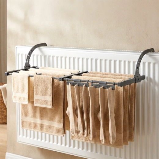 - Helytakarékos – radiátorra szerelhető, összecsukható kialakítás, kompakt tárolás.