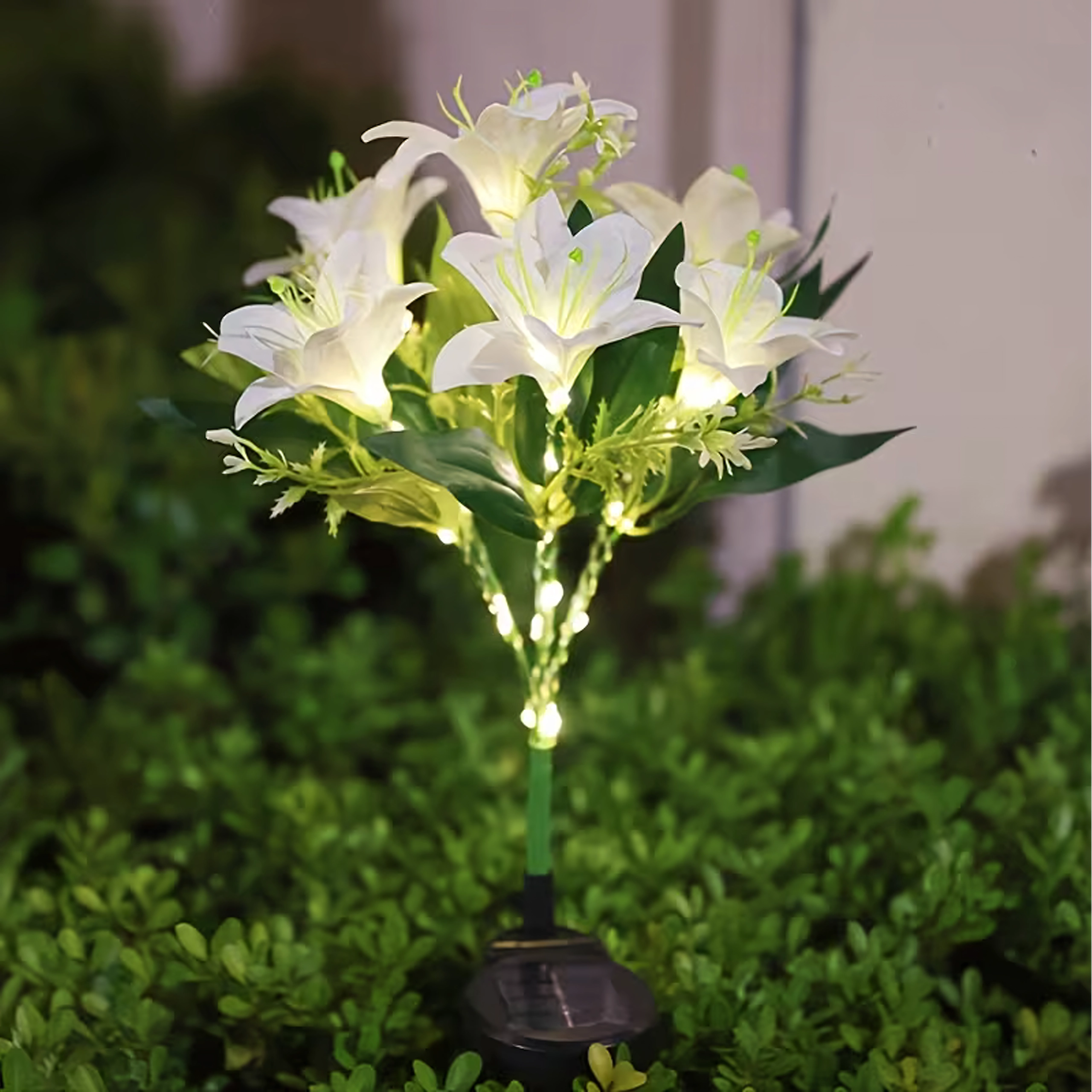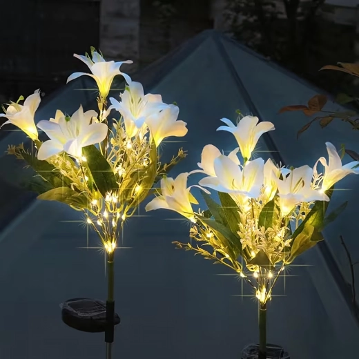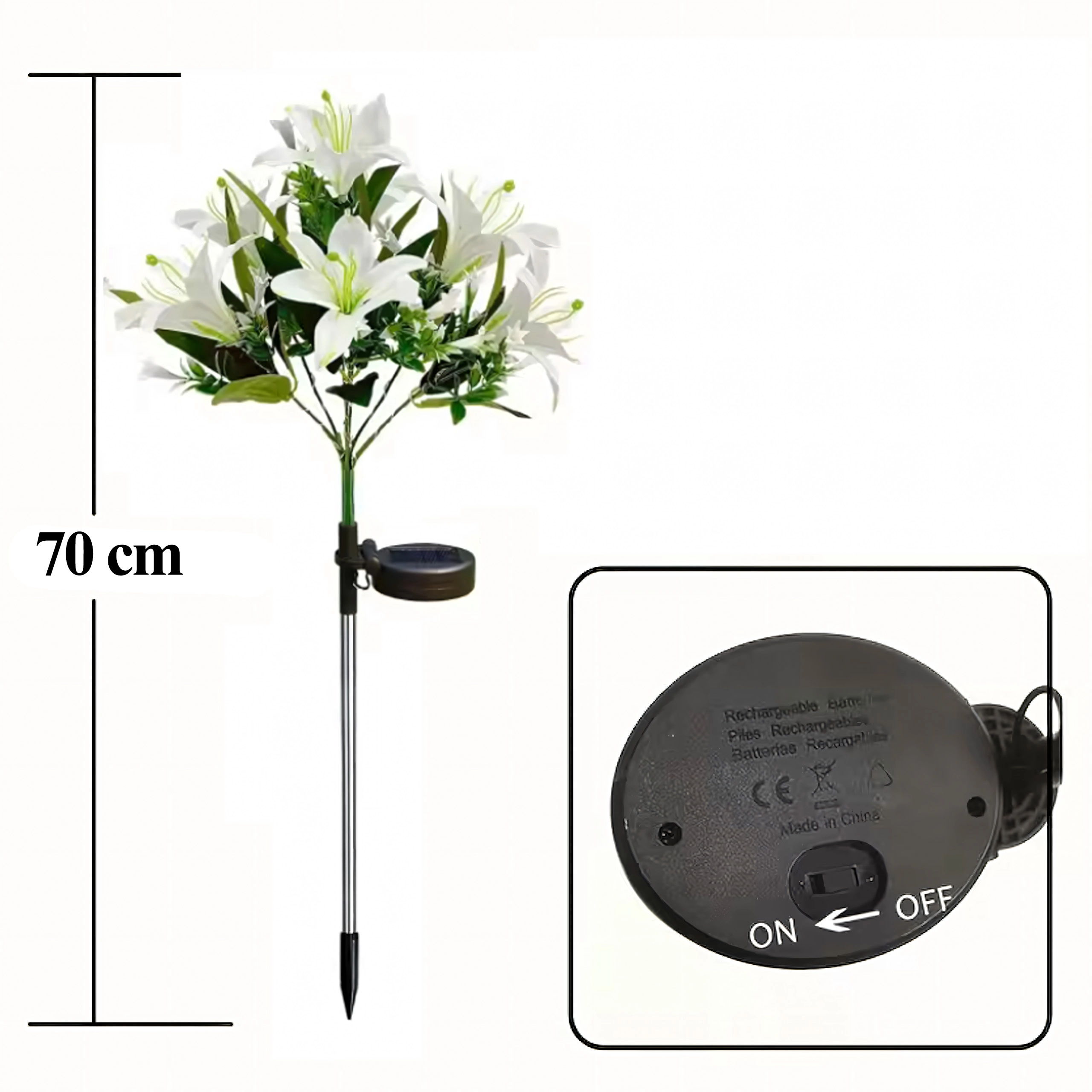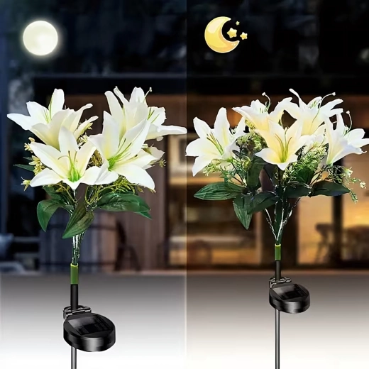 A dekoratív, liliom alakú napelemes lámpa kellemes, meleg fénnyel ragyogja be kertjét, erkélyét vagy teraszát. A napenergiának köszönhetően nappal töltődik, estétől pedig automatikusan felgyullad. Strapabíró kivitel, élethű virágok és egyszerű telepítés egyetlen földbe szúrással – stílusos, karbantartásmentes kültéri dekoráció takarékos LED-ekkel és automatikus sötétedésérzékelős világítással.