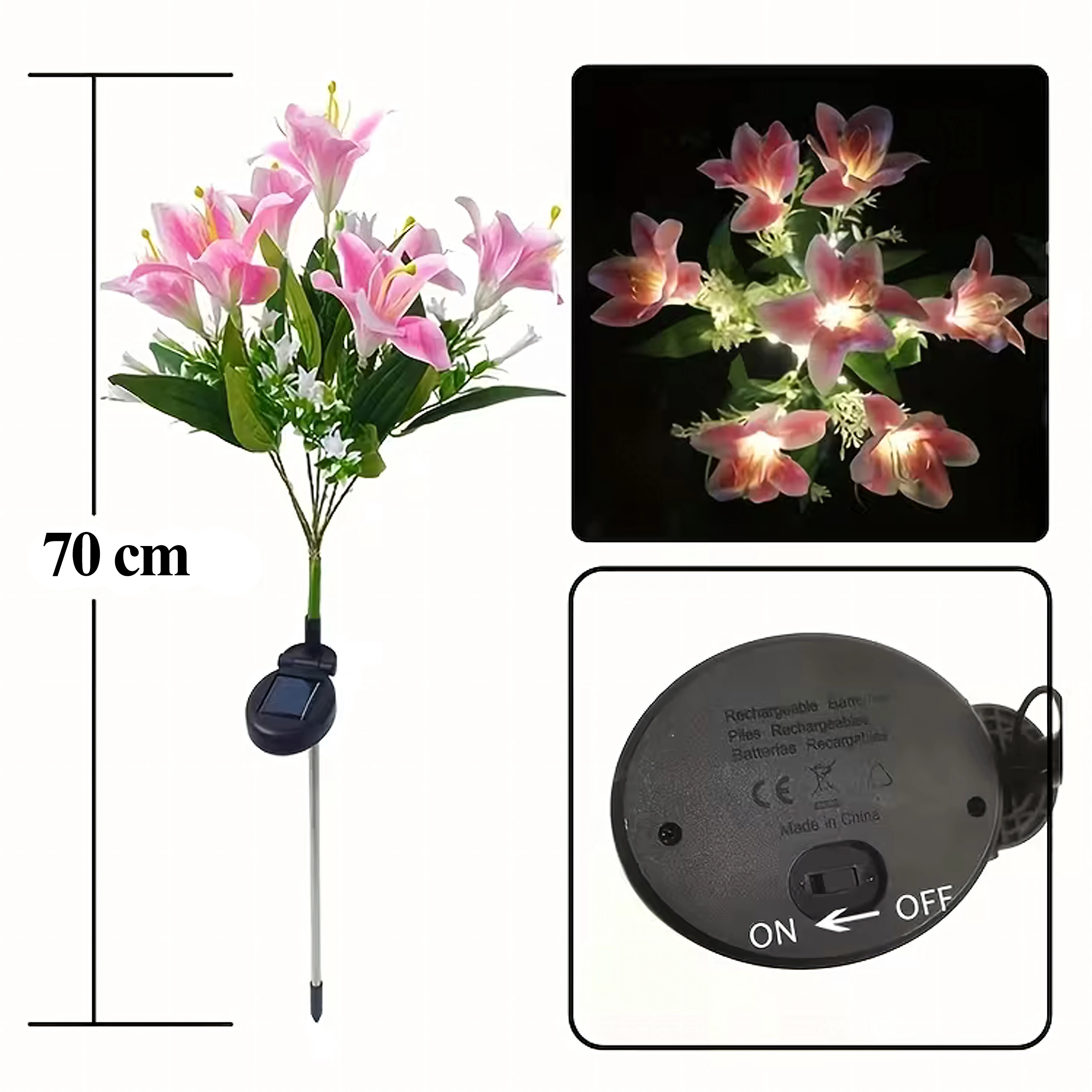 Dobja fel ágyását vagy járdáját stílusos dekorral – ez a liliom formájú napelemes kerti lámpa ötvözi a élethű virágokat, a meleg fehér LED-eket és a karbantartásmentes napelemes működést. A földbe szúrva egyszerűen telepíthető, nappal tölt, éjjel pedig automatikusan világít. Időjárásálló, egész éves kültéri használatra.