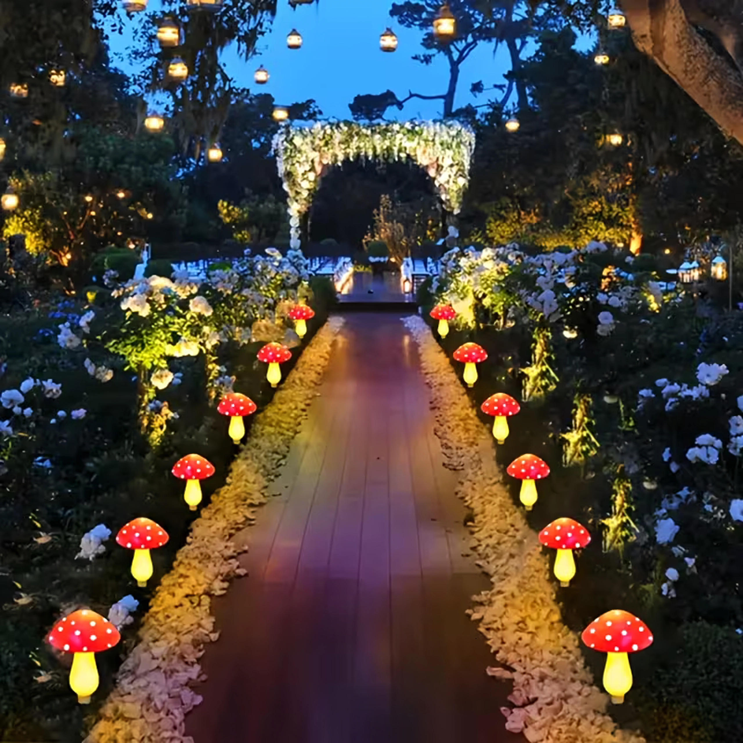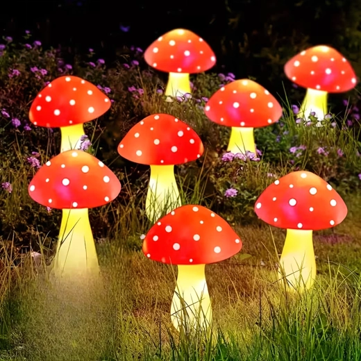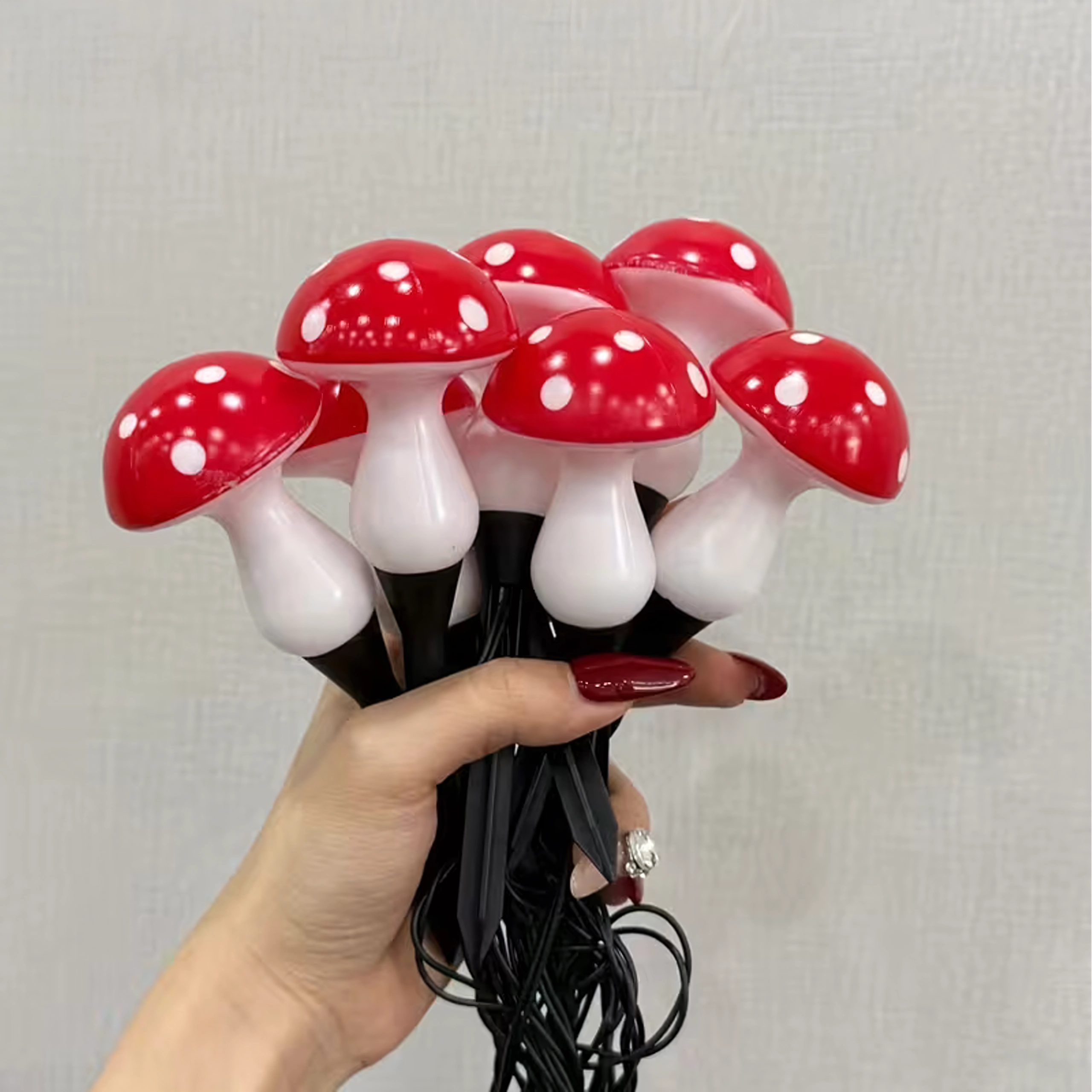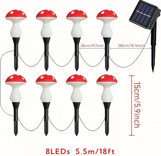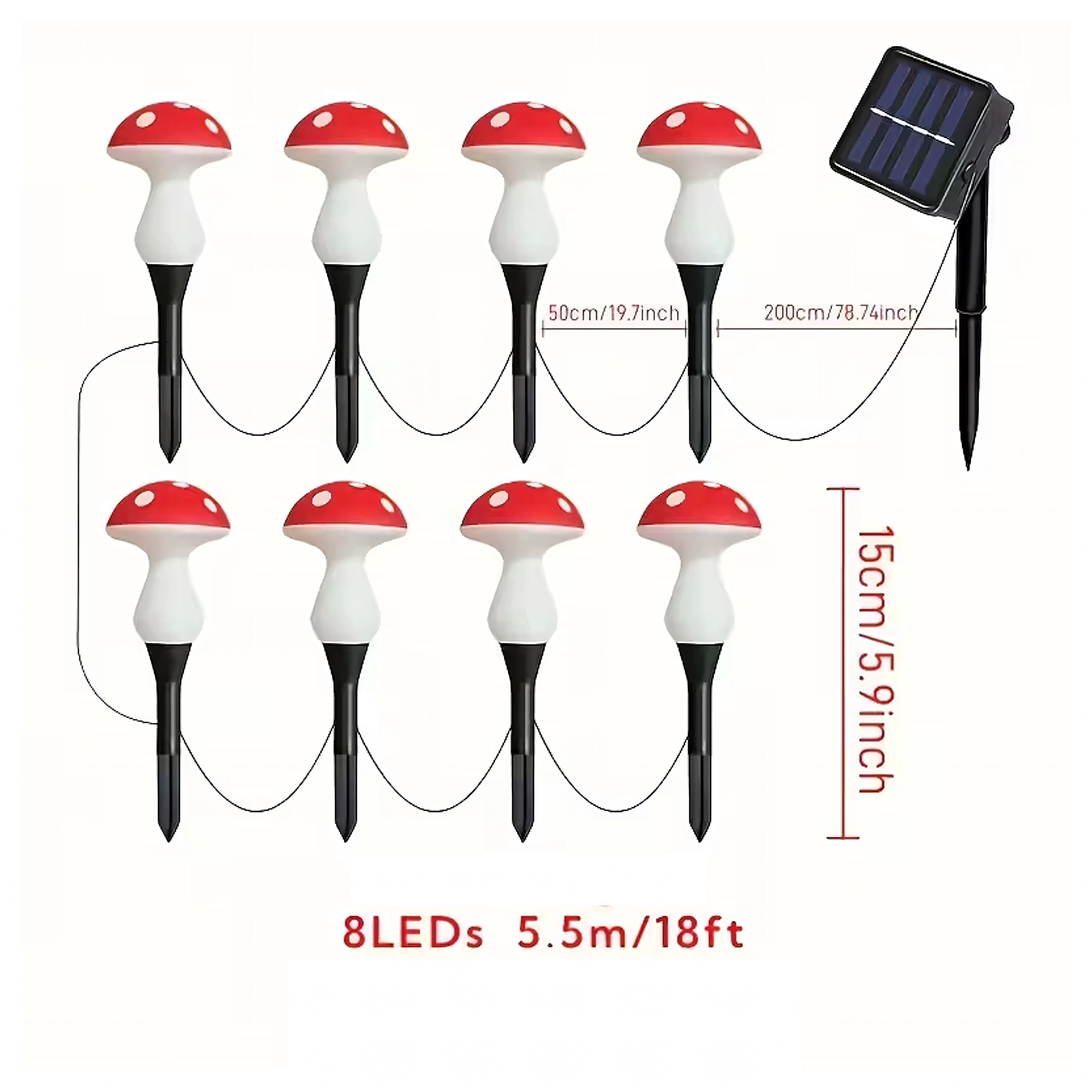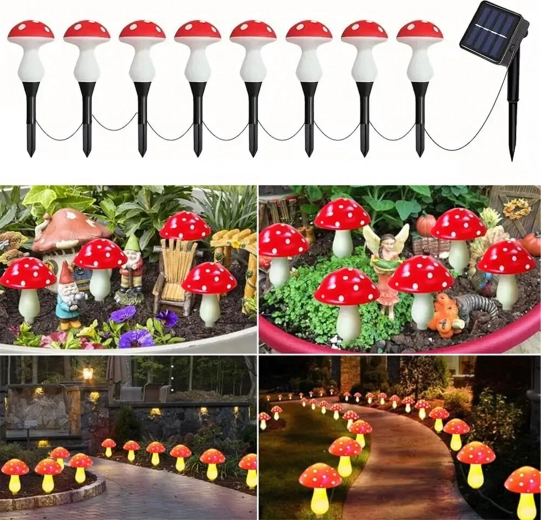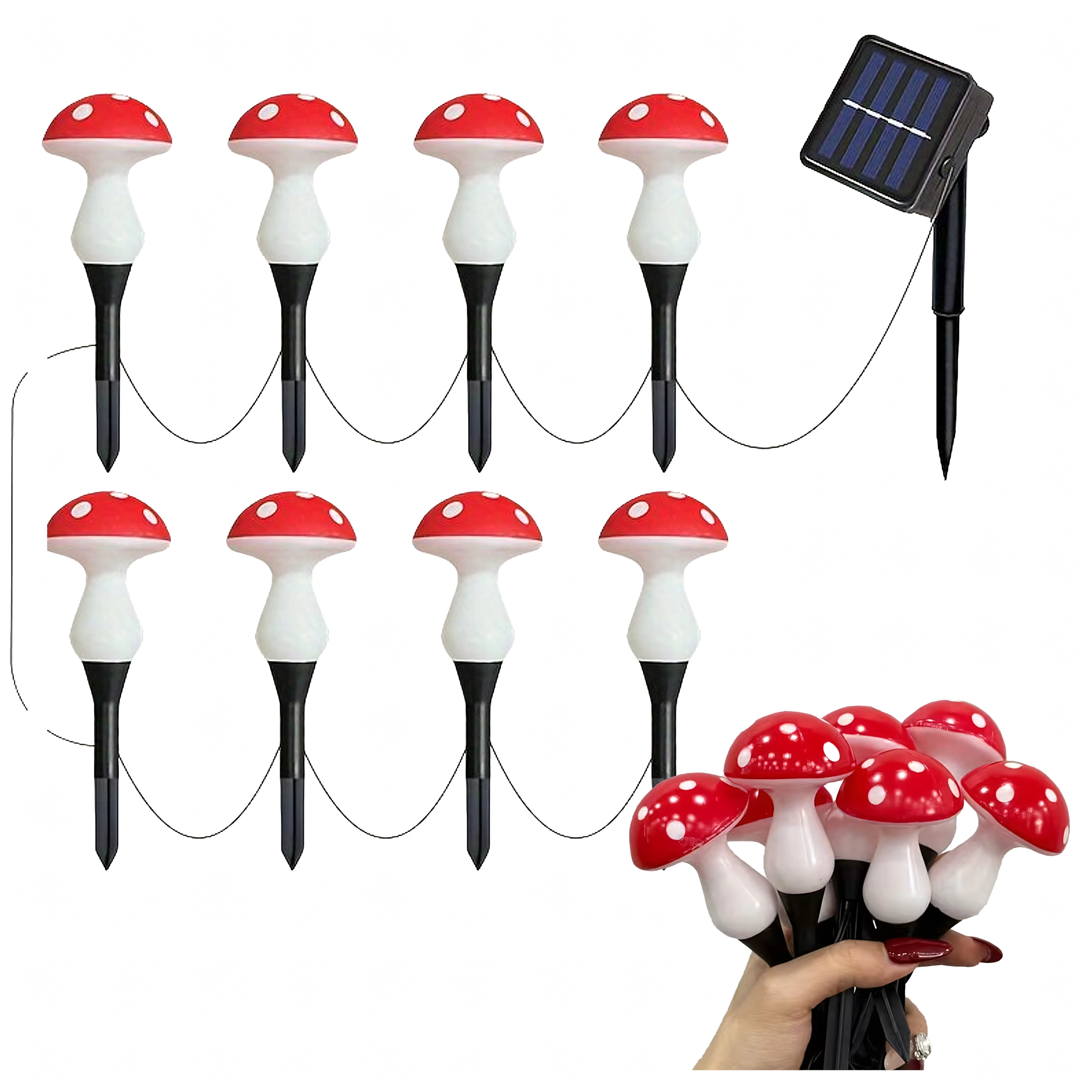 Varázsoljon mesés hangulatot az ágyásokba, ösvényekre és virágládákba bájos, légyölő galóca formájú fényekkel. A készlet 8 darab napelemes LED fényt kínál 5,5 m-es kábelen, meleg, kellemes fénnyel, automatikus éjszakai felkapcsolással és kültéri használatra tervezett tartóssággal – hálózati kábelezés és gond nélkül.
