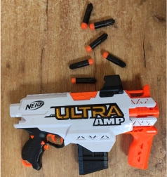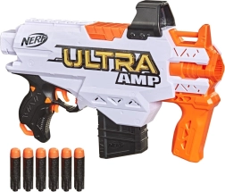 A NERF Ultra AMP motoros blaster könnyű, egyszerűen kezelhető és készen áll az akciódús csatákra. A 6 nyilat befogadó tárnak, az integrált irányzéknak és az Aerofin technológiájú Nerf Ultra nyilaknak köszönhetően akár 36 m távolságra is ellő, és gyors, pontos lövést biztosít.