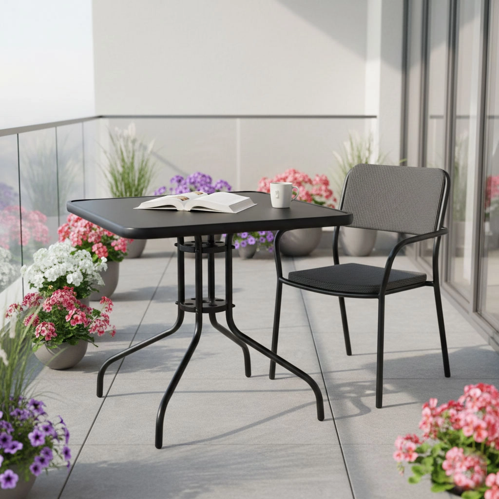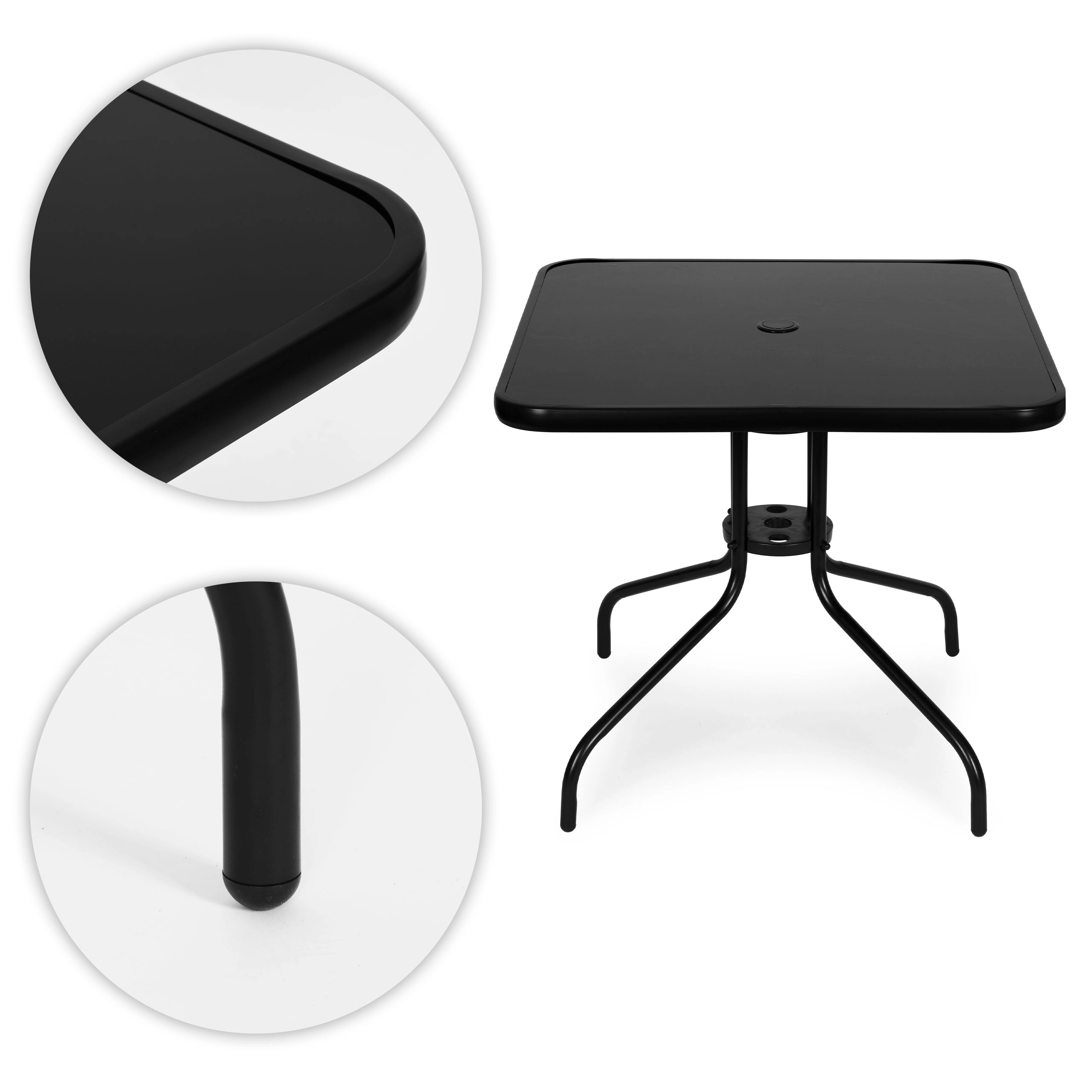 Az asztalt a kényelem és a praktikusság jegyében tervezték: a központi napernyőnyílás (4,5 cm) árnyékot ad a forró napokon, ha pedig nincs rá szükség, a mellékelt kupakkal lezárható. A felületek könnyen tisztíthatók, a porszórt acél pedig megbízhatóan ellenáll a nedvességnek és a korróziónak.