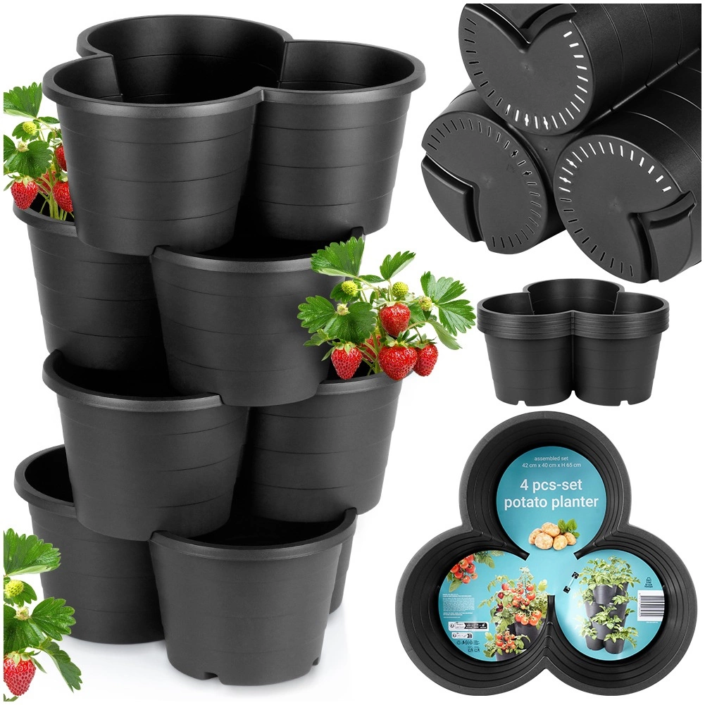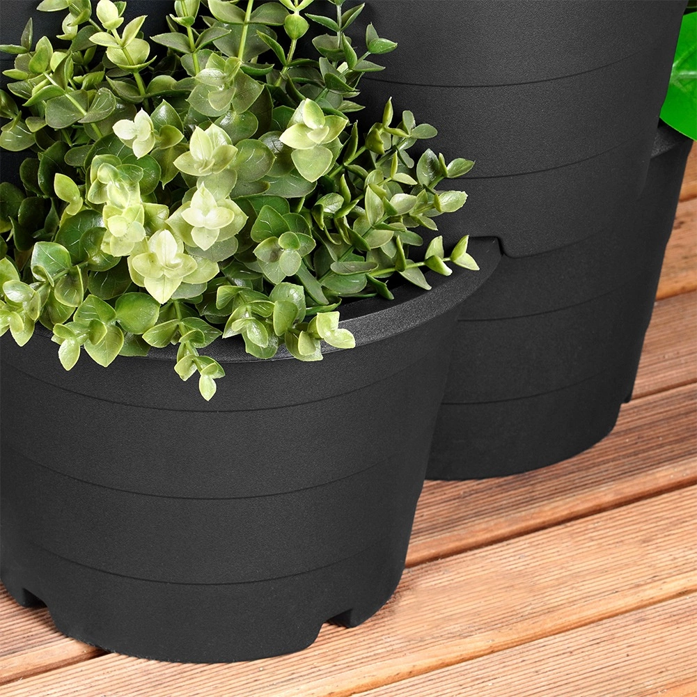Minden elem három különböző növényt képes befogadni, és integrált drénnyílásokkal rendelkezik, amelyek elvezetik a felesleges vizet. A tartós fekete műanyag könnyen tisztítható, ellenáll az esőnek, szélnek és az UV-sugárzásnak, így a virágtartók egész évben használhatók a szabadban.