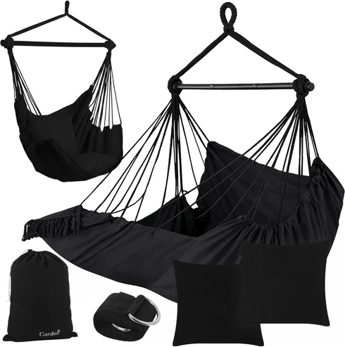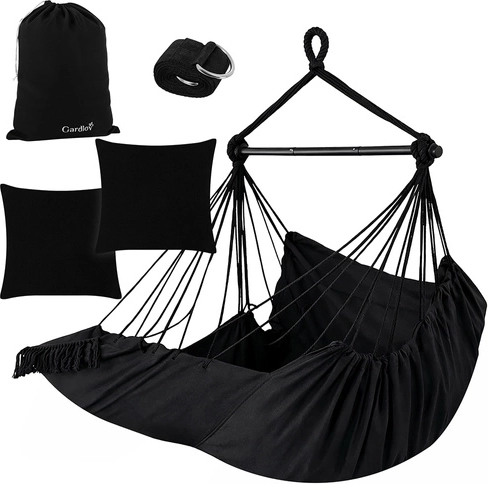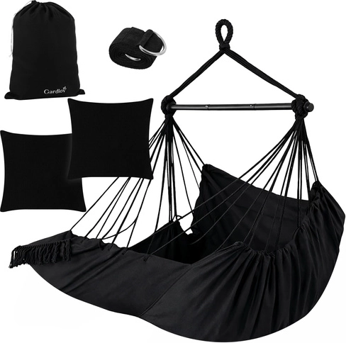A GARDLOV brazil függőszék meghitt, nyugodt zónává varázsolja az erkélyt, a kertet és a nappalit. A 320 g/m² sűrűségű, erős pamutszövet, a stabil fém terpesztőrúd és a 150 kg teherbírás biztonságot és kényelmet nyújtanak. A csomagban 2 puha párna, függesztő heveder és szállítózsák is található az egyszerű hordozáshoz.