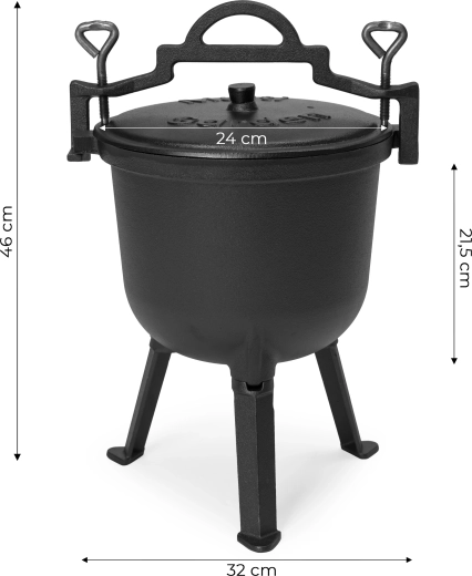 A készlet 3 részből áll: bogrács, fedő és állvány háromlábbal a tűz feletti stabilitáshoz. A levehető lábak megkönnyítik a tárolást és a szállítást, eltávolításuk után a bogrács gáztűzhelyen is használható. A szellőzőnyílásos fedő segít szabályozni a nyomást és fenntartani az ideális főzési feltételeket.