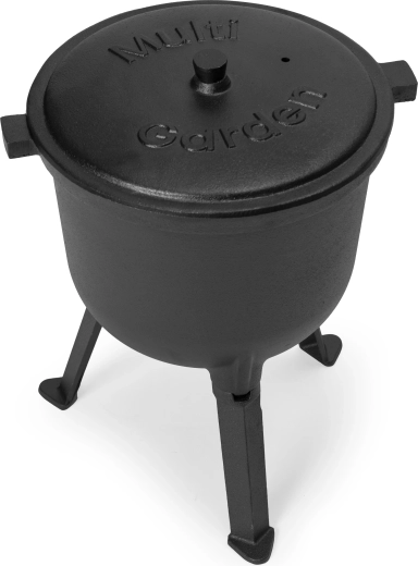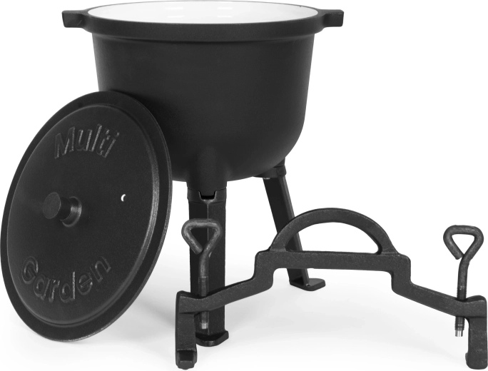 Masszív, 8 literes öntöttvas bogrács MULTIGARDEN állvánnyal, ideális kerti főzéshez, tábortűzhöz és kempinghez. A zománcozott belső könnyen tisztítható, az öntöttvas kiváló hővezetése pedig egyenletes párolást, főzést és sütést biztosít. A bogrács levehető lábakkal rendelkezik a kényelmes szállításhoz, biztonságos füllel az áthelyezéshez, valamint szellőzőnyílásos fedővel a főzés jobb kontrolljáért.