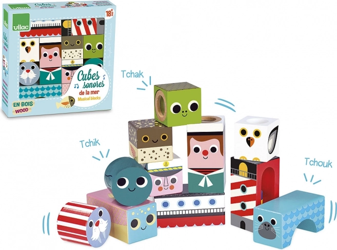 A szenzoros, tengeri motívumú fa kockák örömteli felfedezést kínálnak a formák, színek és hangok világában. Rázás és építés közben a gyerekek gyakorolják a fogást, a koordinációt és a koncentrációt, miközben a különböző hangot adó elemek fejlesztik hallási észlelésüket. Ingela P. Arrhenius illusztrációi egyedi, retró hangulatot és játékos karaktert kölcsönöznek a szettnek.