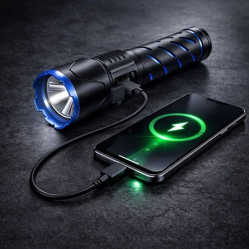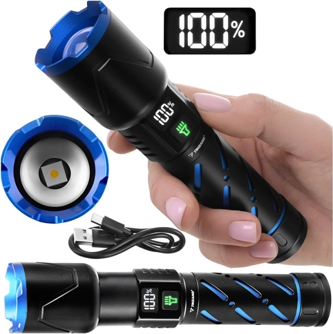 A tartós alumínium konstrukció texturált markolattal és recézett fejkoronával megkönnyíti a kezelést kesztyűben vagy nedves körülmények között is. A csomagban csuklópánt és USB kábel is található a kényelmes töltéshez otthon és terepen.
