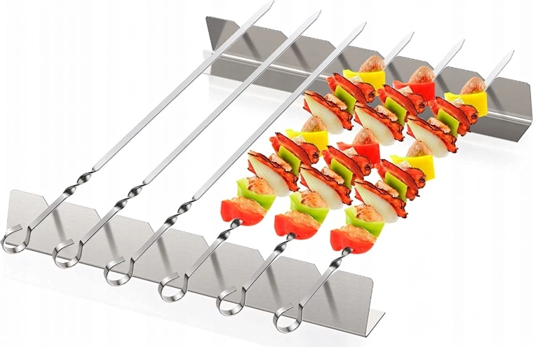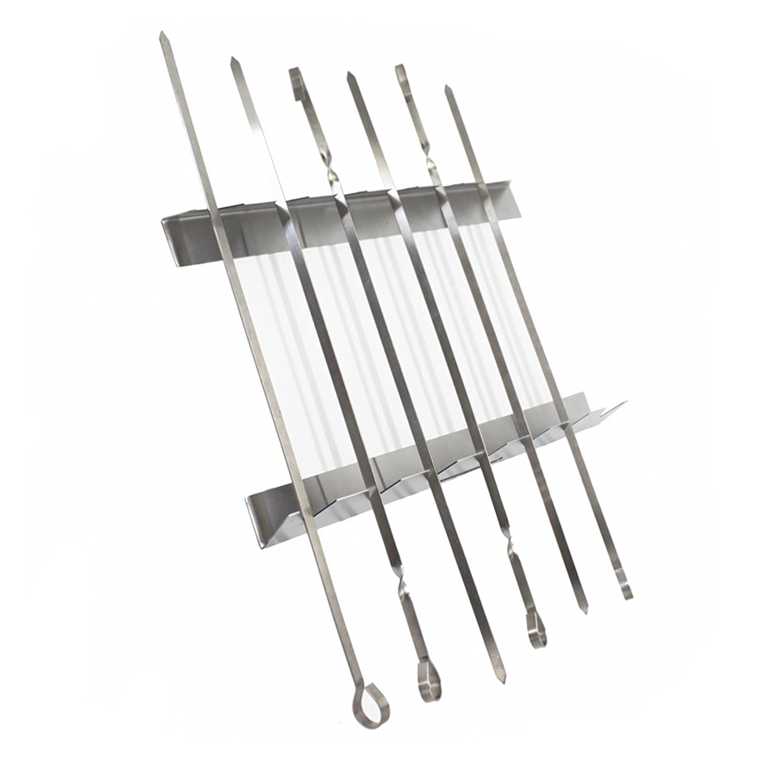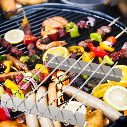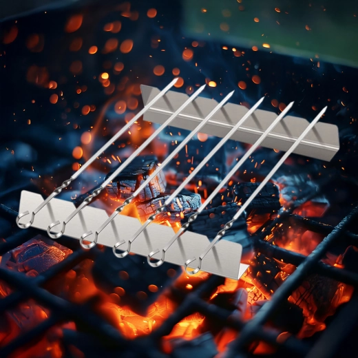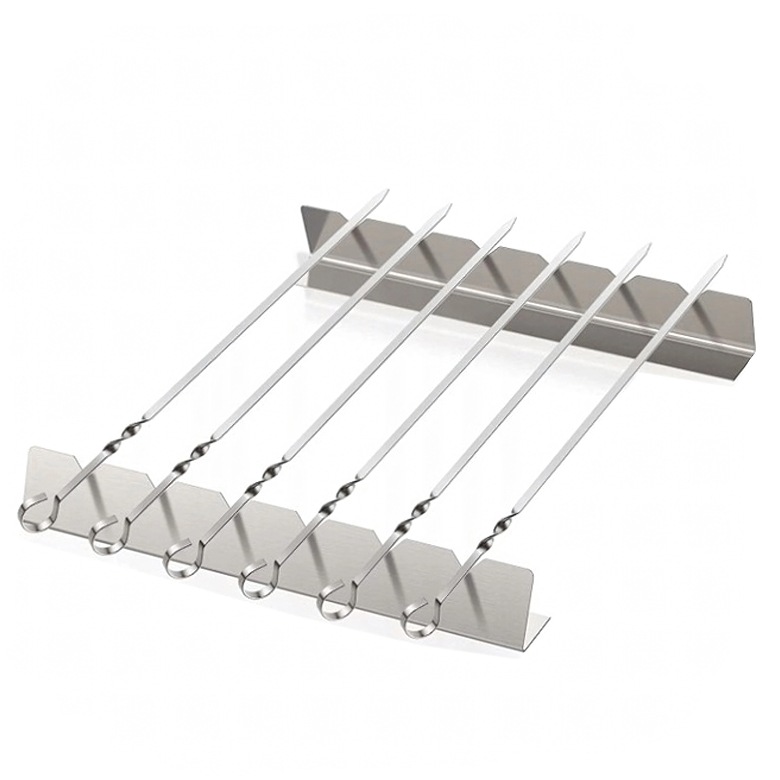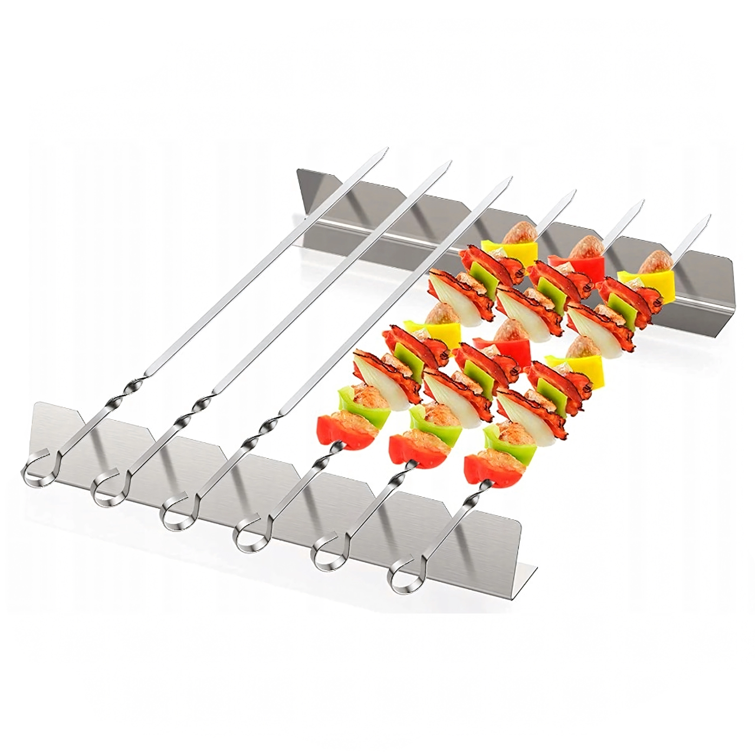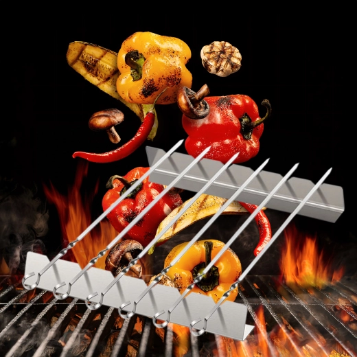 Ez a minőségi rozsdamentes acél nyárskészlet kényelmes és egyenletes grillezésre készült húsokhoz, zöldségekhez és tenger gyümölcseihez. A lapos pengék megakadályozzák az alapanyagok elfordulását, míg a magasságban elkülönített állvány a nyársakat a parázs fölött tartja az egyenletes átsülésért odaégés nélkül.
