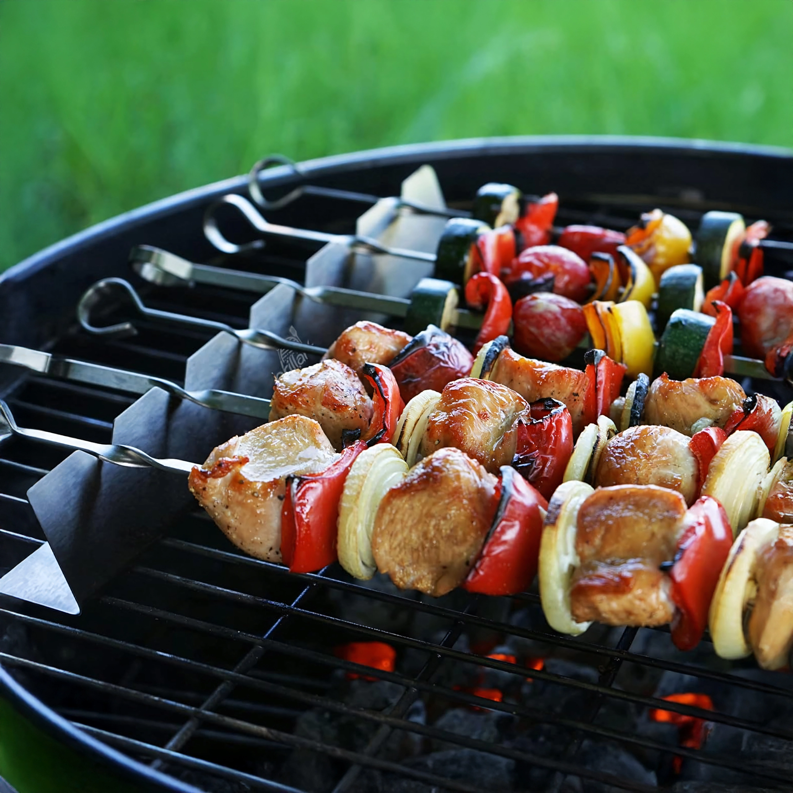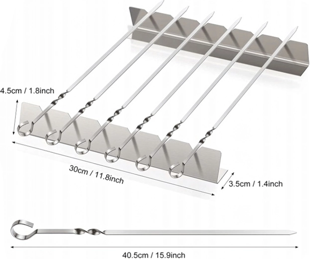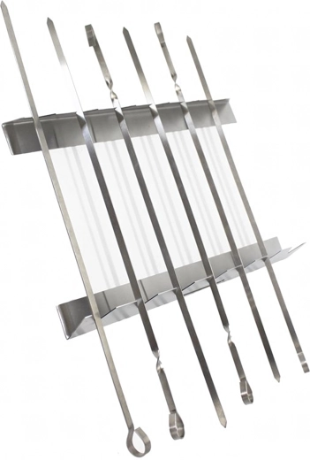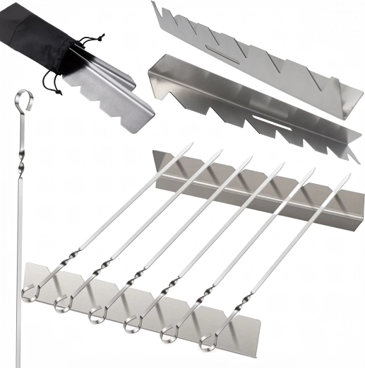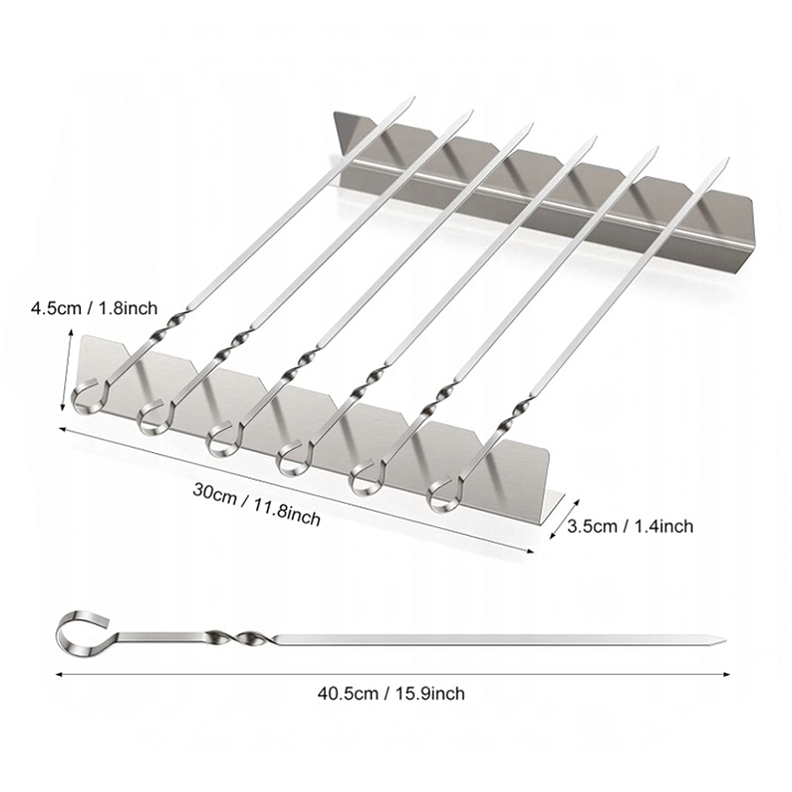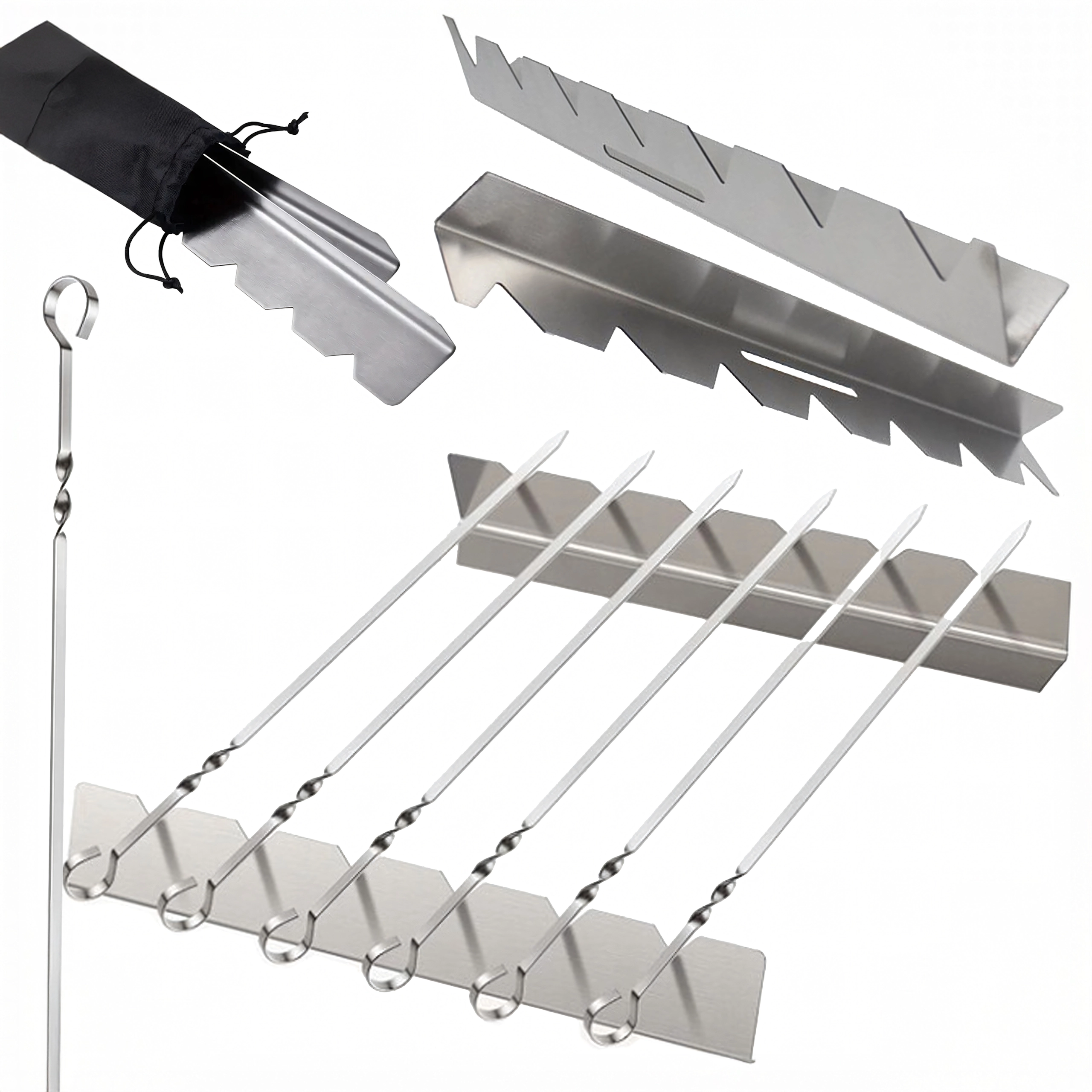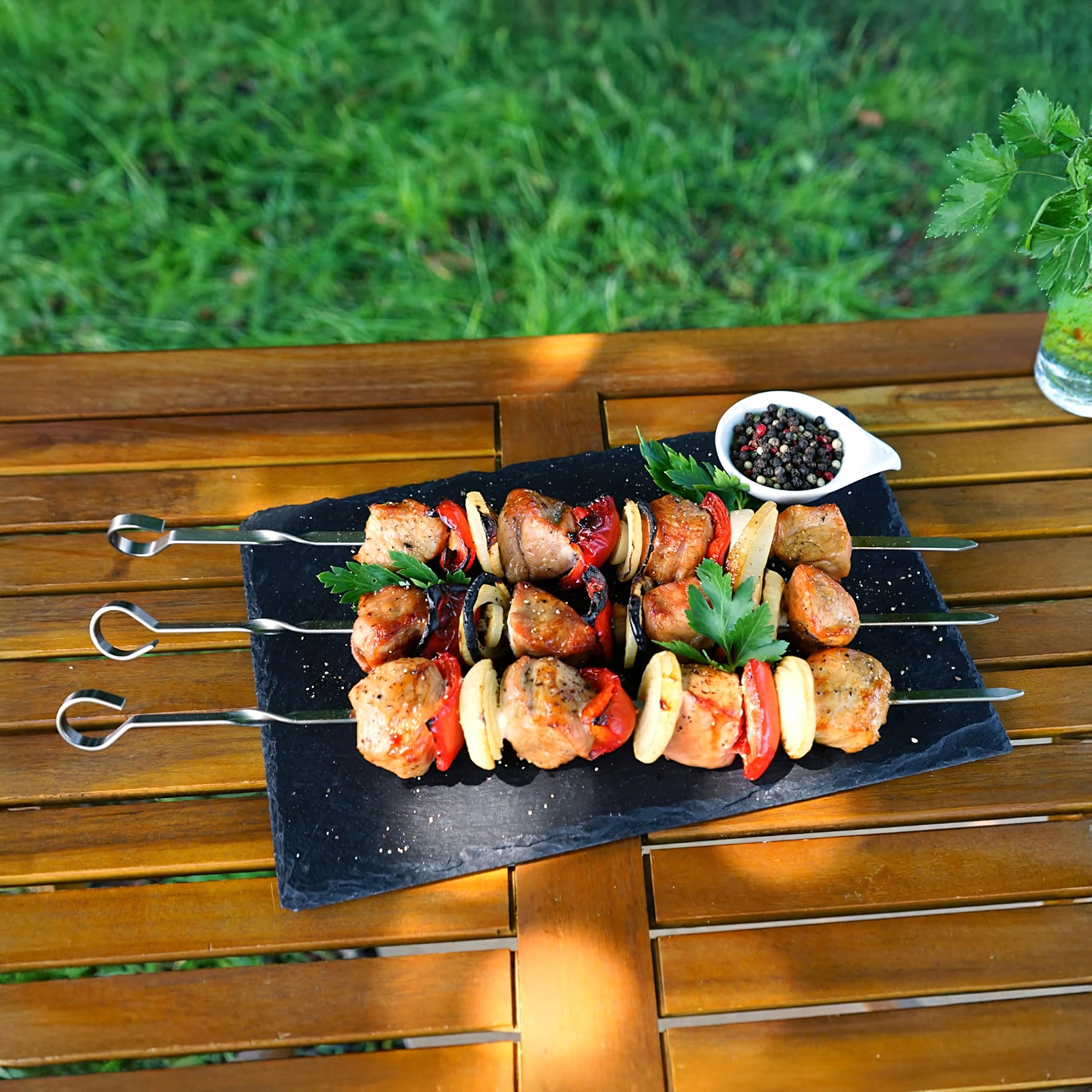 Ez a minőségi rozsdamentes acél nyárskészlet kényelmes és egyenletes grillezésre készült húsokhoz, zöldségekhez és tenger gyümölcseihez. A lapos pengék megakadályozzák az alapanyagok elfordulását, míg a magasságban elkülönített állvány a nyársakat a parázs fölött tartja az egyenletes átsülésért odaégés nélkül.