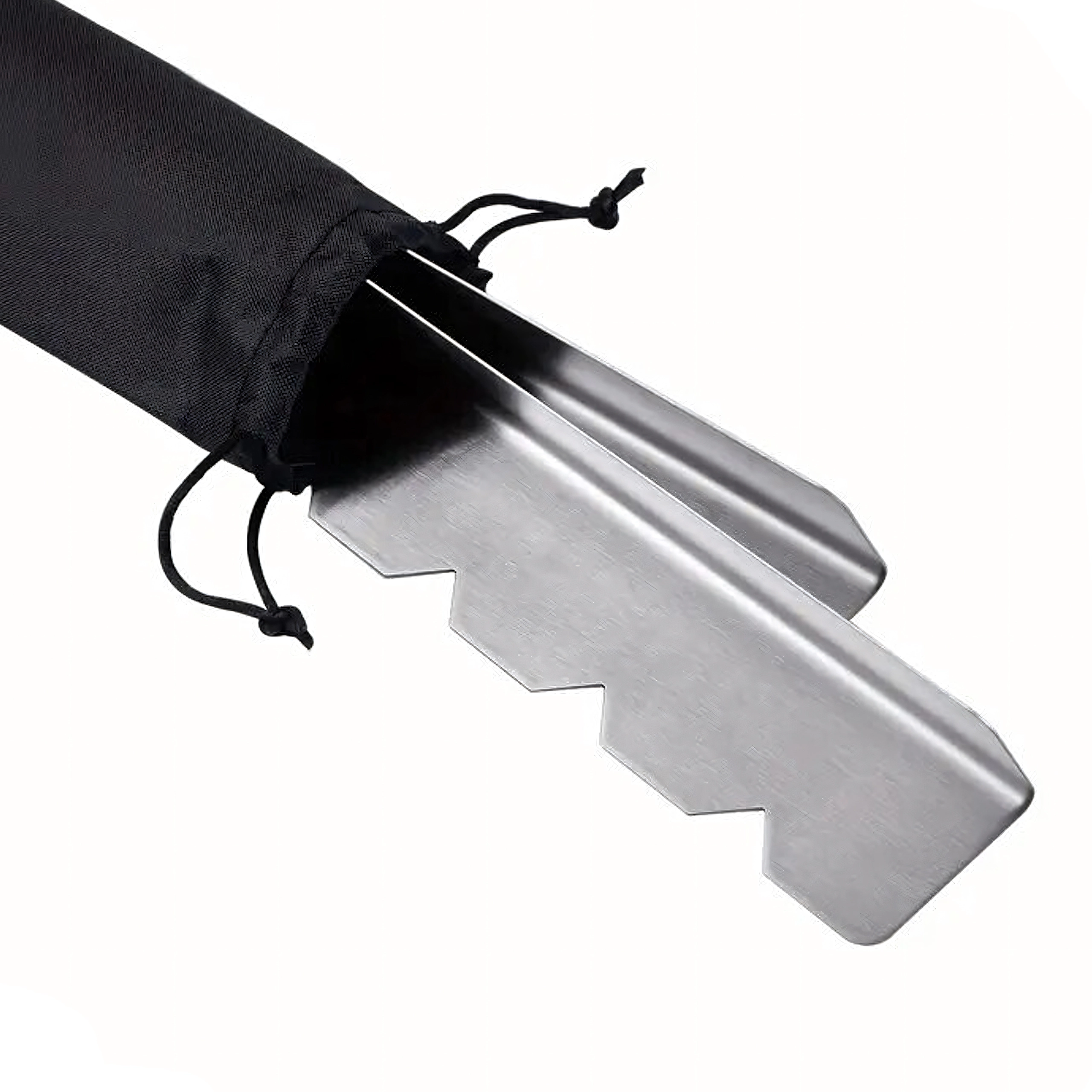 A praktikus fülek a végeken megkönnyítik a kezelést és a forgatást, a tartós rozsdamentes acél pedig hosszú élettartamot és könnyű tisztítást biztosít. Grillezés után a teljes készlet strapabíró textil tokba tehető, amely elfér hátizsákban vagy fiókban.