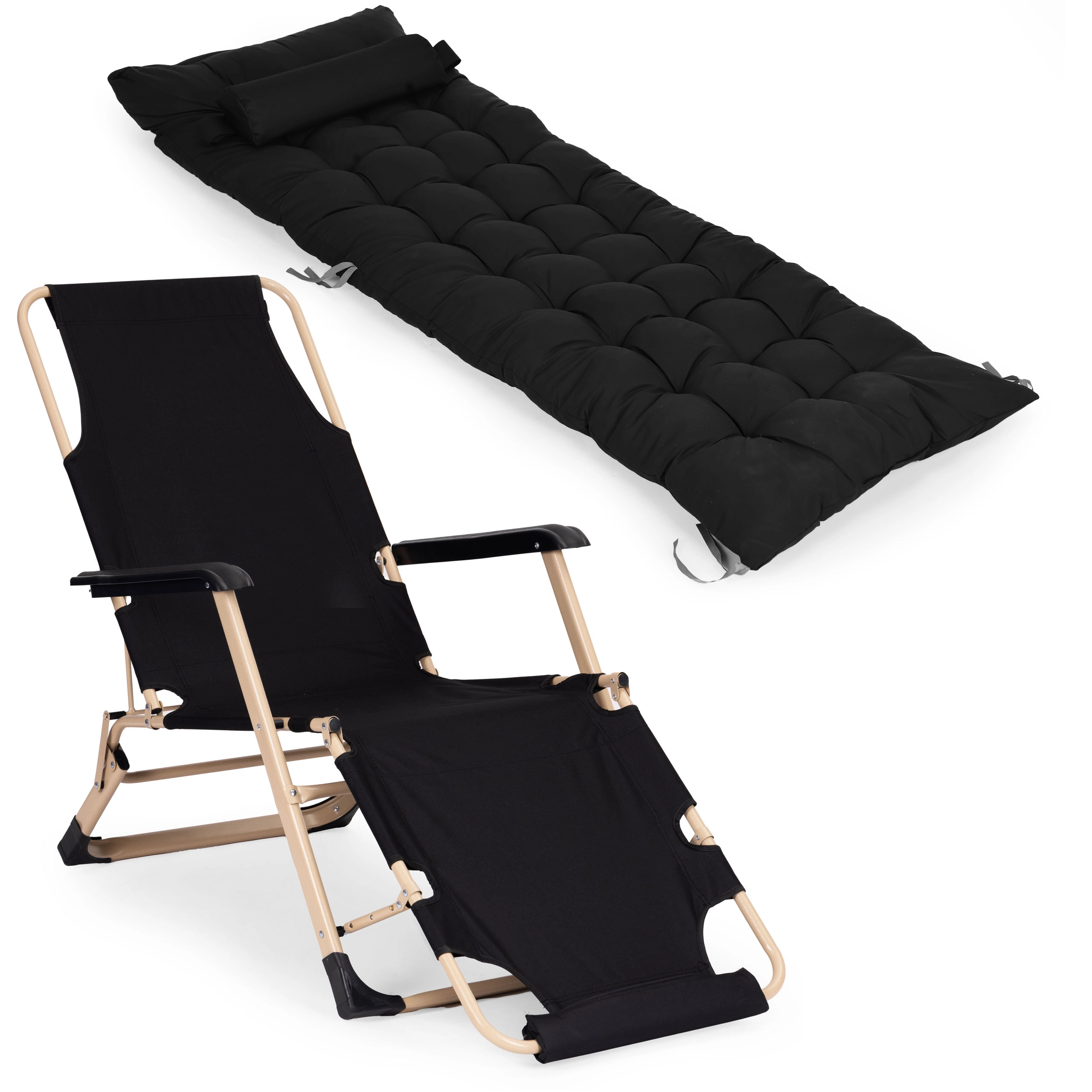 Élvezze a kényelmet bárhol a kertben, a teraszon vagy a strandon ezzel a sokoldalú 2 az 1-ben nyugággyal/fotellel. Kínál masszív, porszórt acél vázat, puha, steppelt párnát fejpárnával és 3 fokozatban állítható lábtámaszt. A stabilitást csúszásgátló végződések biztosítják, az ellenálló anyagok nedvességállóak, és az egész nyugágy összecsukható kialakítású az egyszerű hordozás és tárolás érdekében. Teherbírás akár 150 kg.