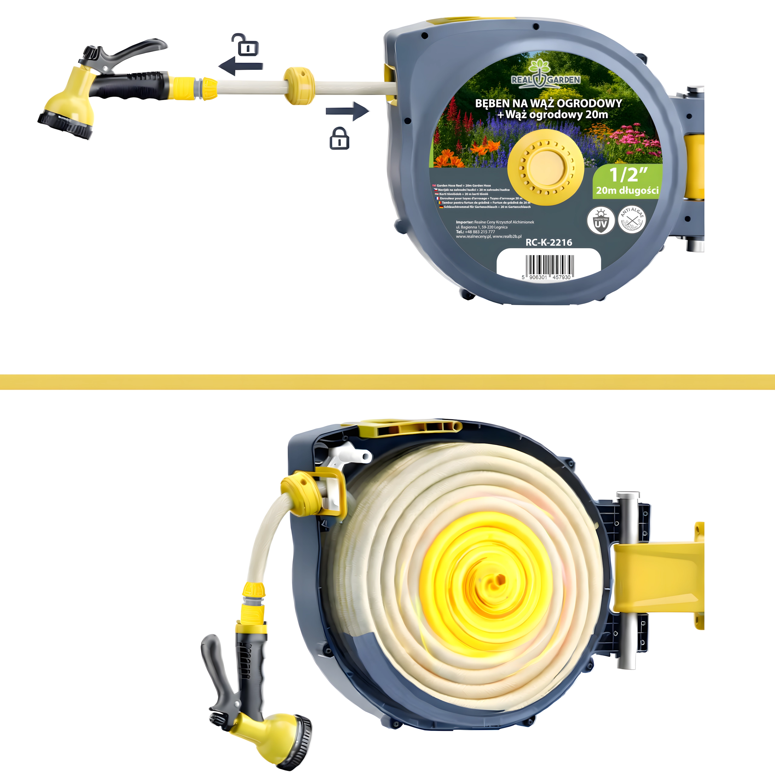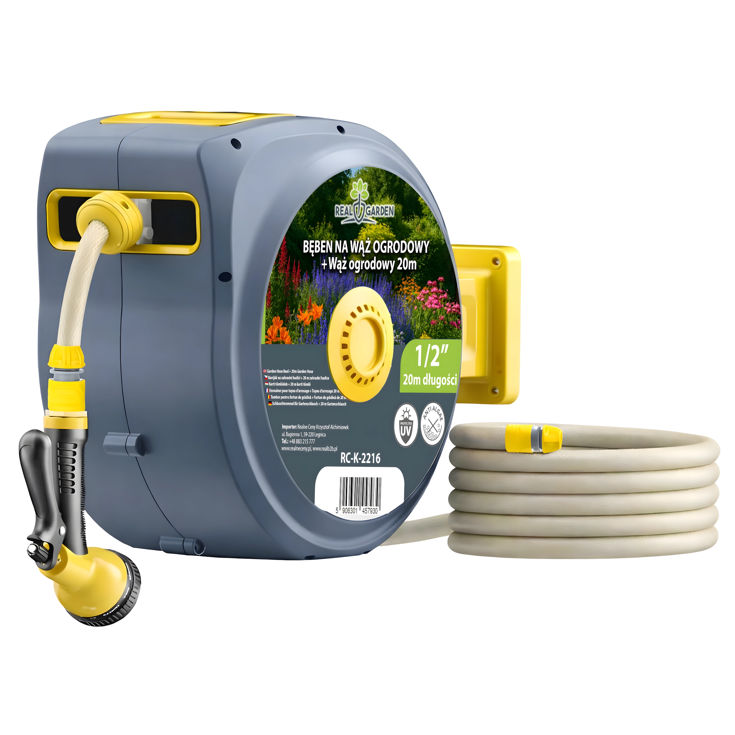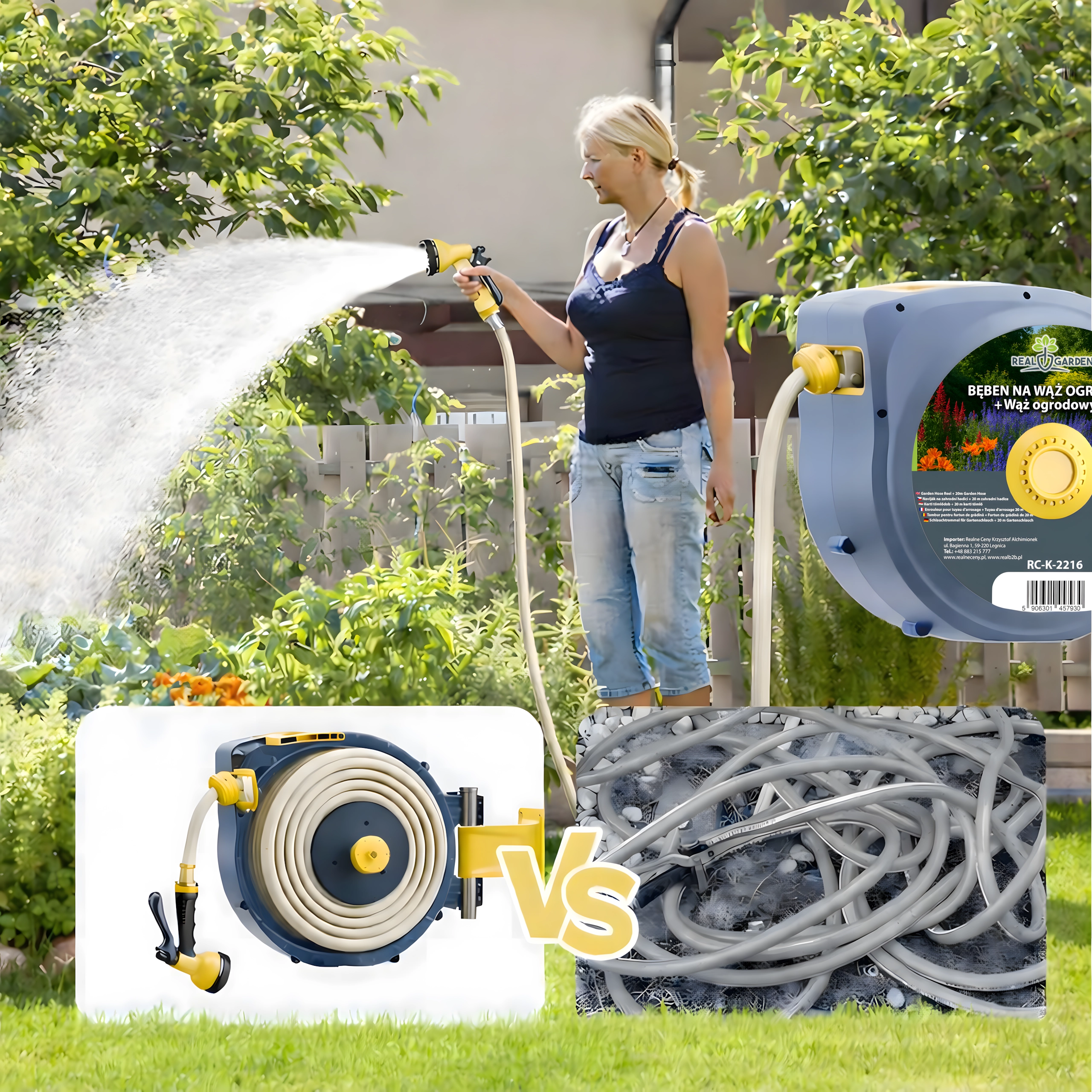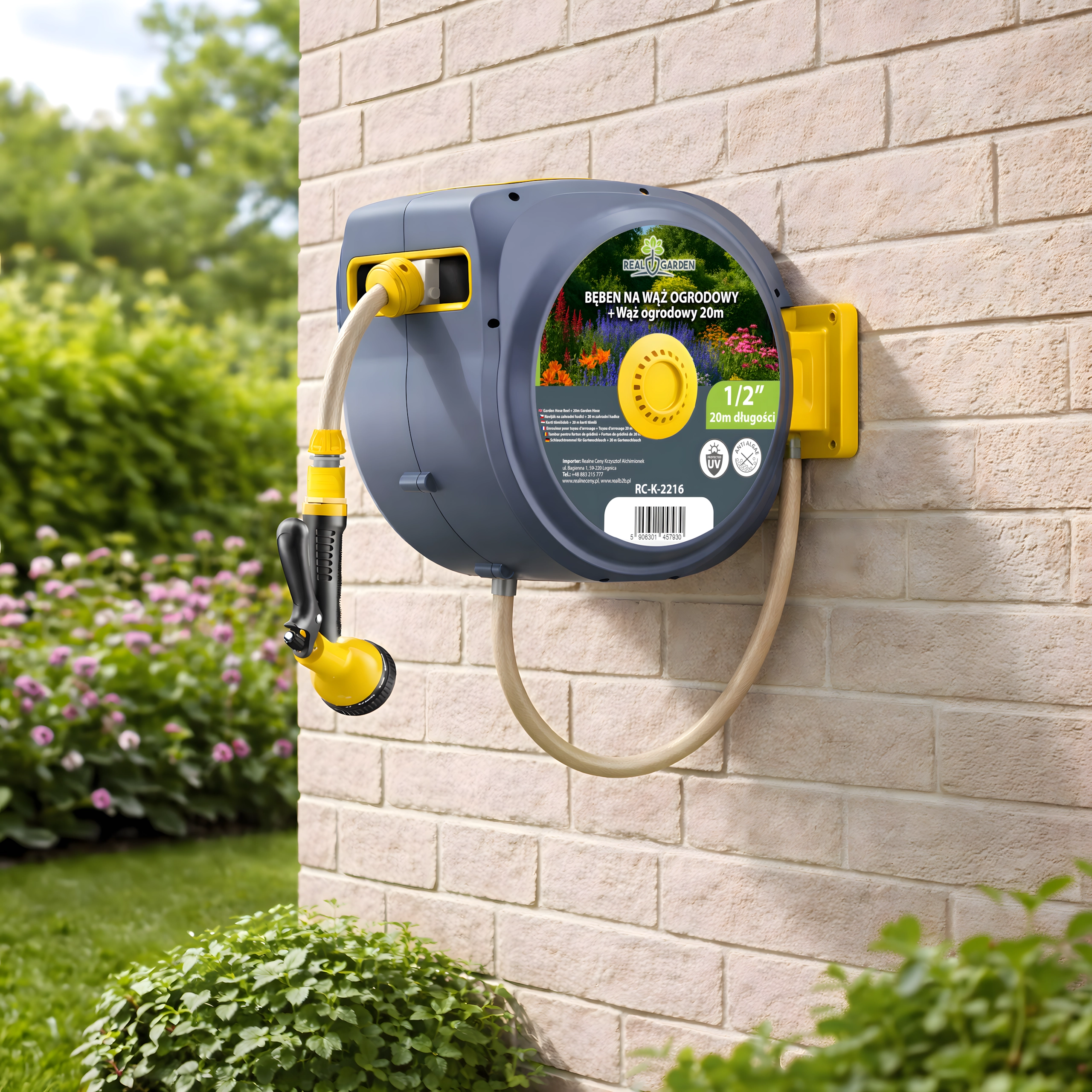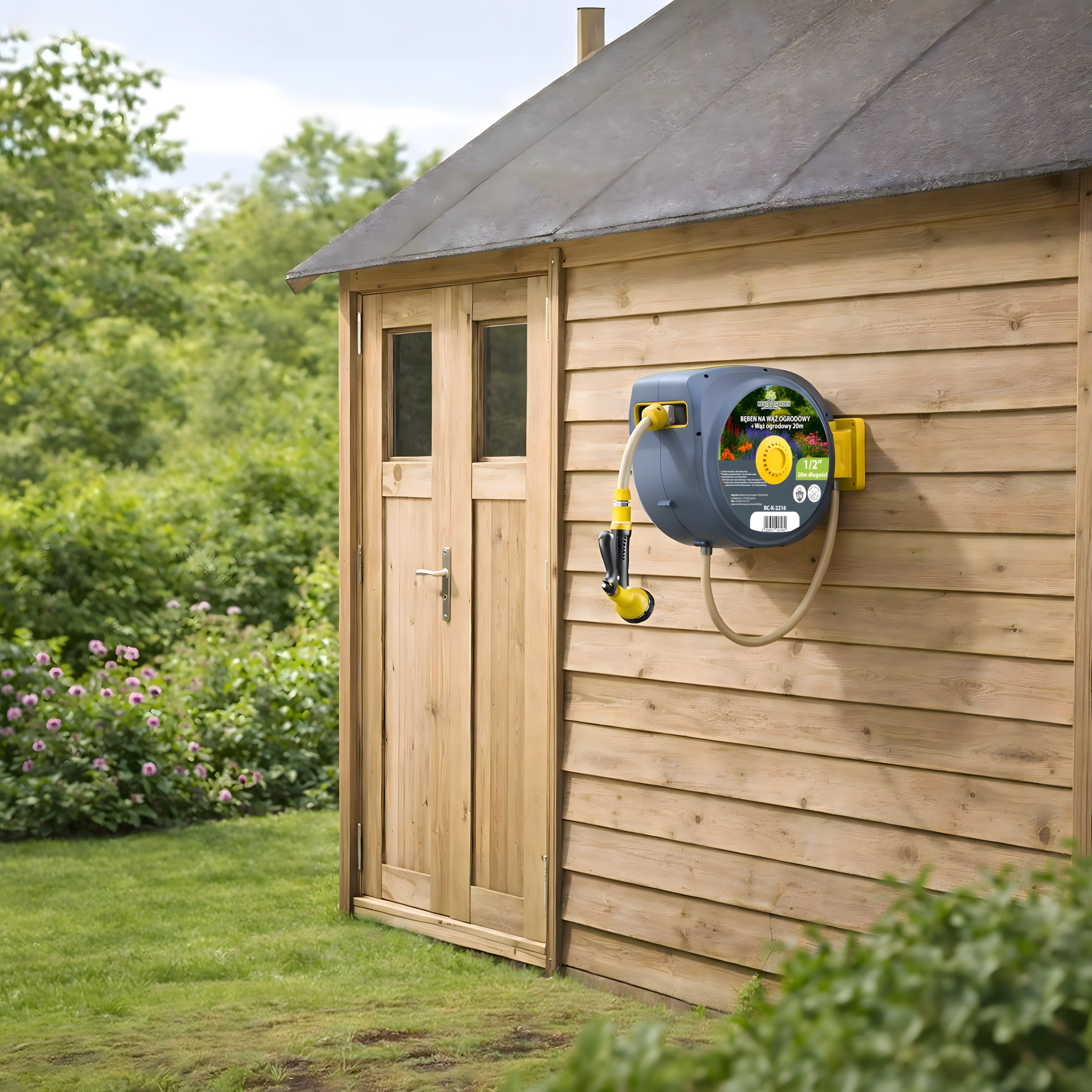 Ez a fali, automata tömlődob kényelmet és rendszert visz minden kertbe. Az integrált automatikus felcsévélő rendszer gyűrődés és csomók nélkül húzza vissza a tömlőt, míg a forgatható tartókonzol pontosan oda irányítja a tömlőt, ahol szükség van rá. A csomag része egy 20 m-es, 1/2"-os tömlő és egy univerzális, több üzemmódú szórópisztoly a finom permettől a nagy erejű sugárig.