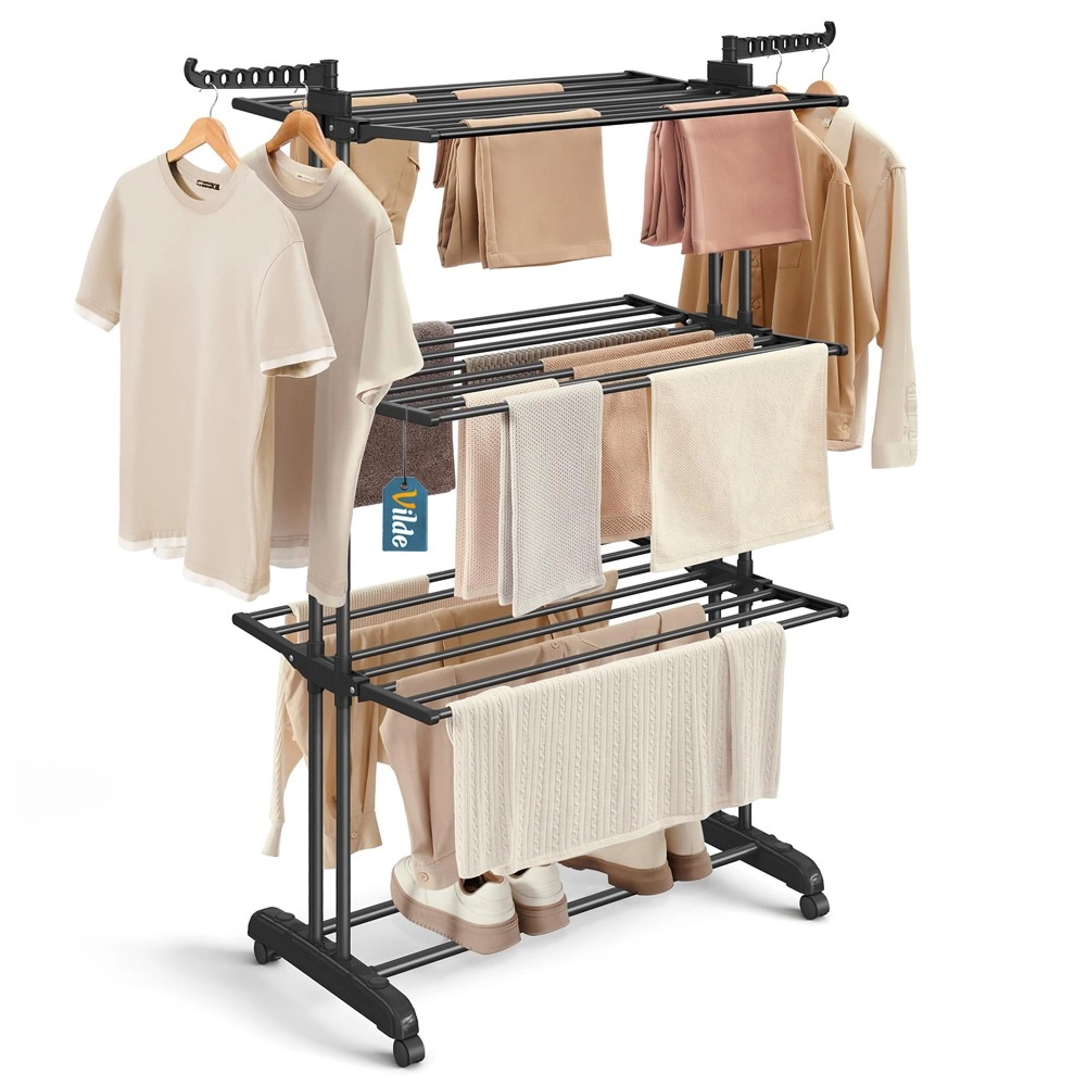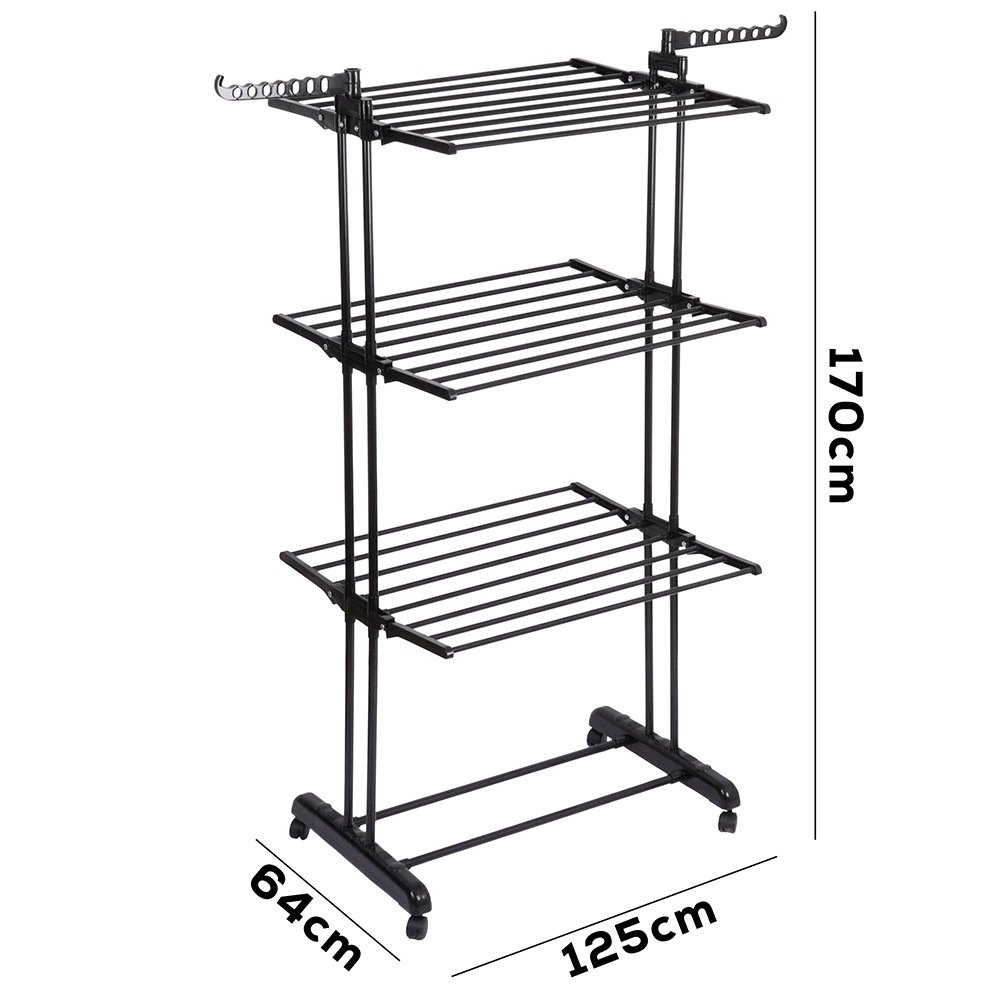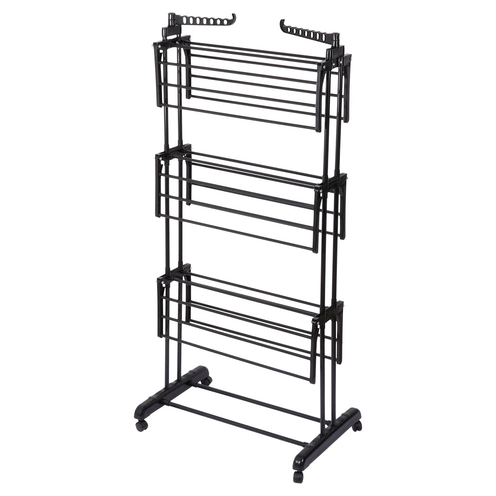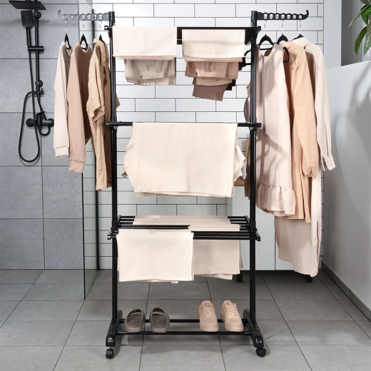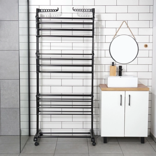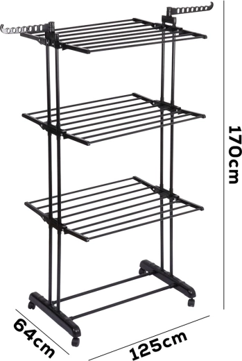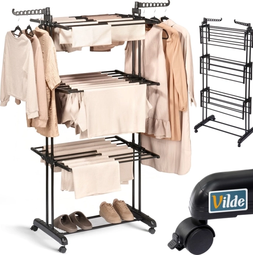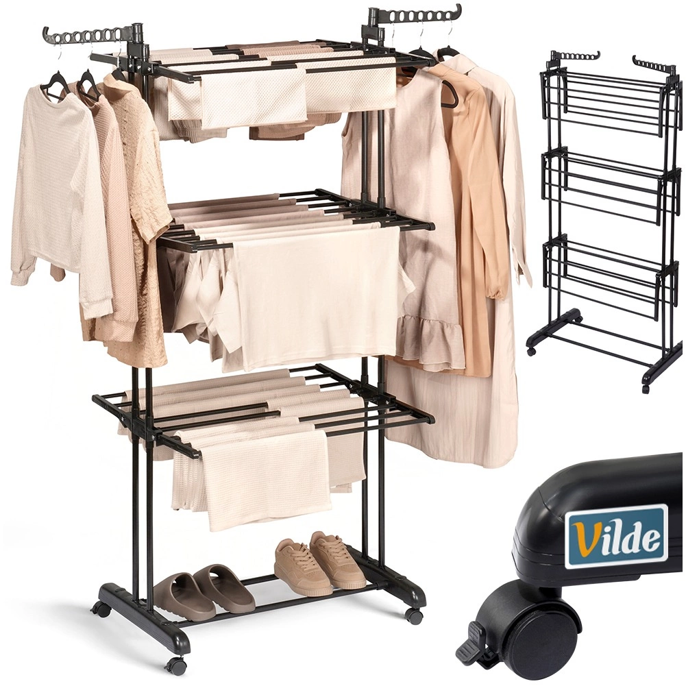 Praktikus, háromszintes ruhaszárító masszív, fekete színű fémvázzal, amely akár 24 m szárítófelületet, 25 kg teherbírást és kényelmes, fékezhető kerekeket kínál. A függőleges kialakításnak köszönhetően helytakarékos, lehajtható szárnyakkal, oldalsó vállfataró karokkal (14 hely) és alsó polccal cipők számára rendelkezik – ideális lakásba, erkélyre és teraszra.