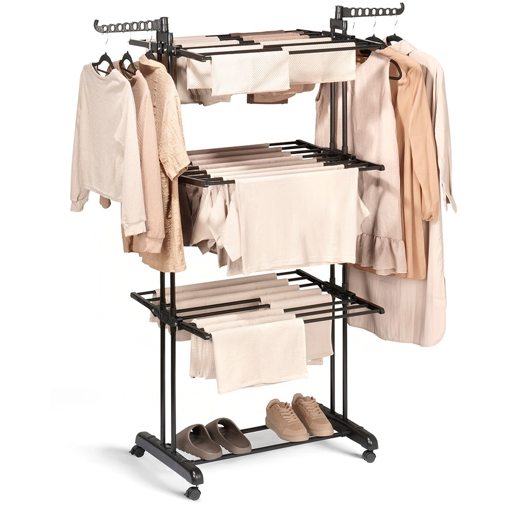 Az oldalsó karok 14 pozíciót kínálnak vállfáknak, az alsó polc pedig ideális cipők vagy kisebb textíliák szárításához.